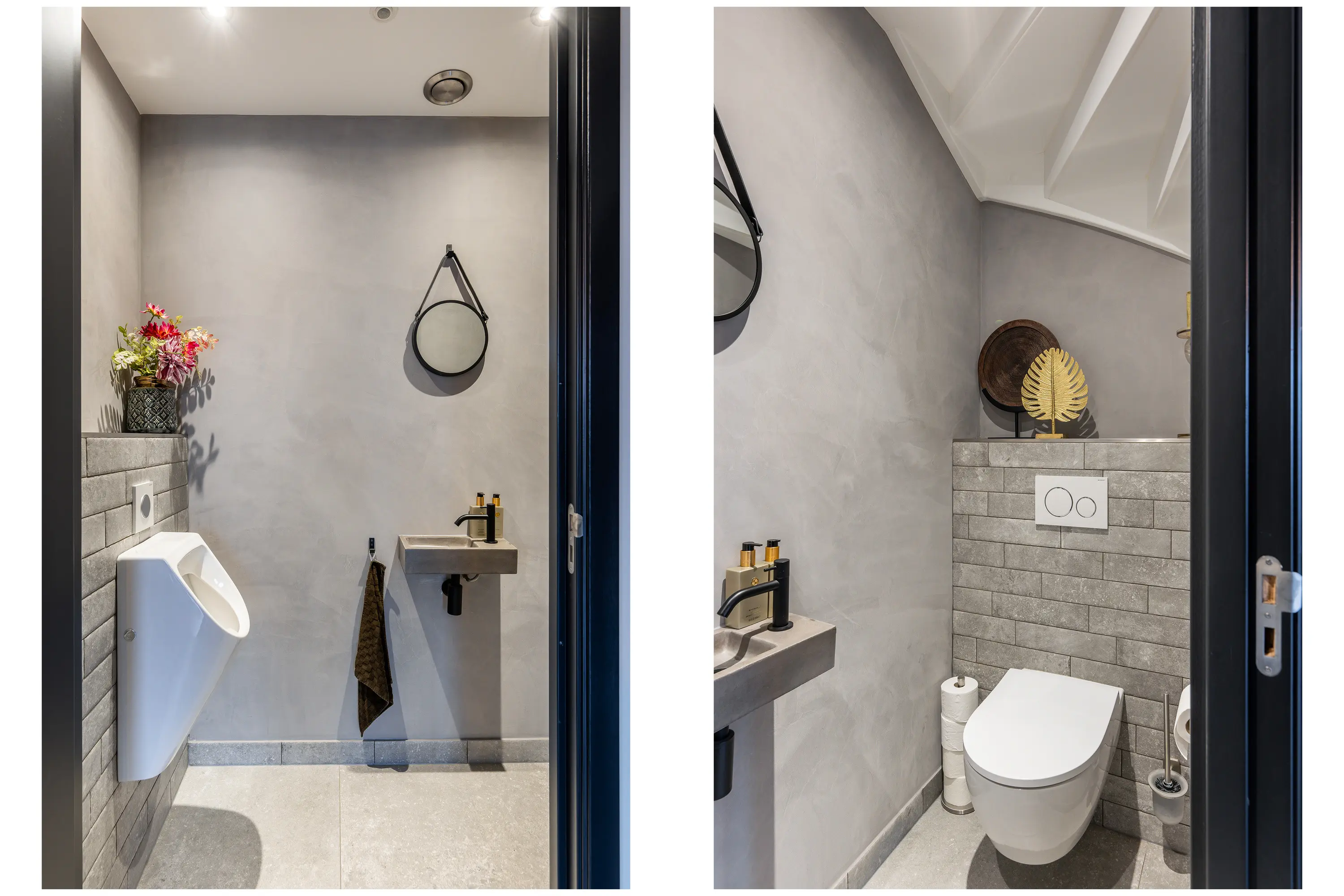 Terug in de hal bevindt zich aan de achterzijde het separaat toilet, voorzien van een urinoir, fontein en standaard toilet. Verder is er een praktische trapkast voor extra bergruimte en bevindt de trap naar de eerste verdieping zich aan de rechterzijde van de hal.