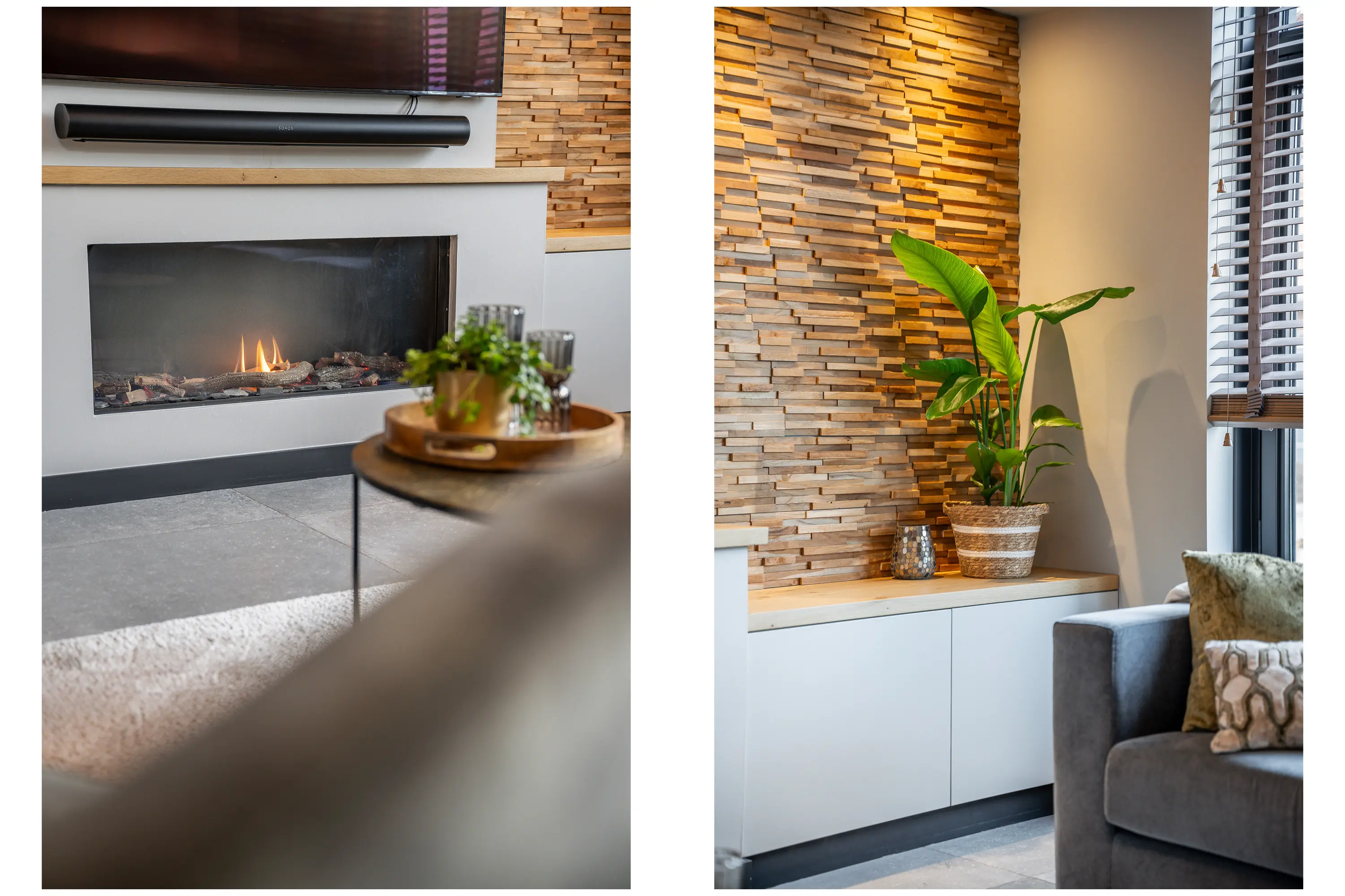 De woonkamer is royaal opgezet en ingedeeld met aan de voorzijde een sfeervolle zithoek. De ruimte is voorzien van plavuizen met vloerverwarming, wat bijdraagt aan een aangenaam comfort. Onder de tv bevindt zich een moderne gas haard, wat zorgt voor een warme en stijlvolle uitstraling. De grote raampartij aan de voorzijde zorgt voor veel natuurlijk lichtinval, waarbij de Luxaflex u in staat stelt het licht perfect te reguleren.