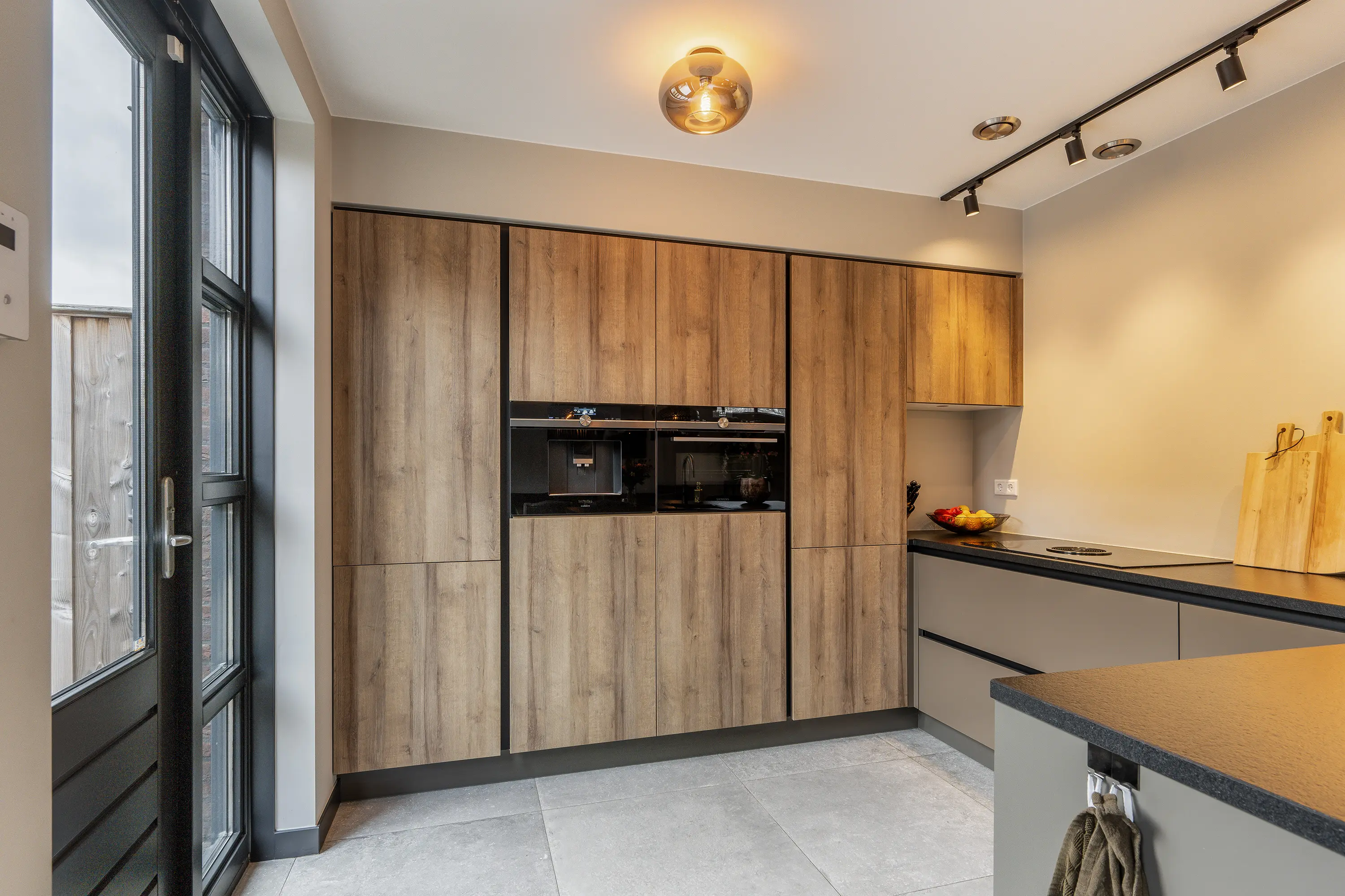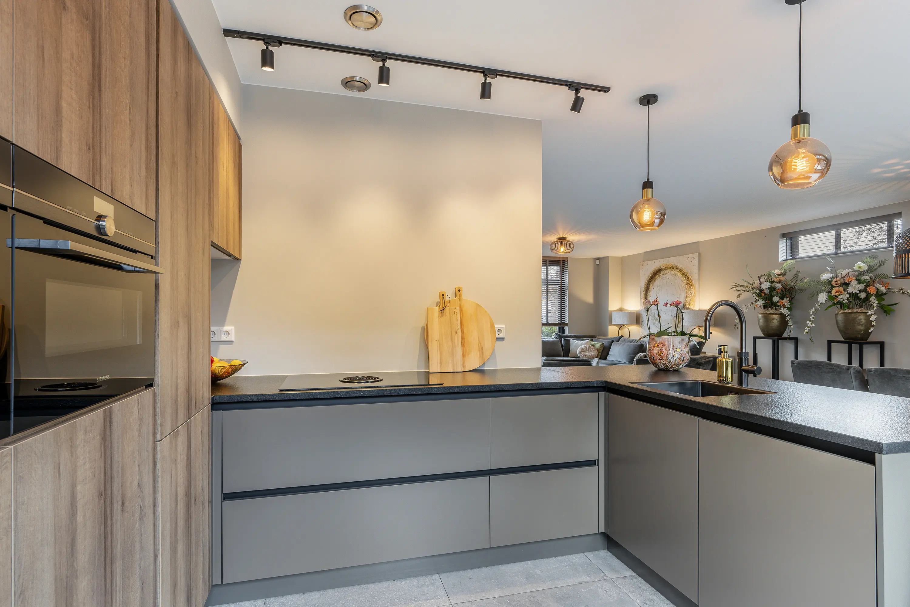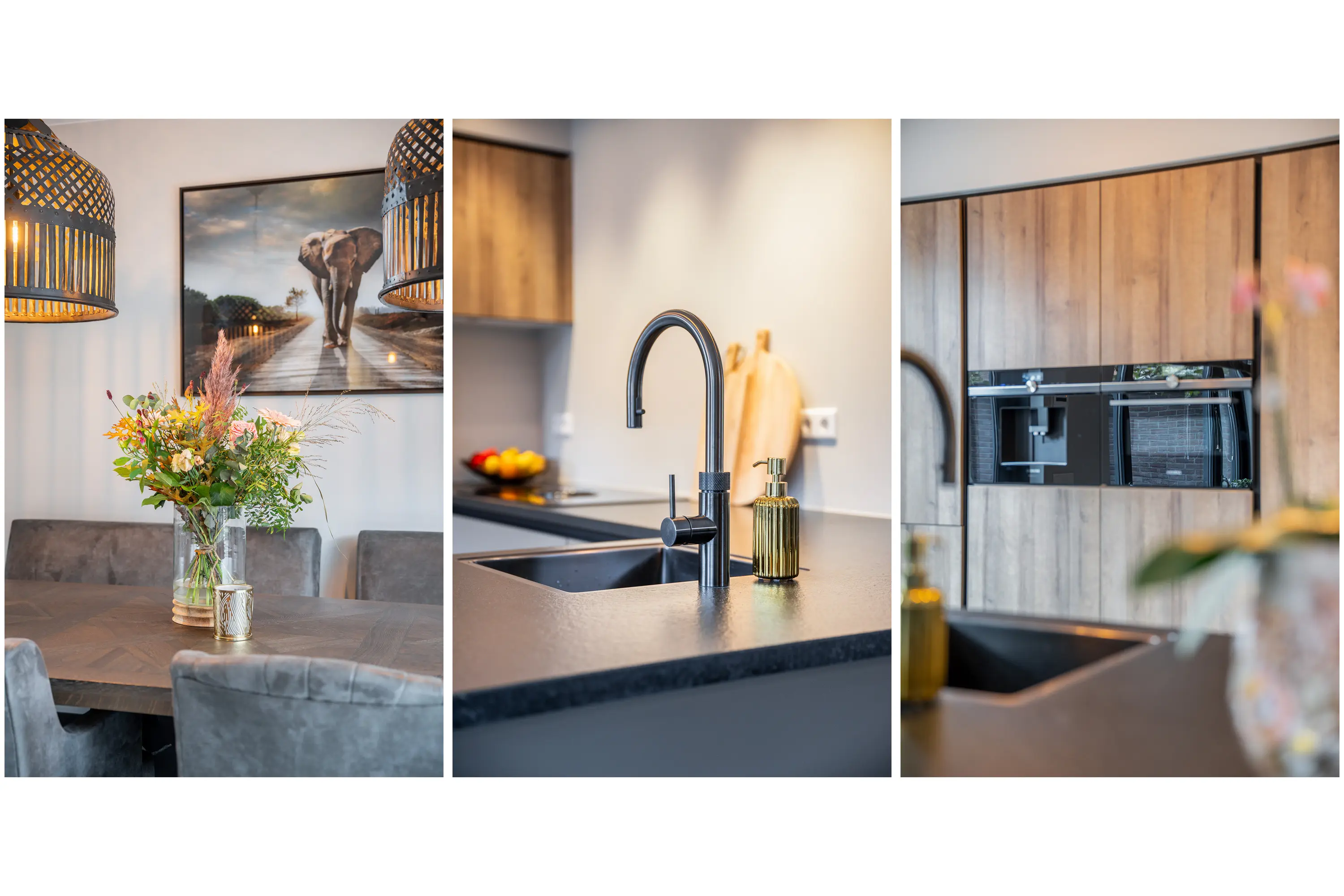- Open keuken (vernieuwd in 2019) met kookeiland, zwart werkblad, houtlook kasten en diverse inbouwapparatuur: inductiekookplaat, Quooker, wijnkoeler, koelkast, vriezer, combi-oven, vaatwasser en ingebouwd koffiezetapparaat;