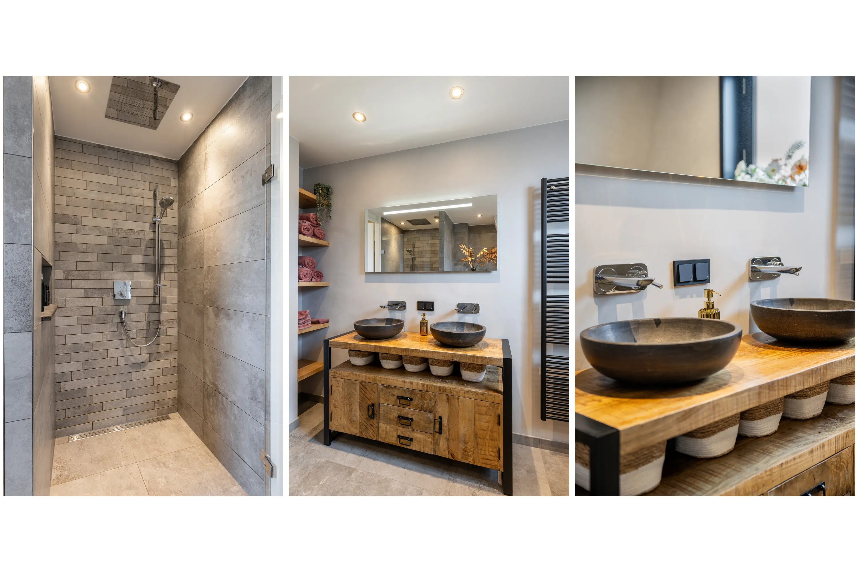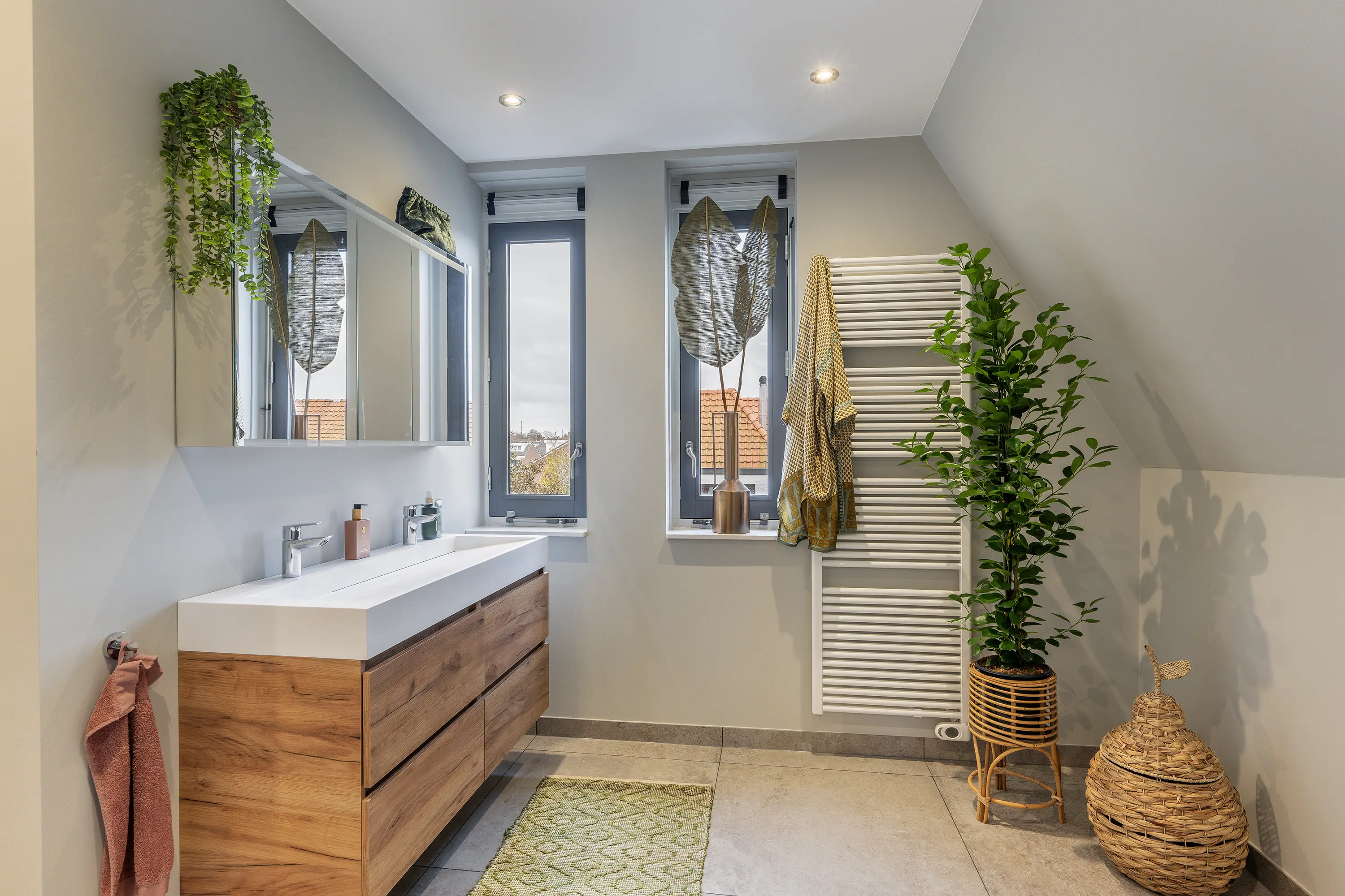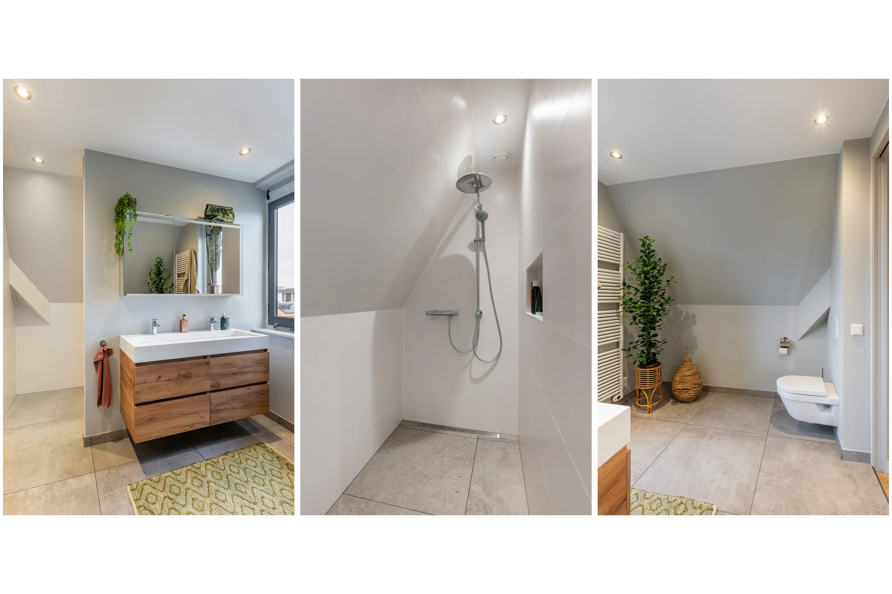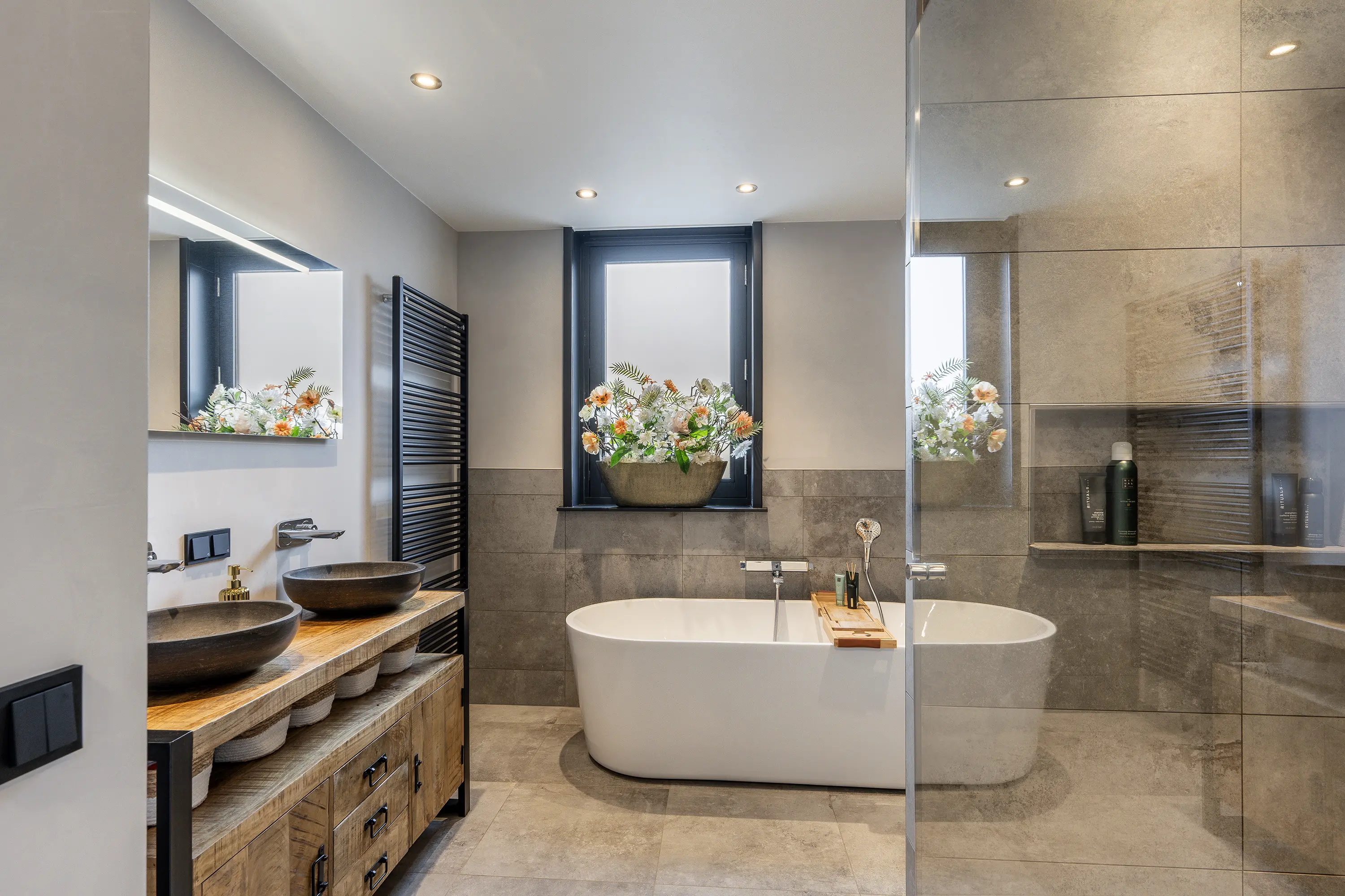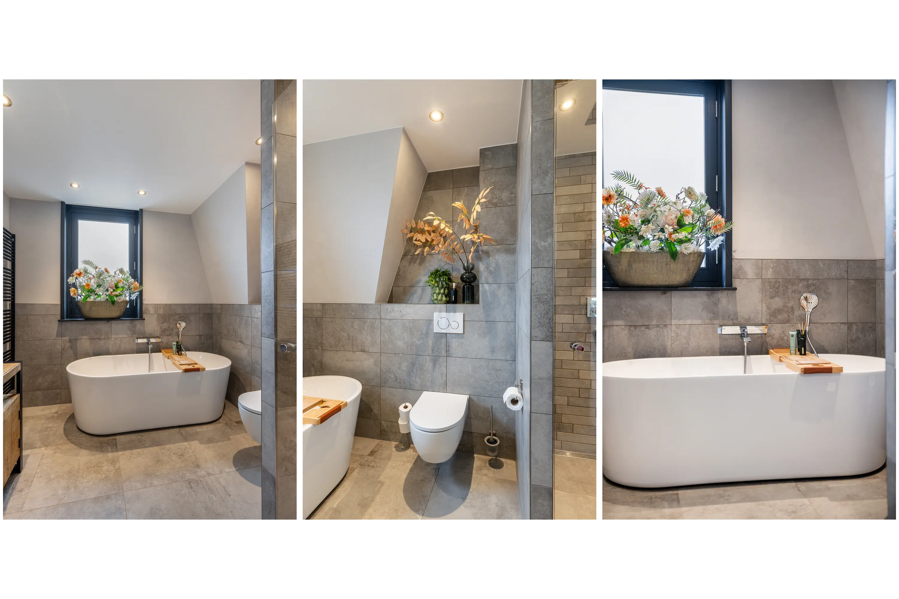 Aan de achterzijde van de etage bevindt zich de moderne badkamer. Deze is uitgerust met een vrijstaand ligbad, een ruime inloopdouche, een dubbel wastafelmeubel en een toilet. Daarnaast zorgt het aanwezige raam voor prettige natuurlijke ventilatie.