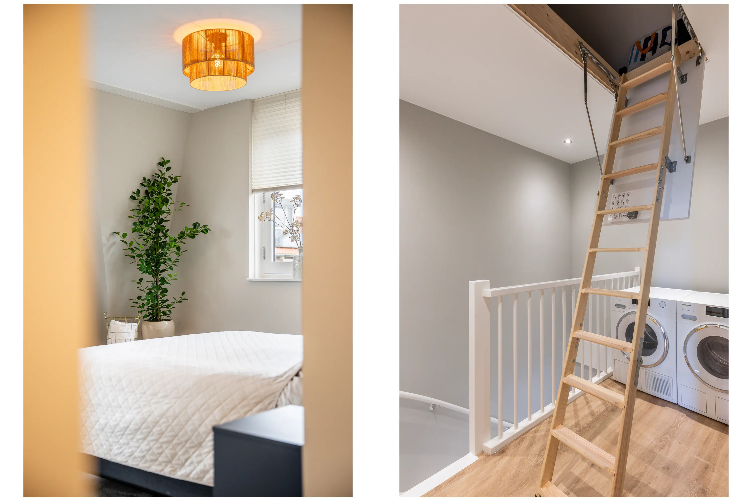 In het plafond bevindt zich een vlizotrap die toegang geeft tot de vliering boven deze verdieping. Deze ruimte is ideaal als extra bergruimte voor spullen die u niet dagelijks nodig heeft, zoals seizoensgebonden artikelen.