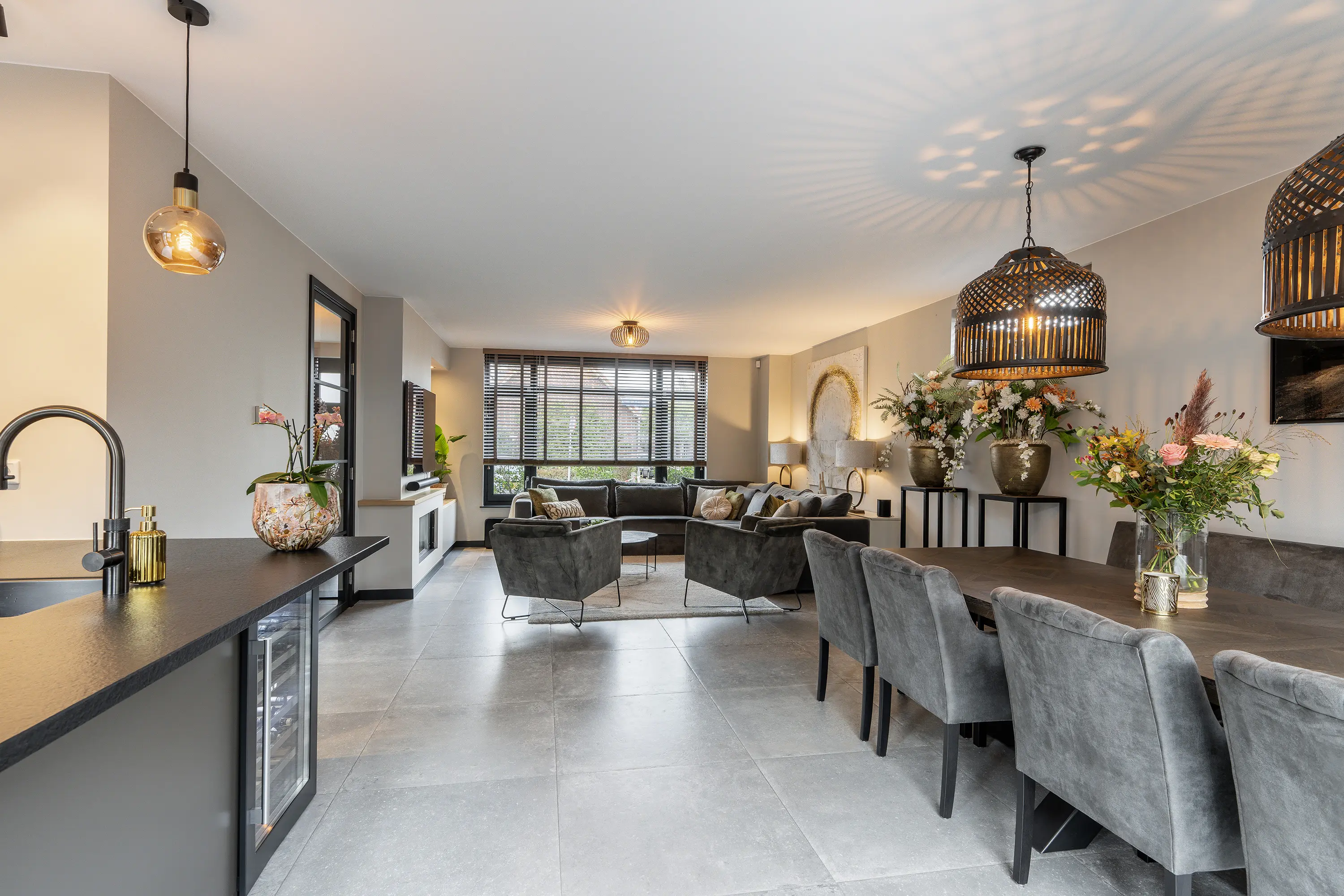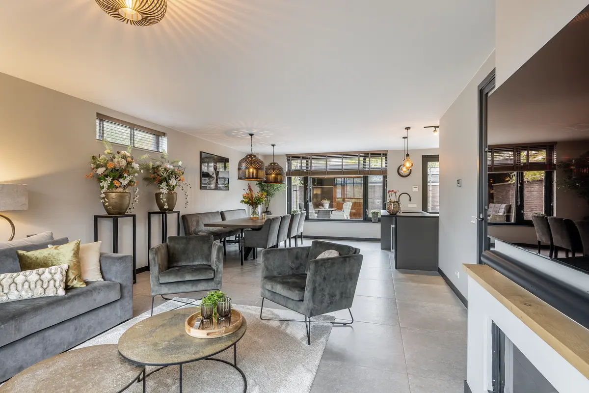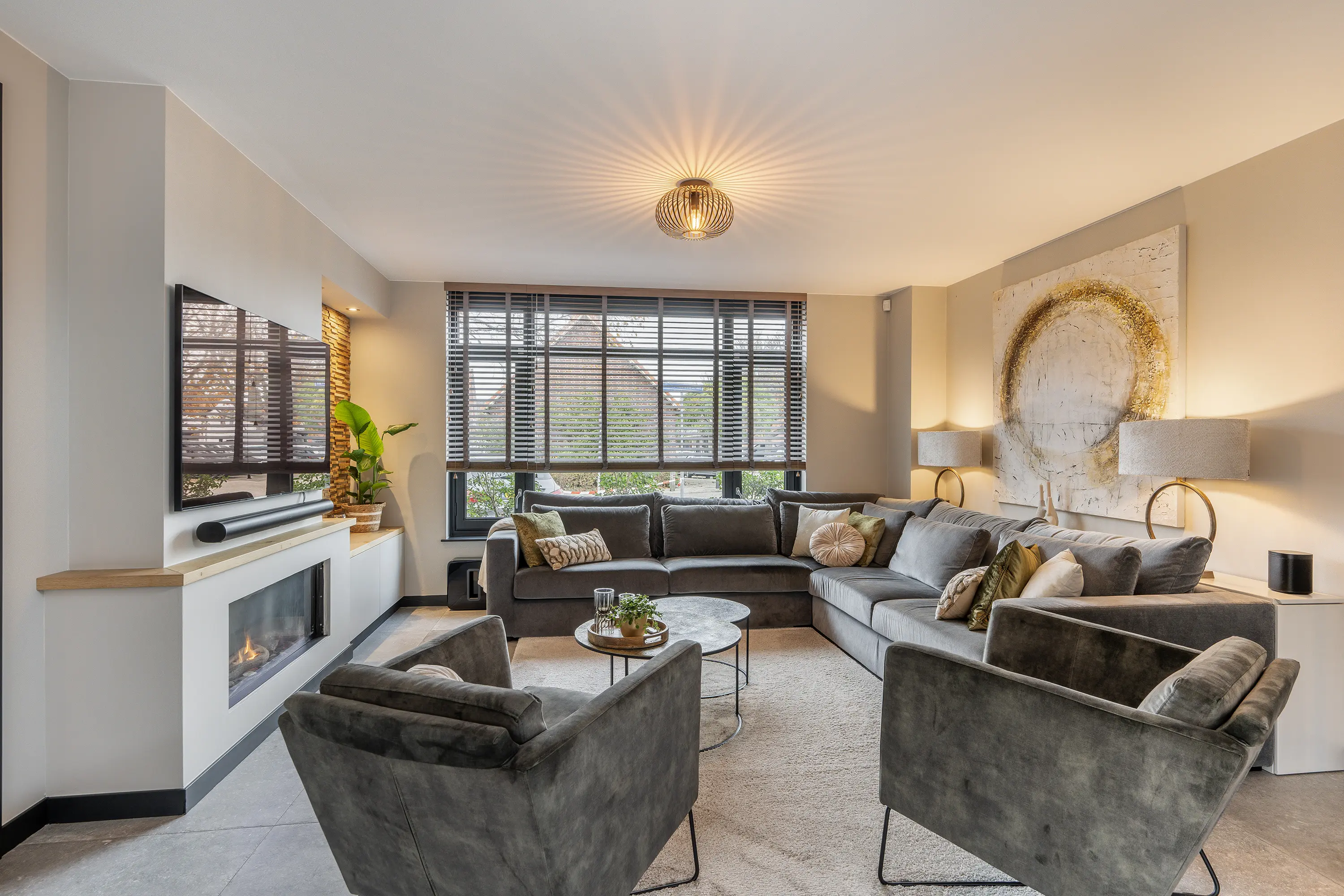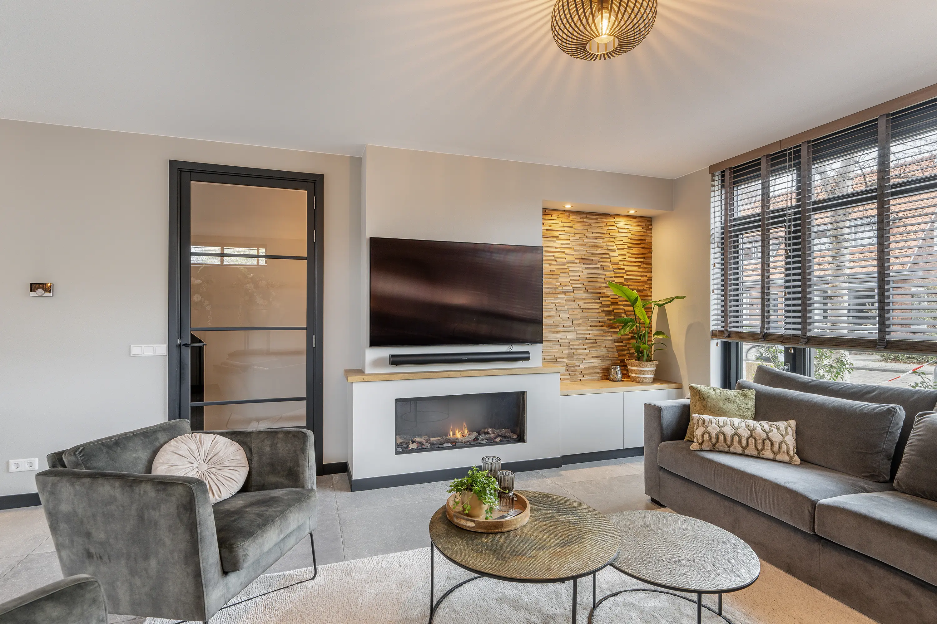 - Ruime woonkamer met veel natuurlijk licht, sfeervolle zithoek en moderne gashaard;