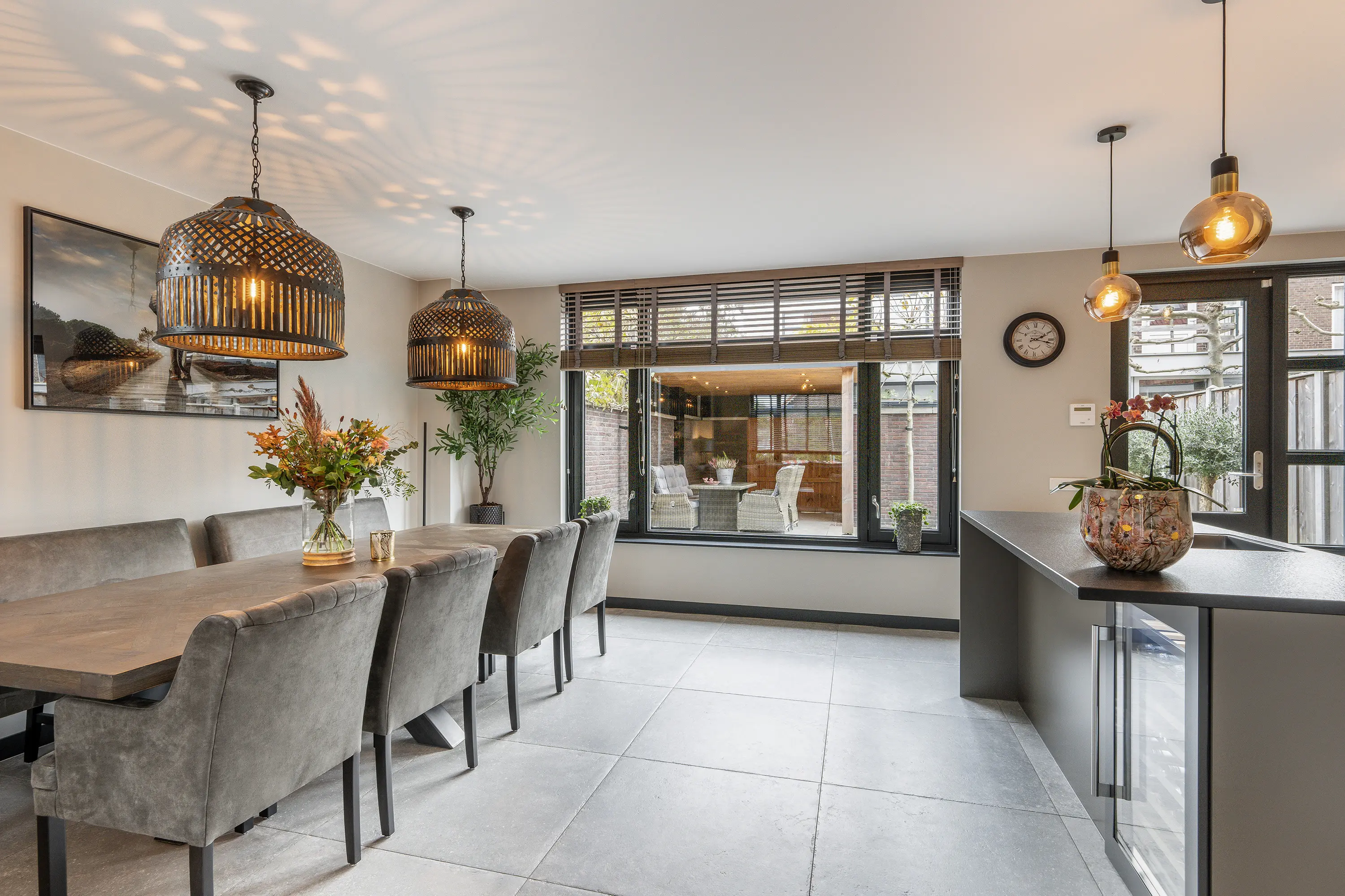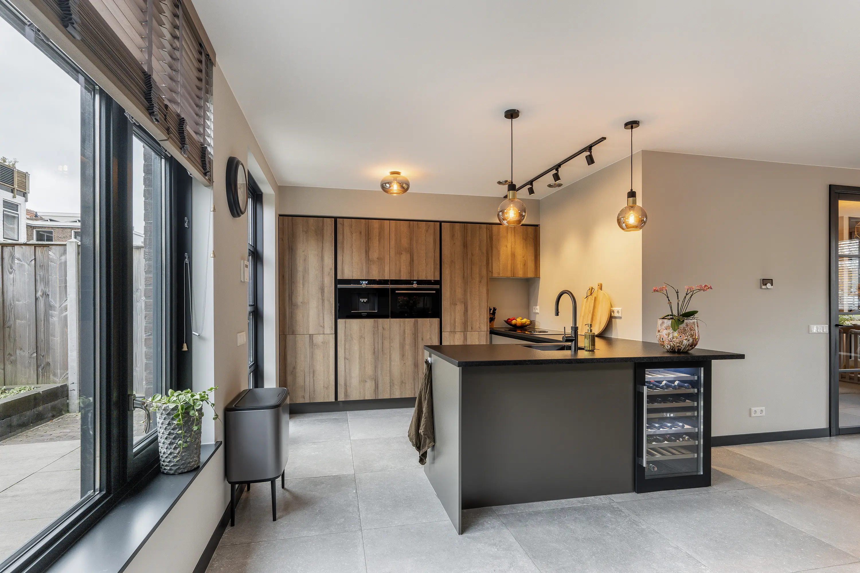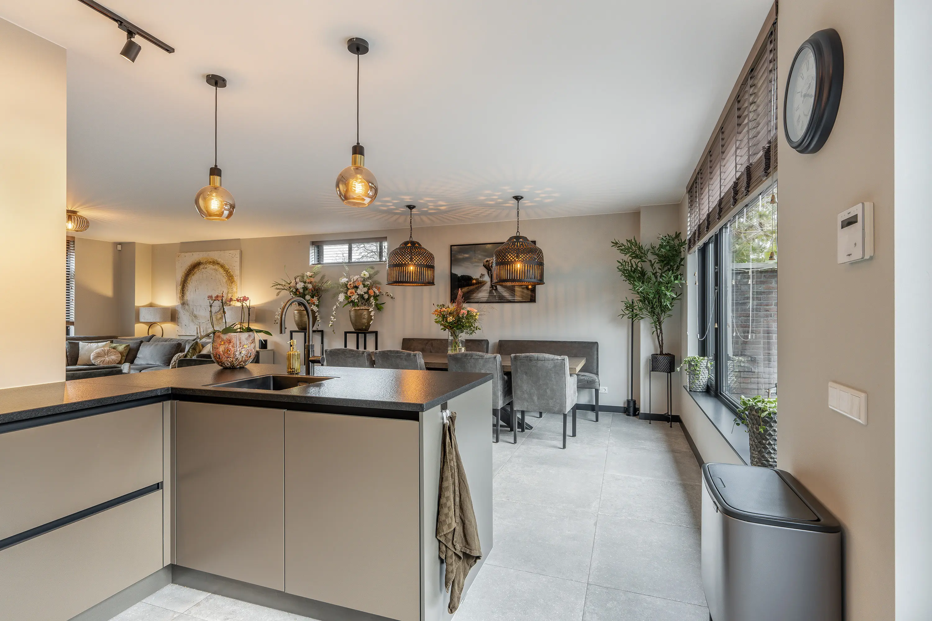 Aan de achterzijde van de woonkamer bevindt zich de eetkamer, die direct grenst aan de open keuken. De keuken, vernieuwd in 2019, is voorzien van een kookeiland met een net zwart werkblad en houtlook kasten, wat een moderne en sfeervolle uitstraling geeft. De keuken is uitgerust met diverse inbouwapparatuur, waaronder een inductiekookplaat, Quooker, wijnkoeler, Boretti klimaatkast, koelkast, vriezer, combi-oven, vaatwasser en een ingebouwd koffiezetapparaat. Vanuit de keuken heeft u direct toegang tot de achtertuin.