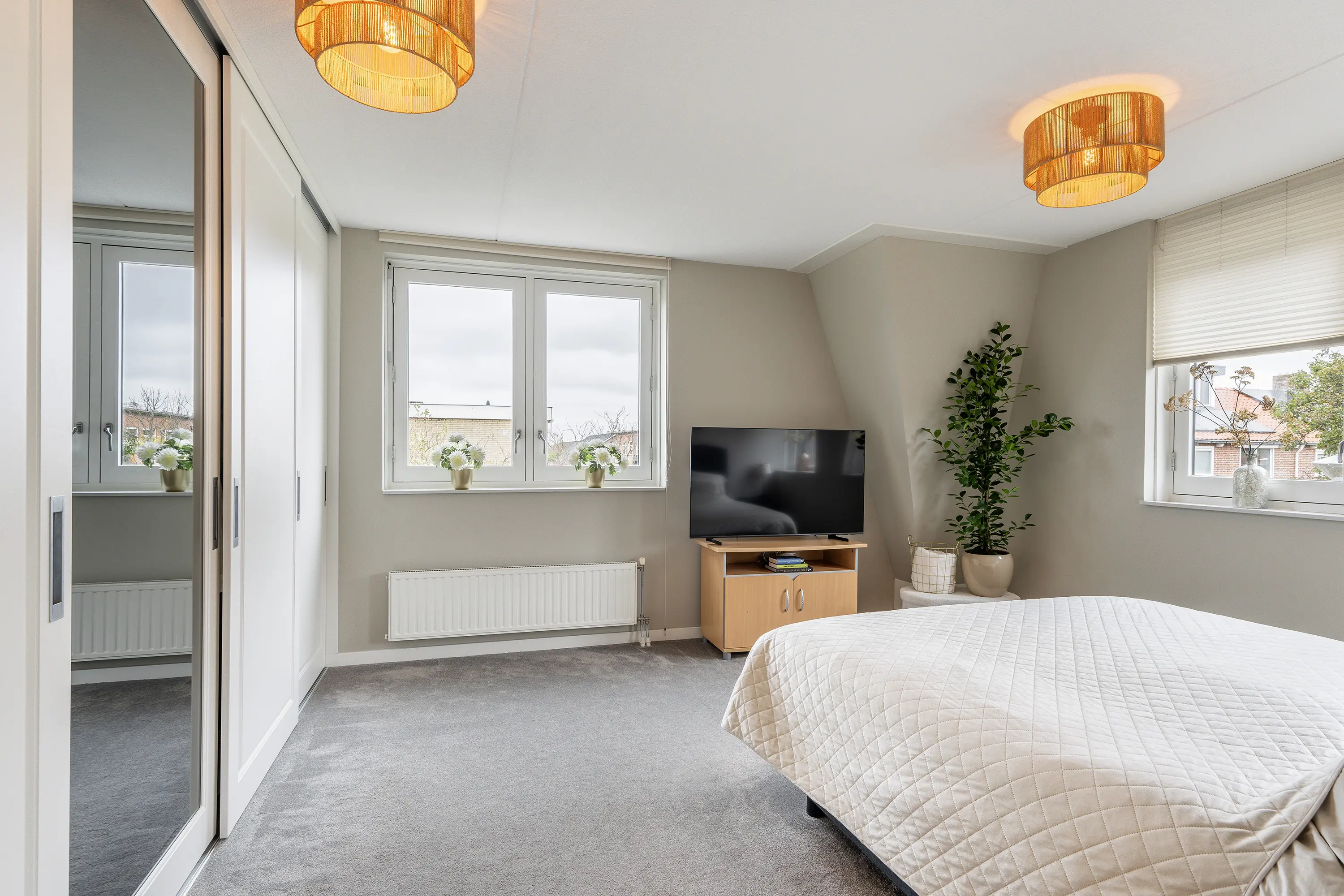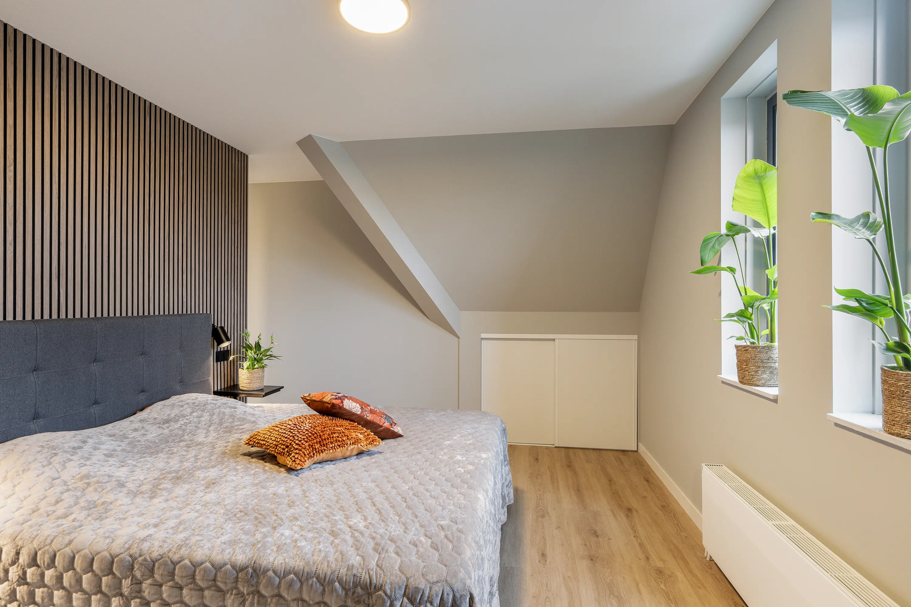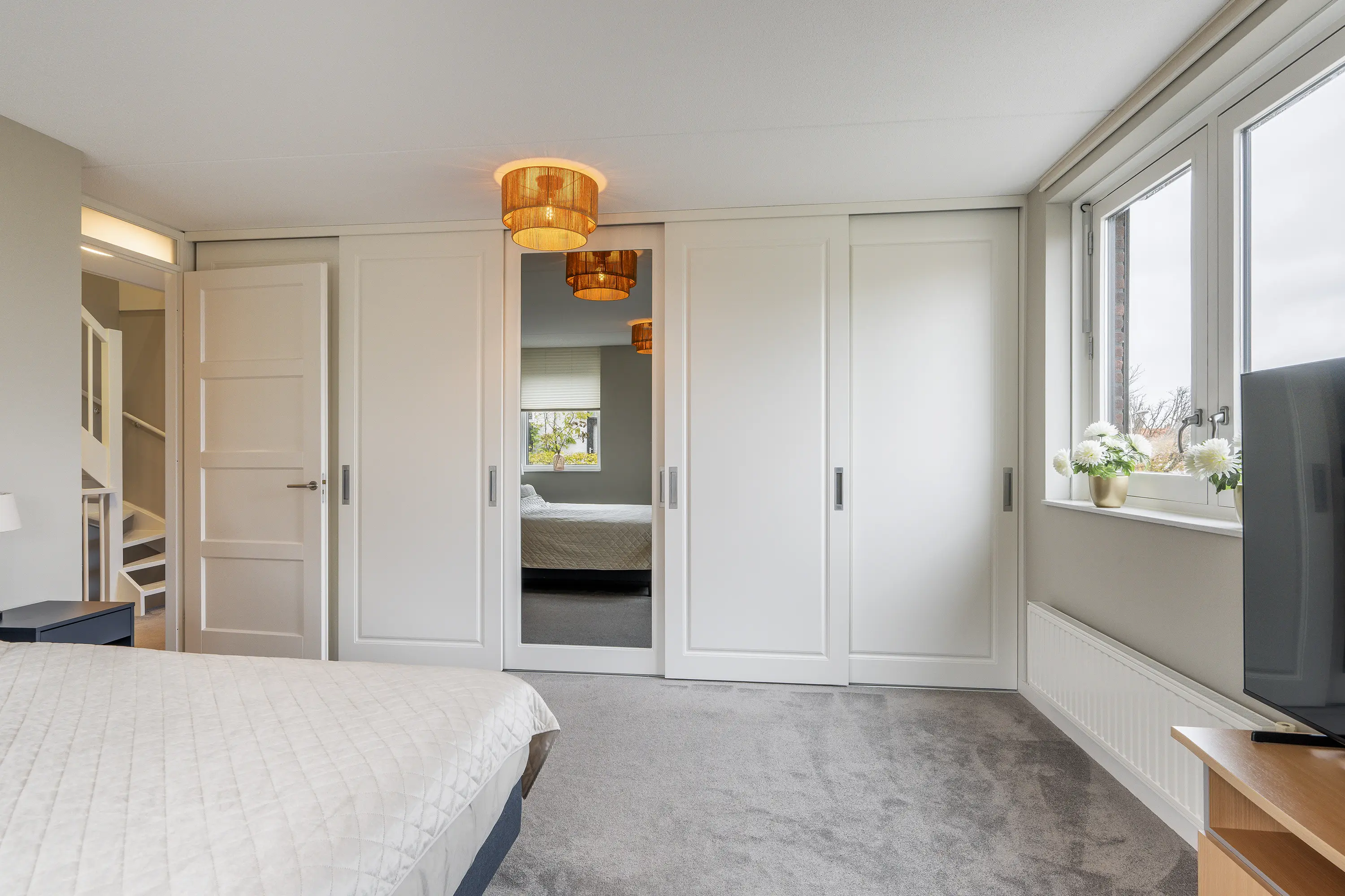 De eerste slaapkamer bevindt zich aan de achterzijde van de woning. Deze kamer beschikt over meerdere ramen, voorzien van rolluiken, wat zorgt voor veel natuurlijke lichtinval, en over een royale kastenwand die zich uitstrekt over de volledige breedte van de kamer.