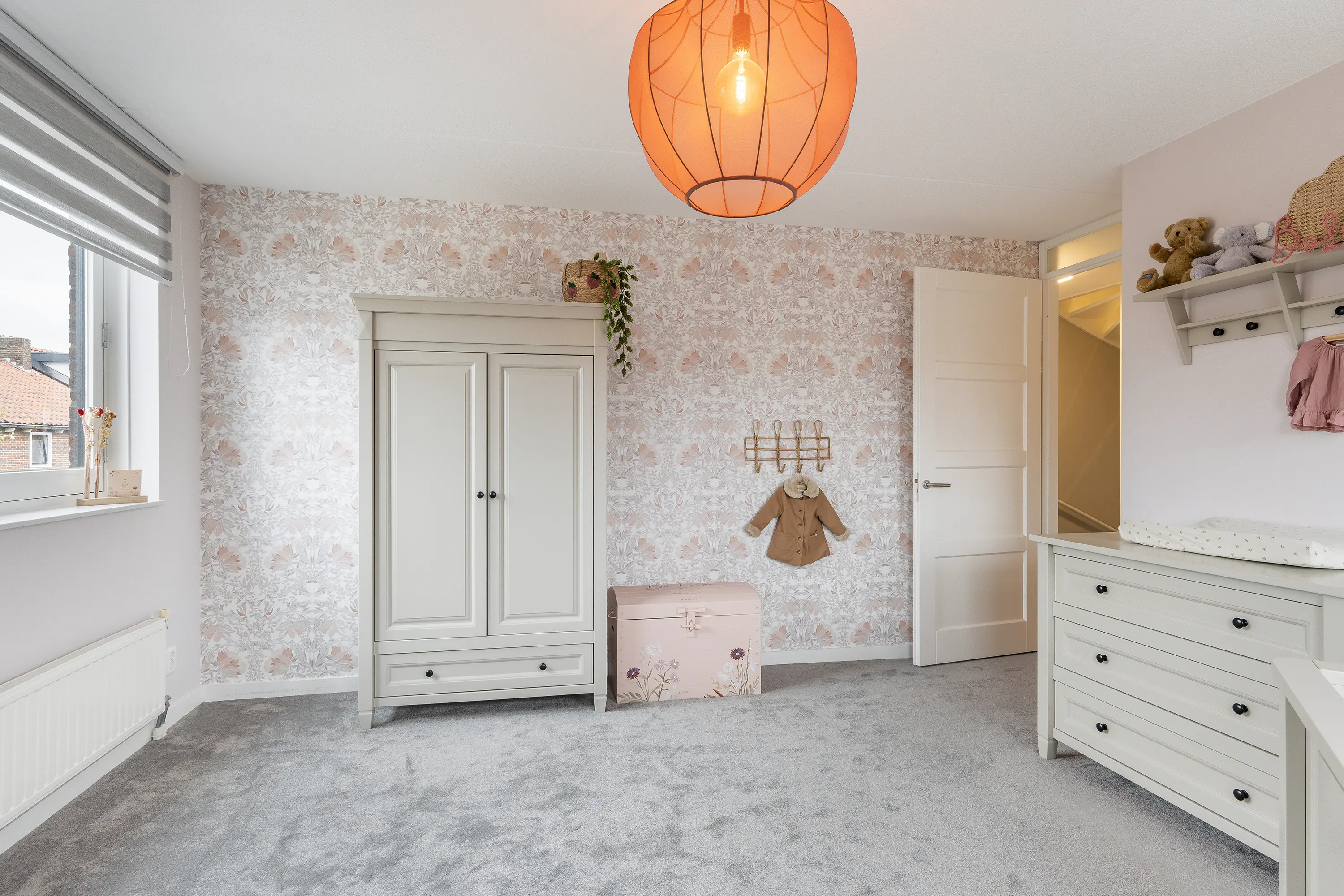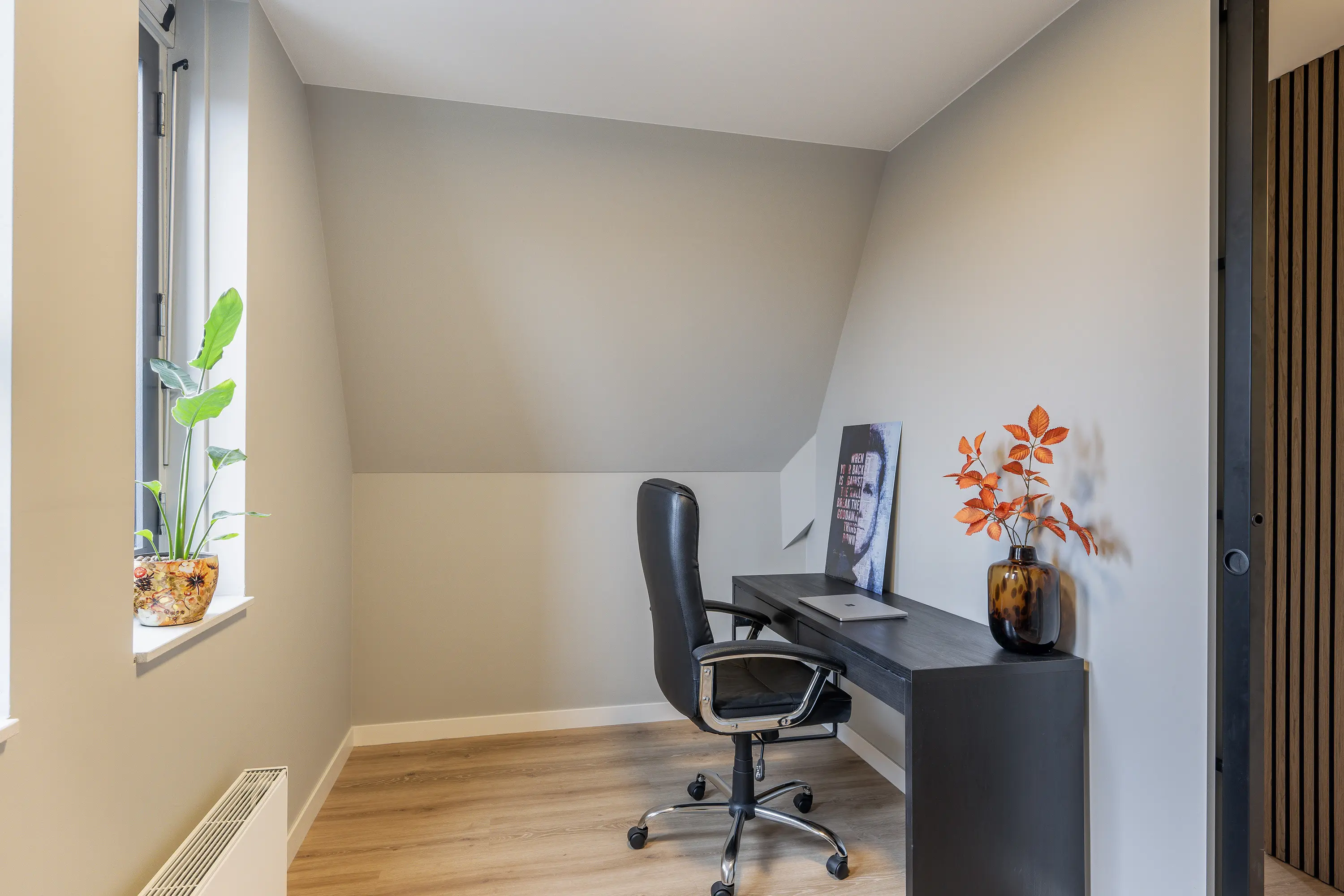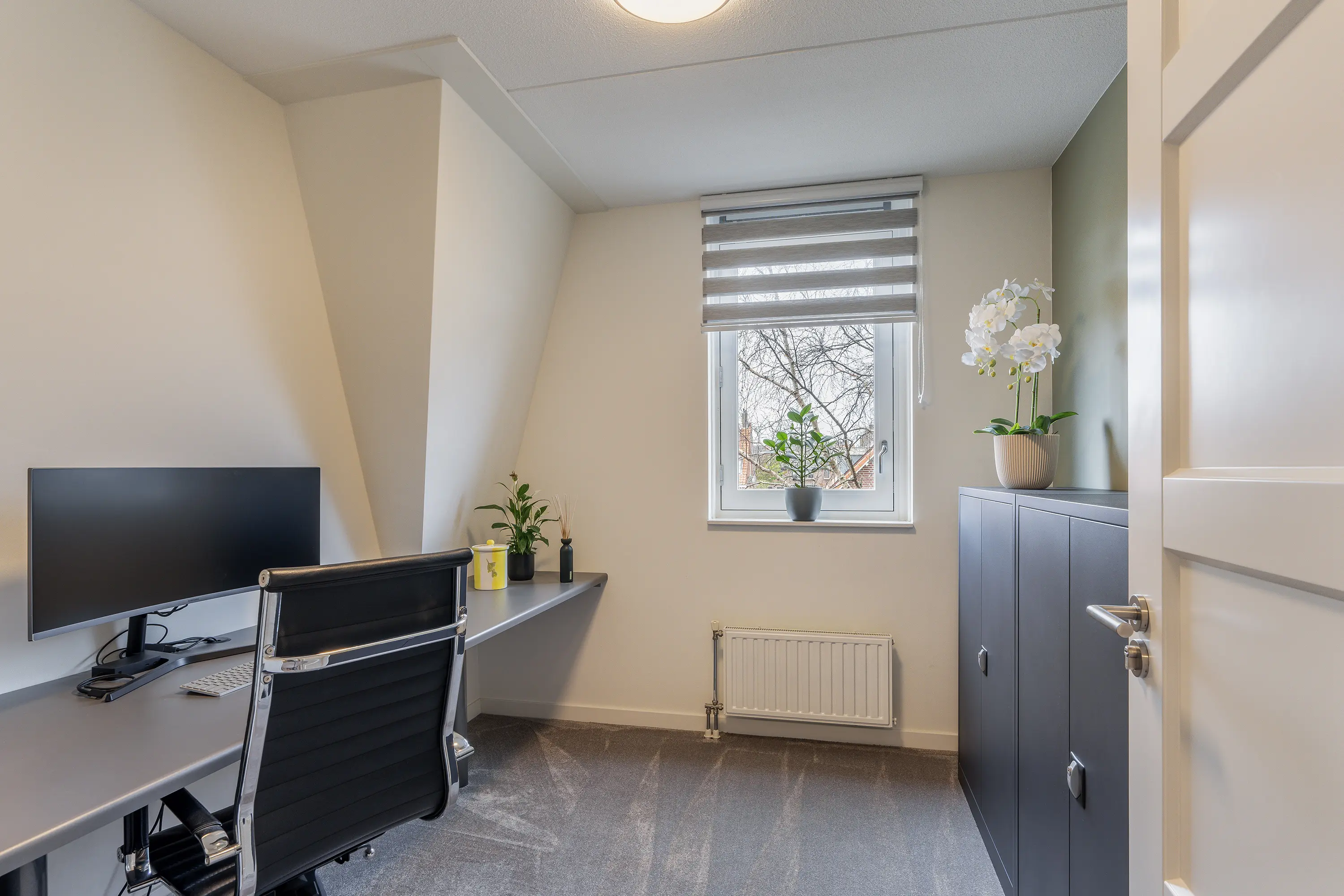 De overige twee slaapkamers liggen aan de voorzijde van de woning. De kamer aan de rechterzijde is momenteel ingericht als kinderkamer en is bijzonder ruim. Dankzij de drie ramen geniet ook deze kamer van veel daglicht. De derde (slaap)kamer wordt momenteel gebruikt als kantoor-/werkruimte. Deze kamer is iets compacter, maar leent zich uitstekend als extra slaapkamer.