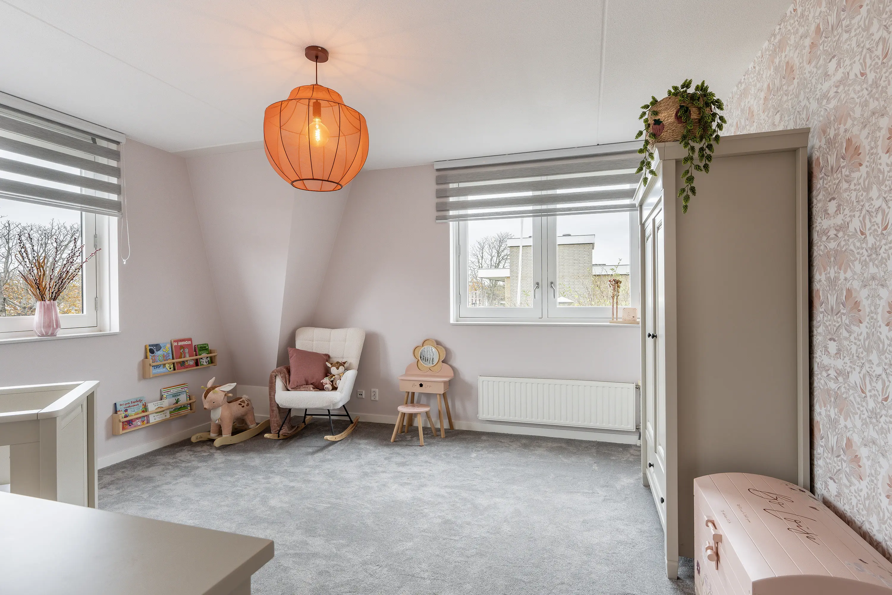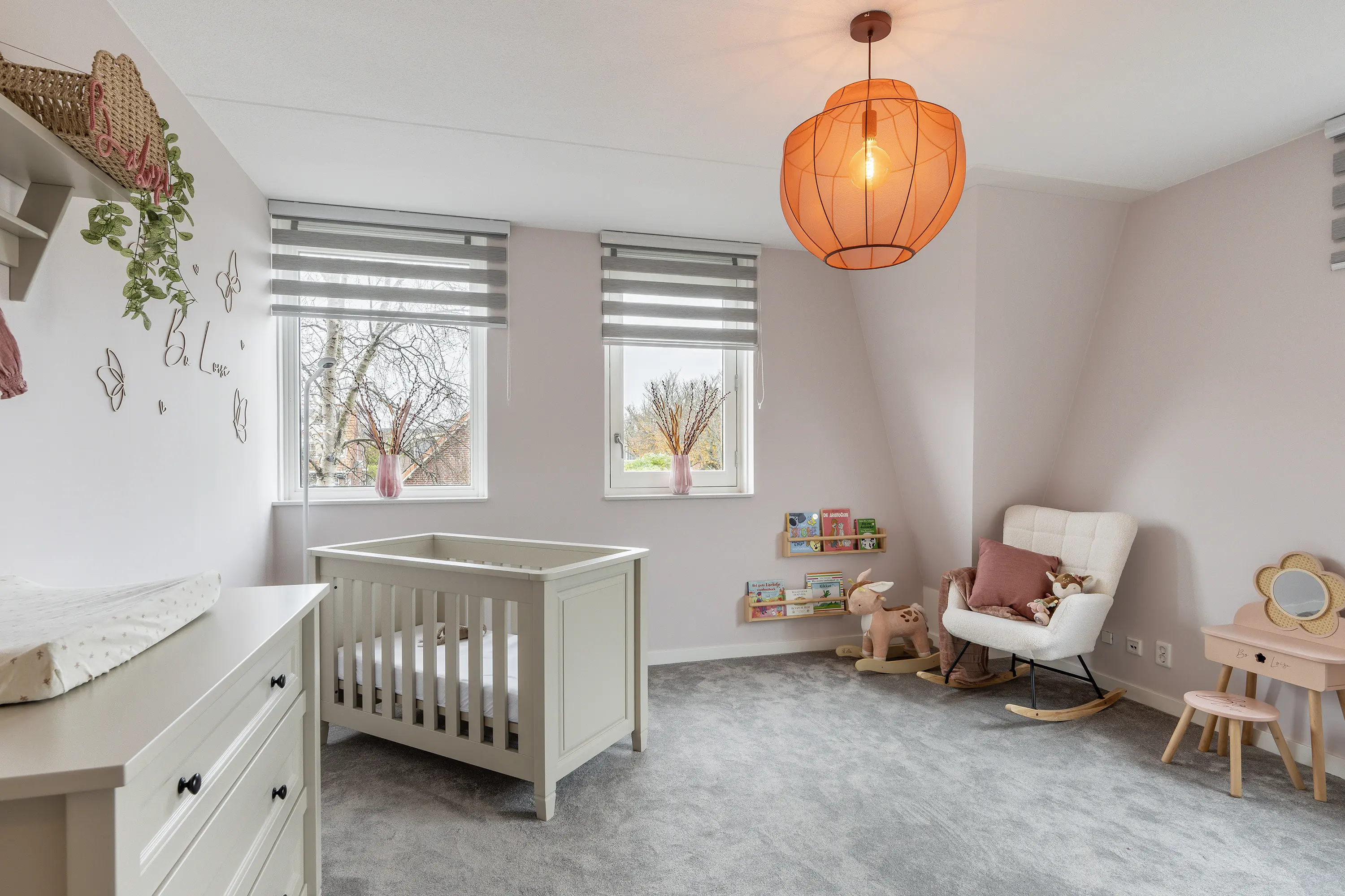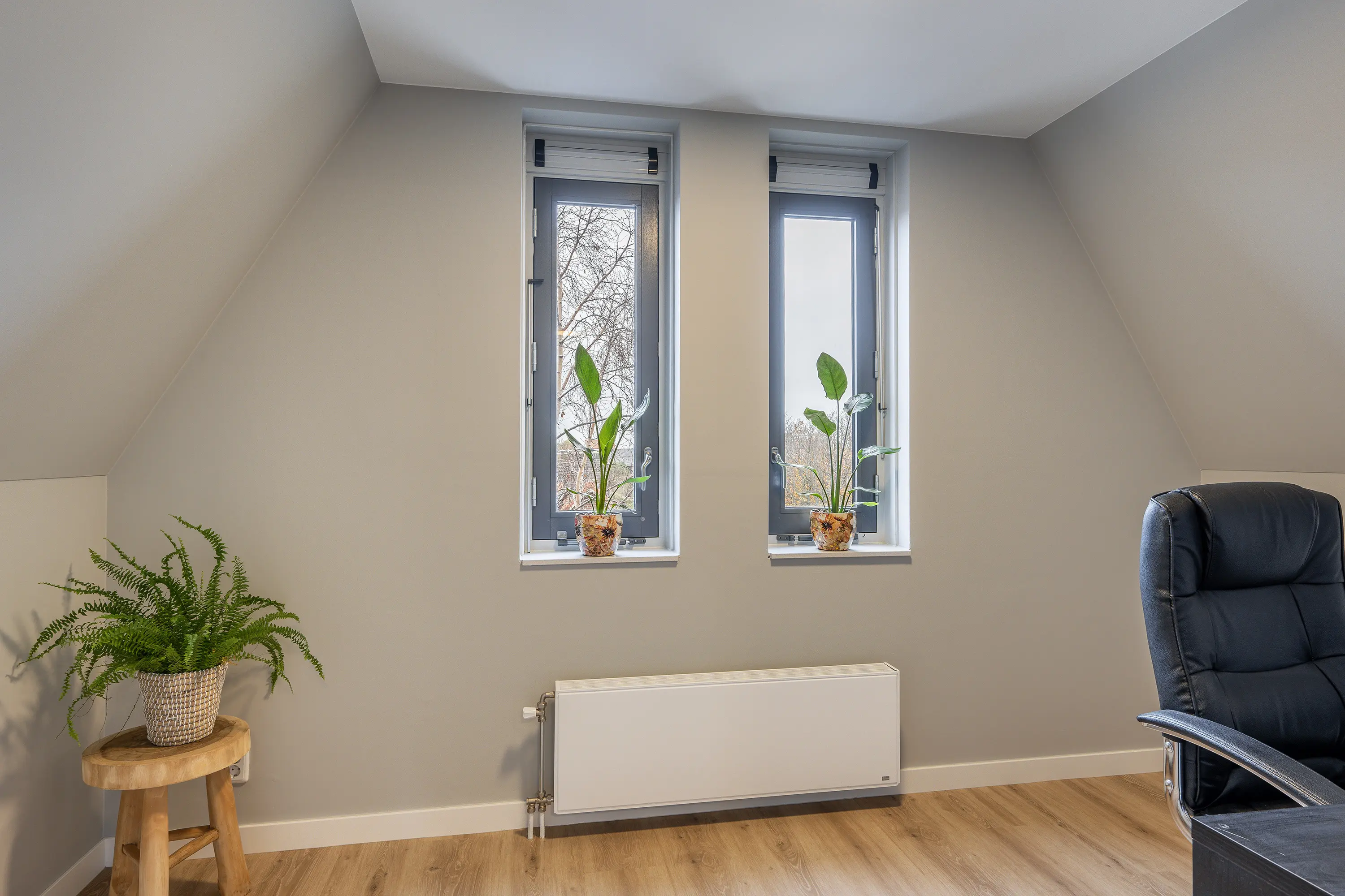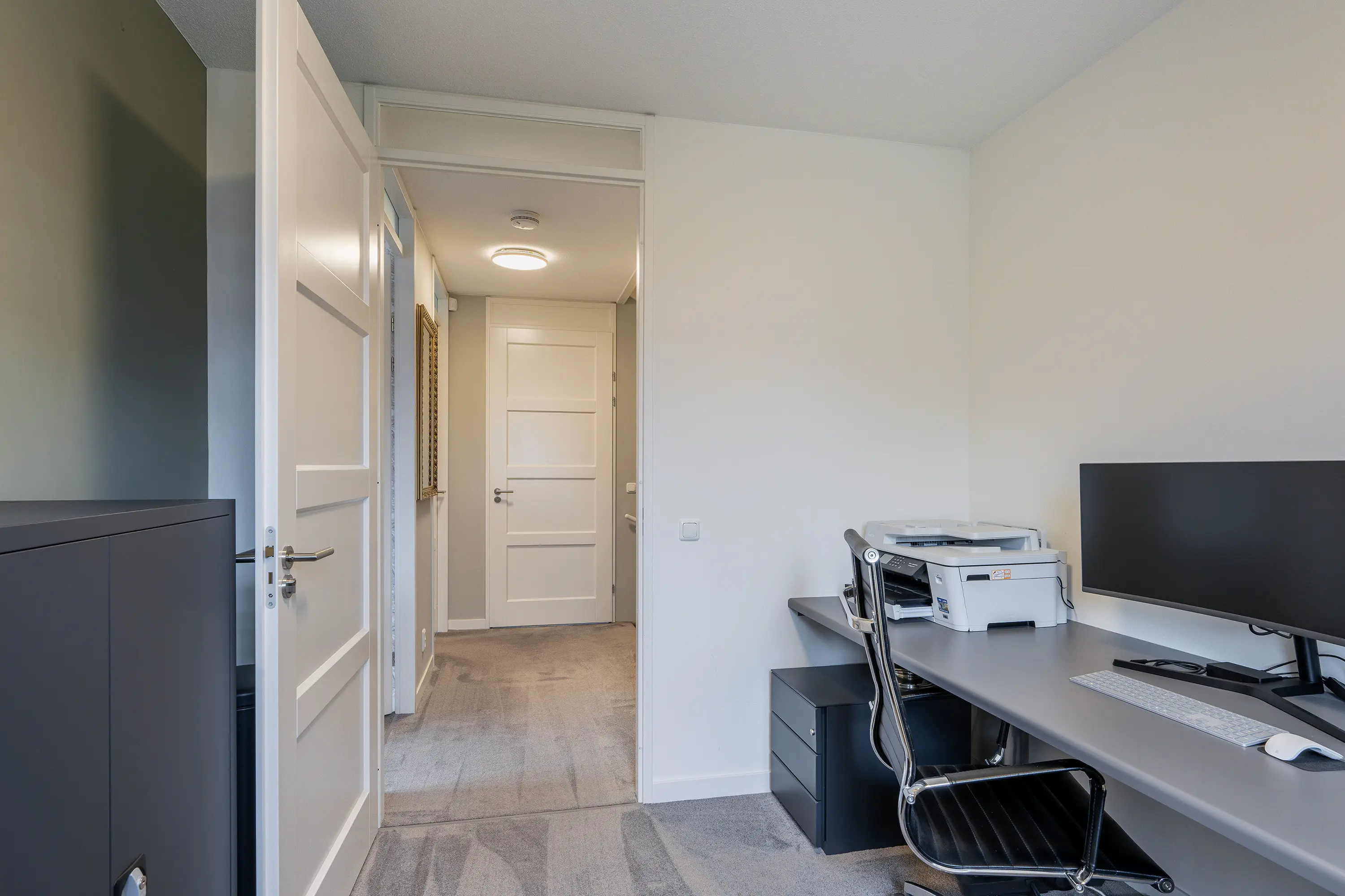 De overige twee slaapkamers liggen aan de voorzijde van de woning. De kamer aan de rechterzijde is momenteel ingericht als kinderkamer en is bijzonder ruim. Dankzij de drie ramen geniet ook deze kamer van veel daglicht. De derde (slaap)kamer wordt momenteel gebruikt als kantoor-/werkruimte. Deze kamer is iets compacter, maar leent zich uitstekend als extra slaapkamer.