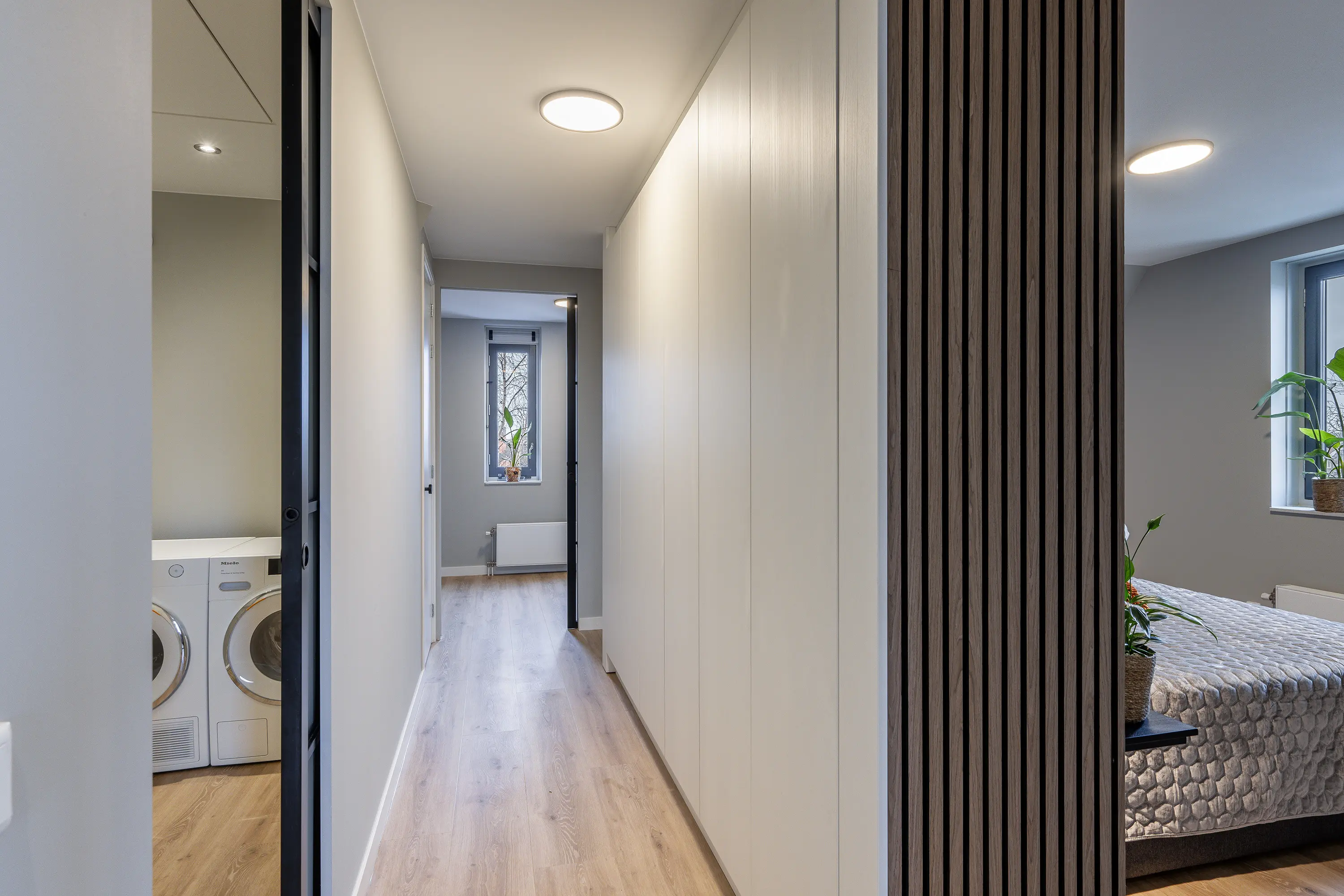Wanneer u de trap naar de tweede verdieping oploopt, komt u uit op de overloop. Hier bevindt zich direct de wasmachine opstelling. Via een schuifdeur bereikt u een open ruimte, welke door middel van een lange kastenwand is afgescheiden, waardoor er als het ware een gang is gecreëerd. Deze ruimte fungeert als de eerste slaapkamer van deze etage en beschikt over twee ramen die zorgen voor een prettige hoeveelheid natuurlijk licht.