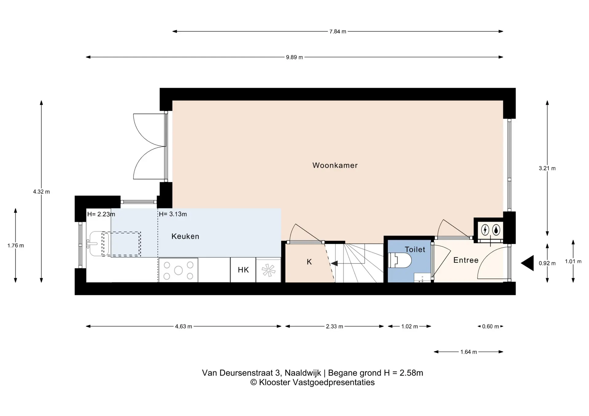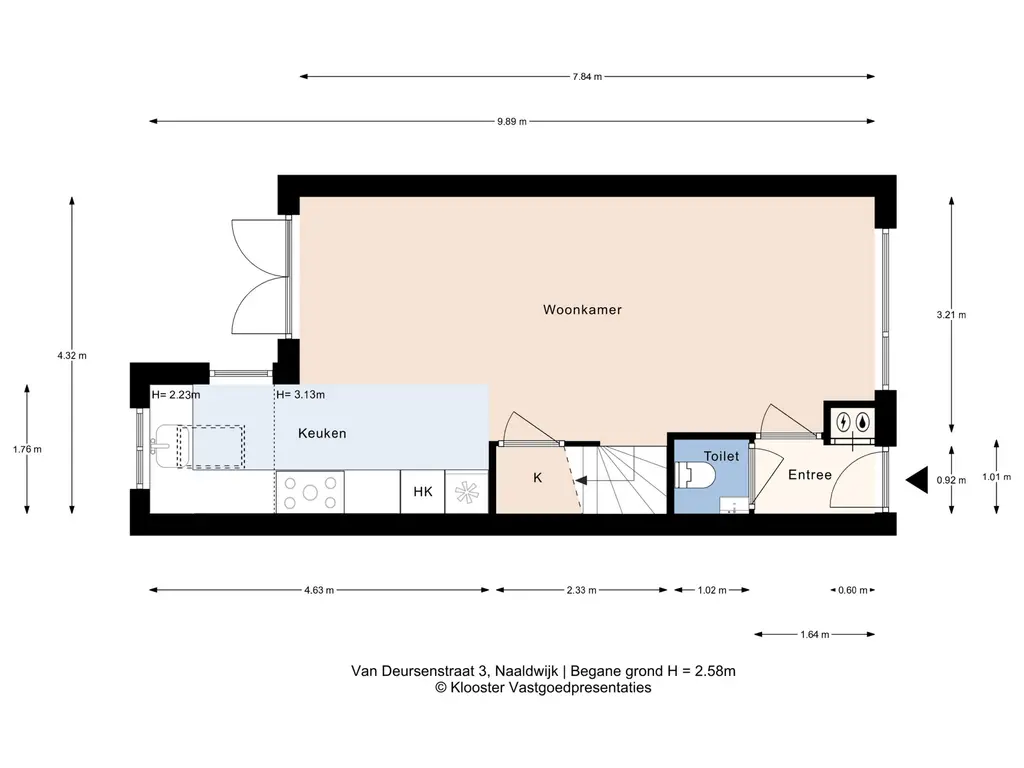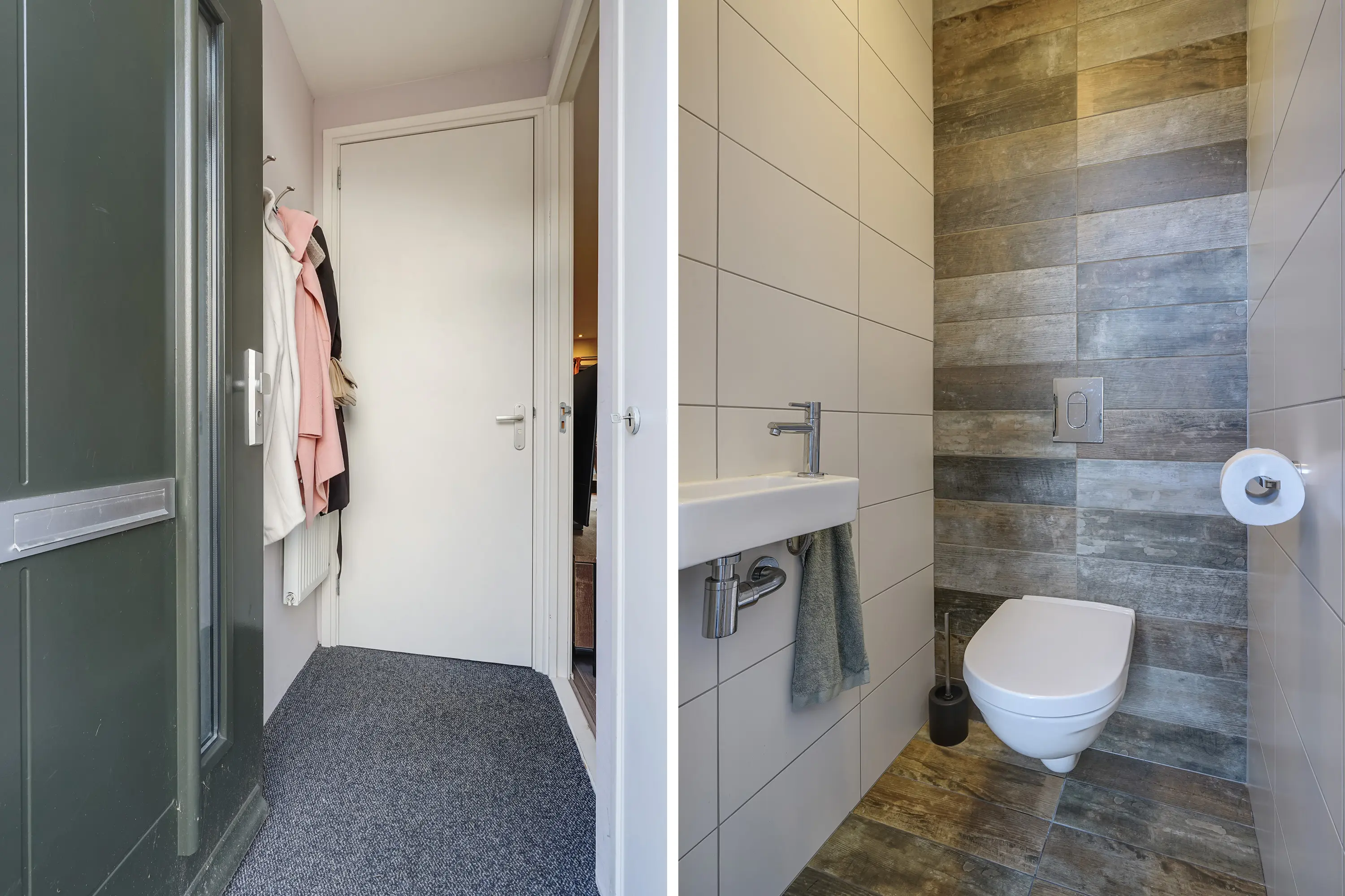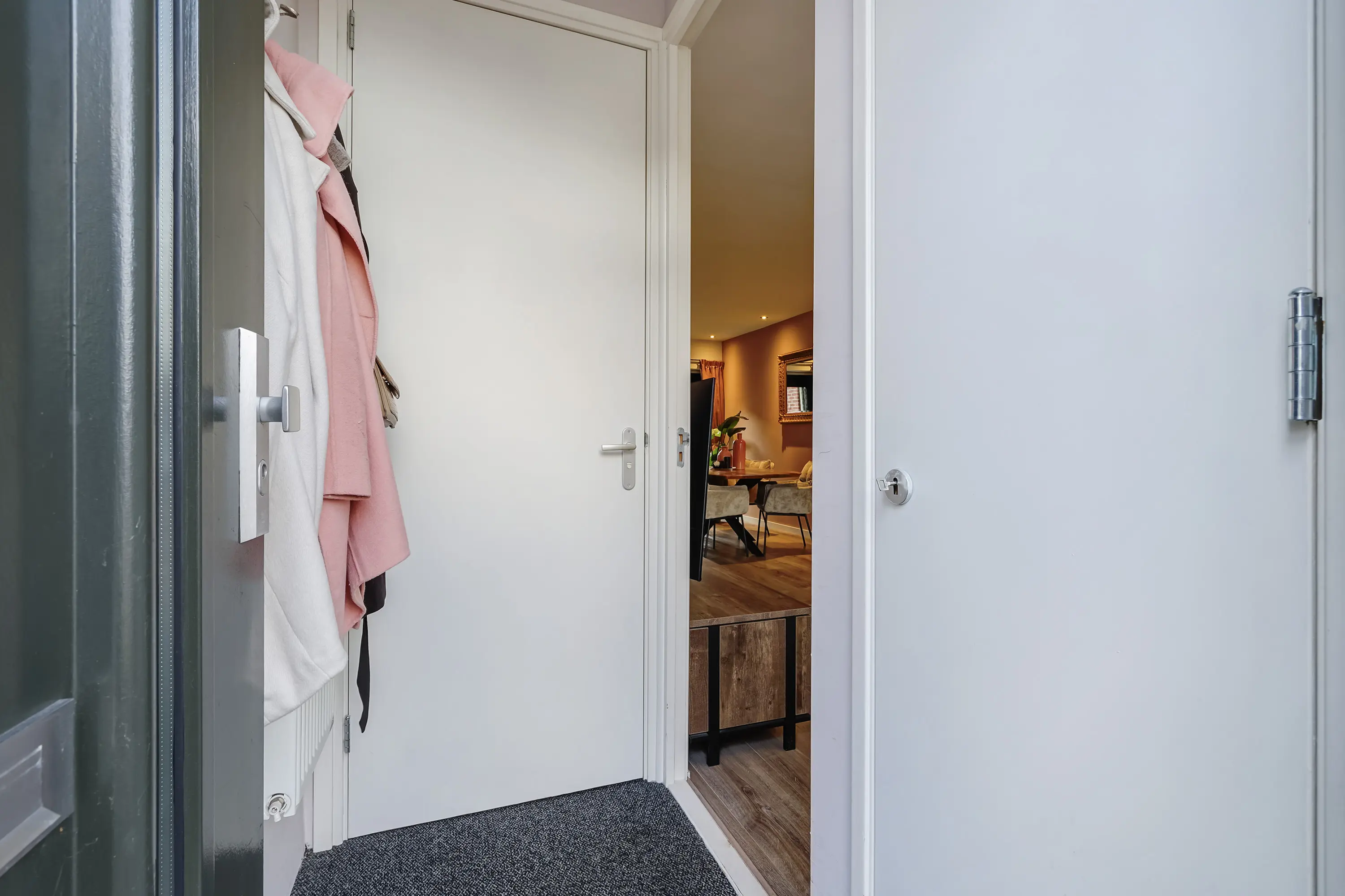 Entree van de woning aan een rustige, autoluwe straat, met toegang tot de meterkast, het toilet en de deur naar de woonkamer.