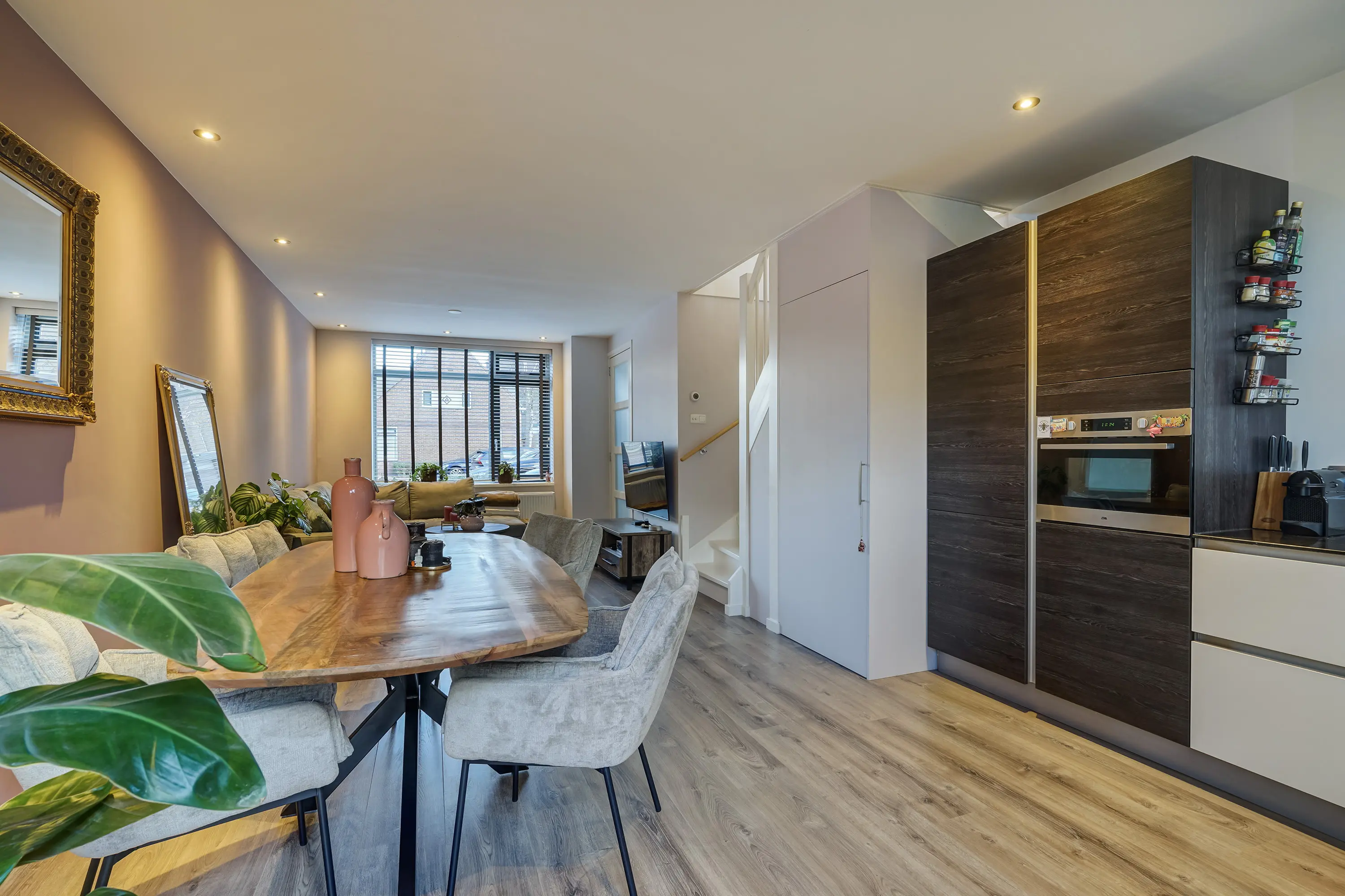 Aan de voorzijde van de woning bevindt zich de zithoek. Achter in de woonkamer liggen de openslaande deuren naar de tuin en de open keuken. De vloer in de woonkamer is afgewerkt met laminaat. De woonkamer is voorzien van inbouwspots in het plafond. Ook is er een bergkast aanwezig naast de trap naar de eerste verdieping.