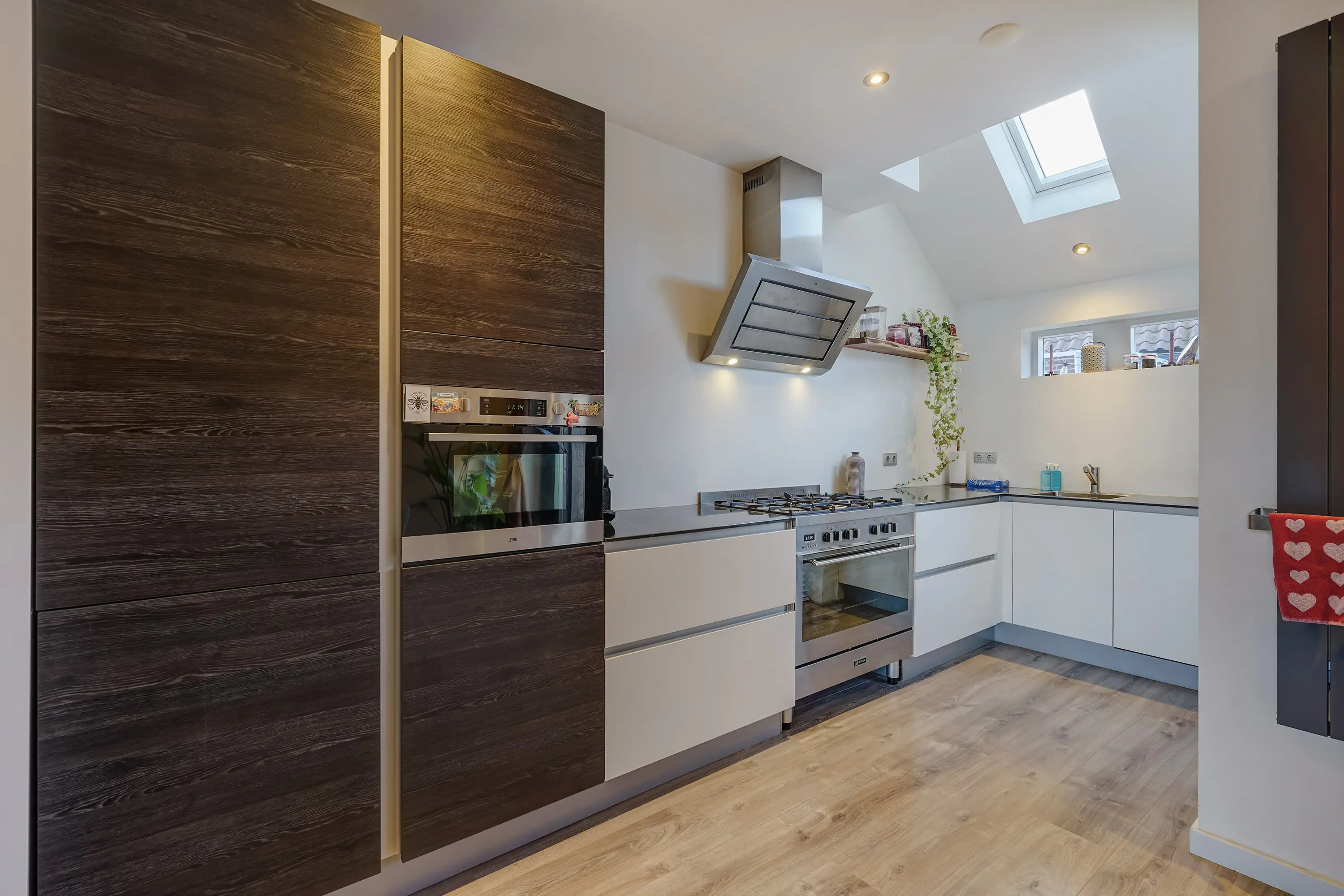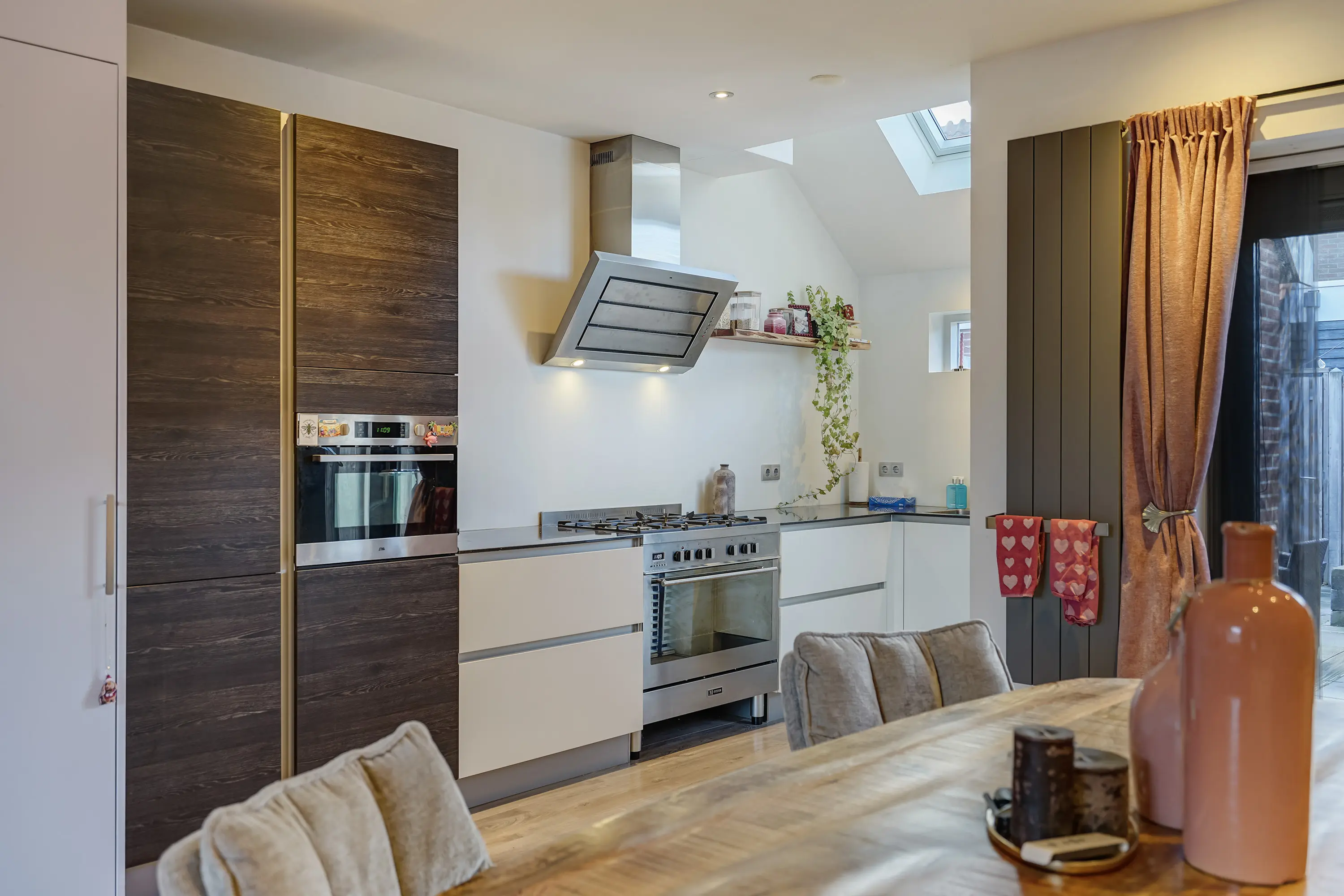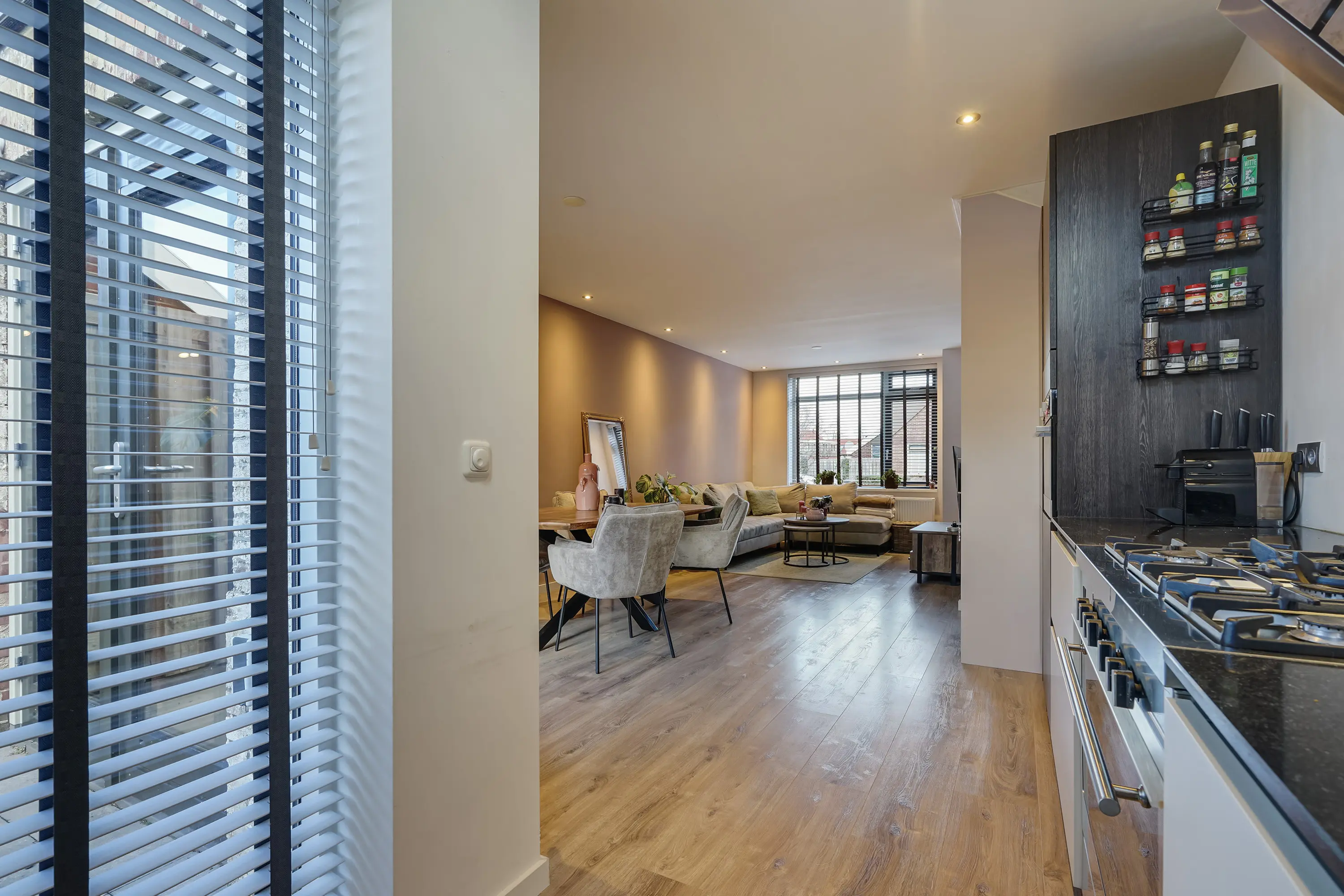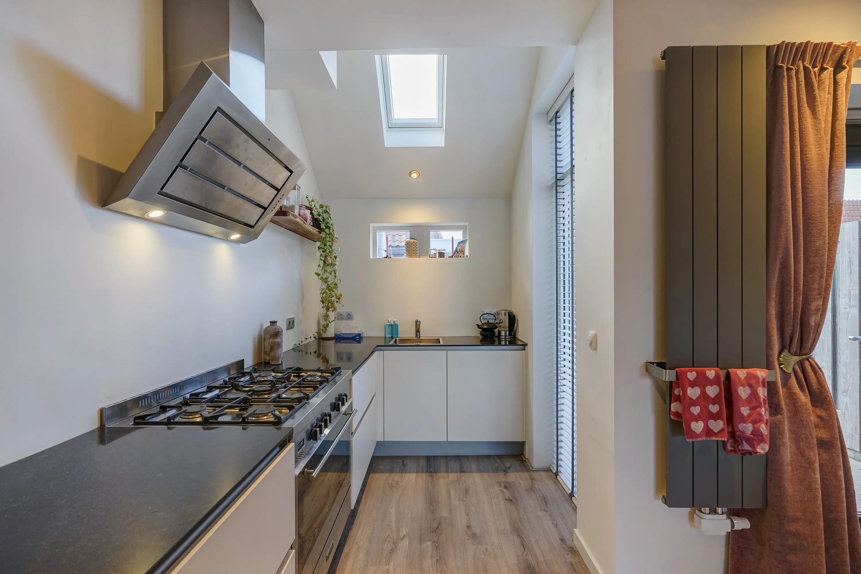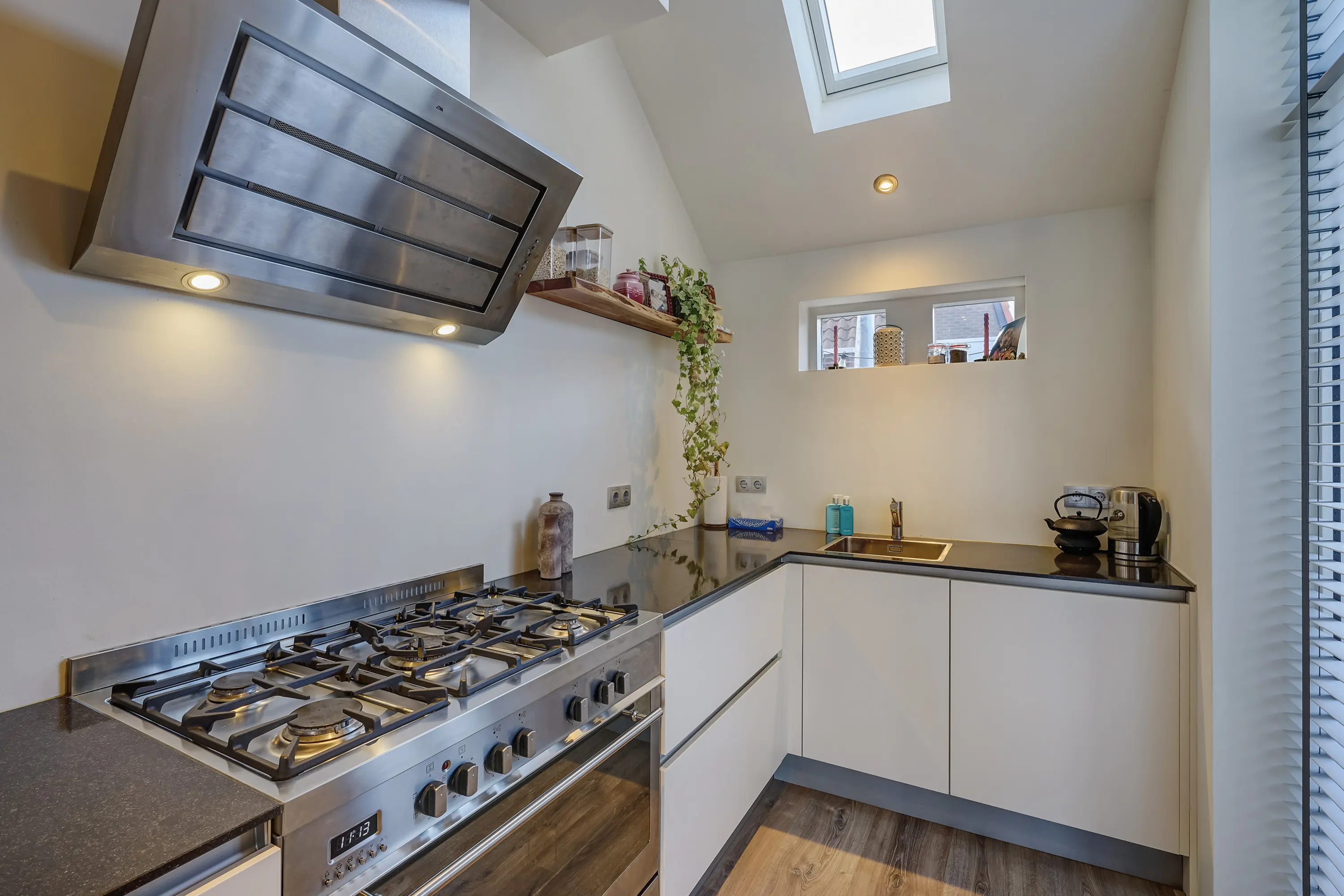 De keuken is uitgerust met diverse inbouwapparatuur, waaronder een 5-pits gasfornuis, afzuigkap, magnetron, koelkast en vriezer. Daarnaast bevindt zich bij de keuken een langwerpig raam dat zorgt voor extra lichtinval.