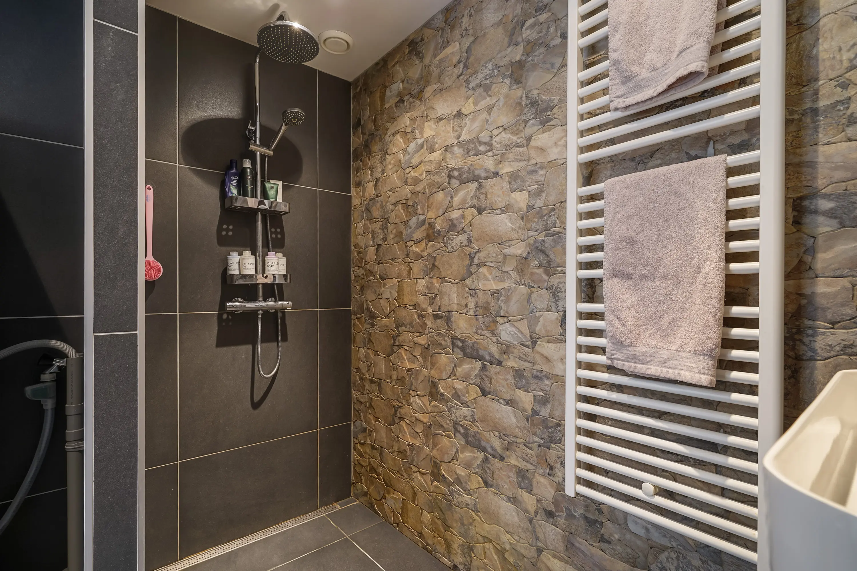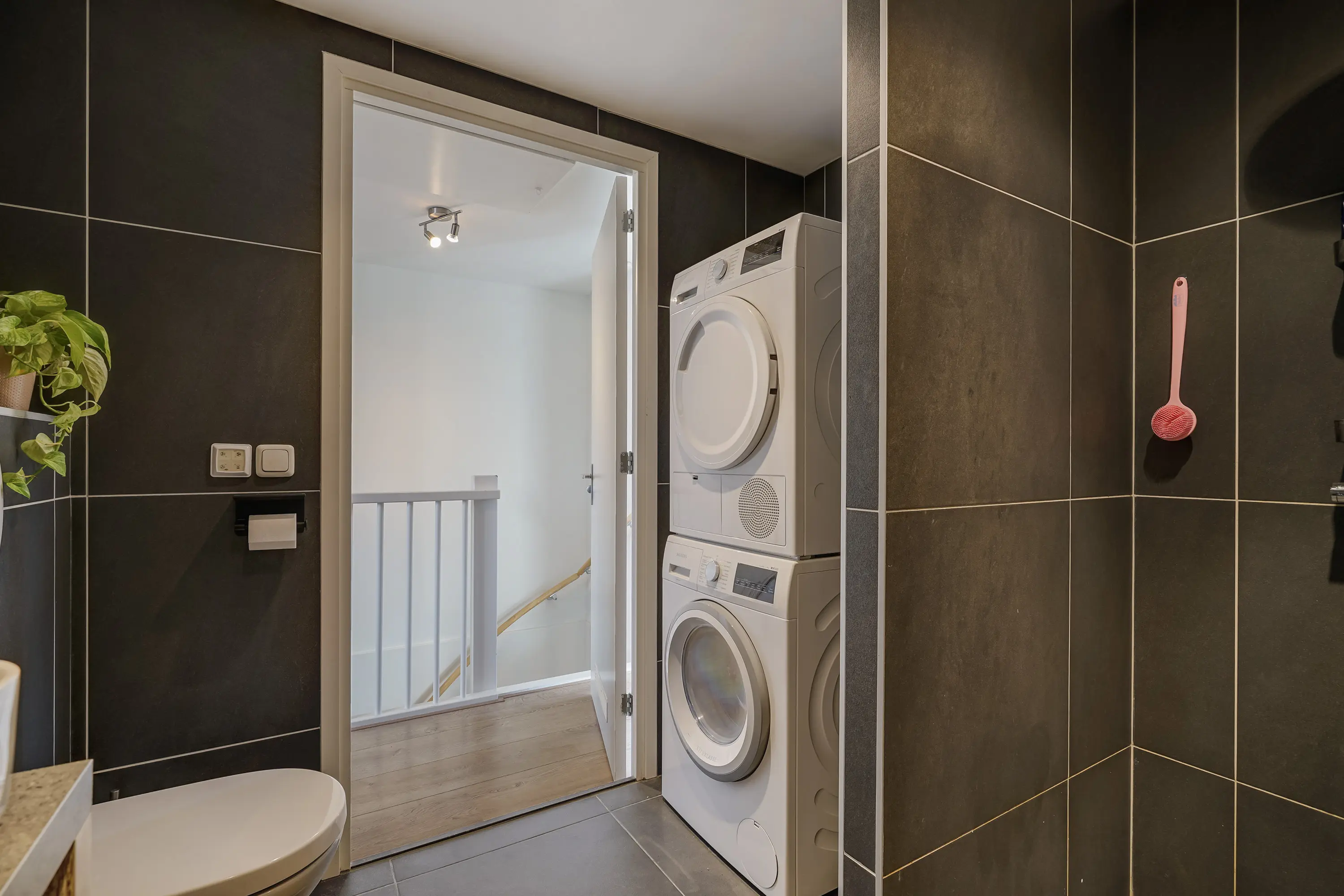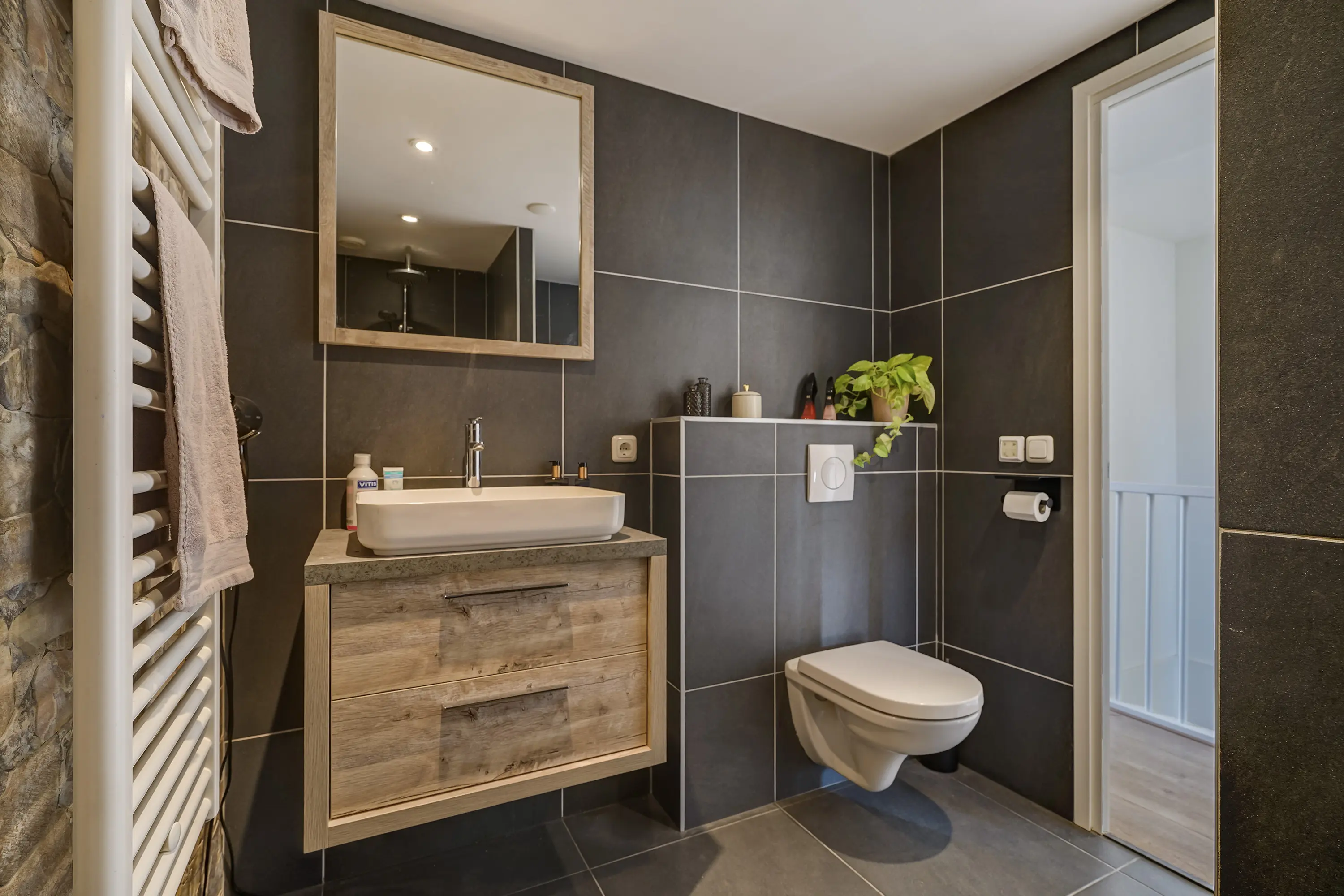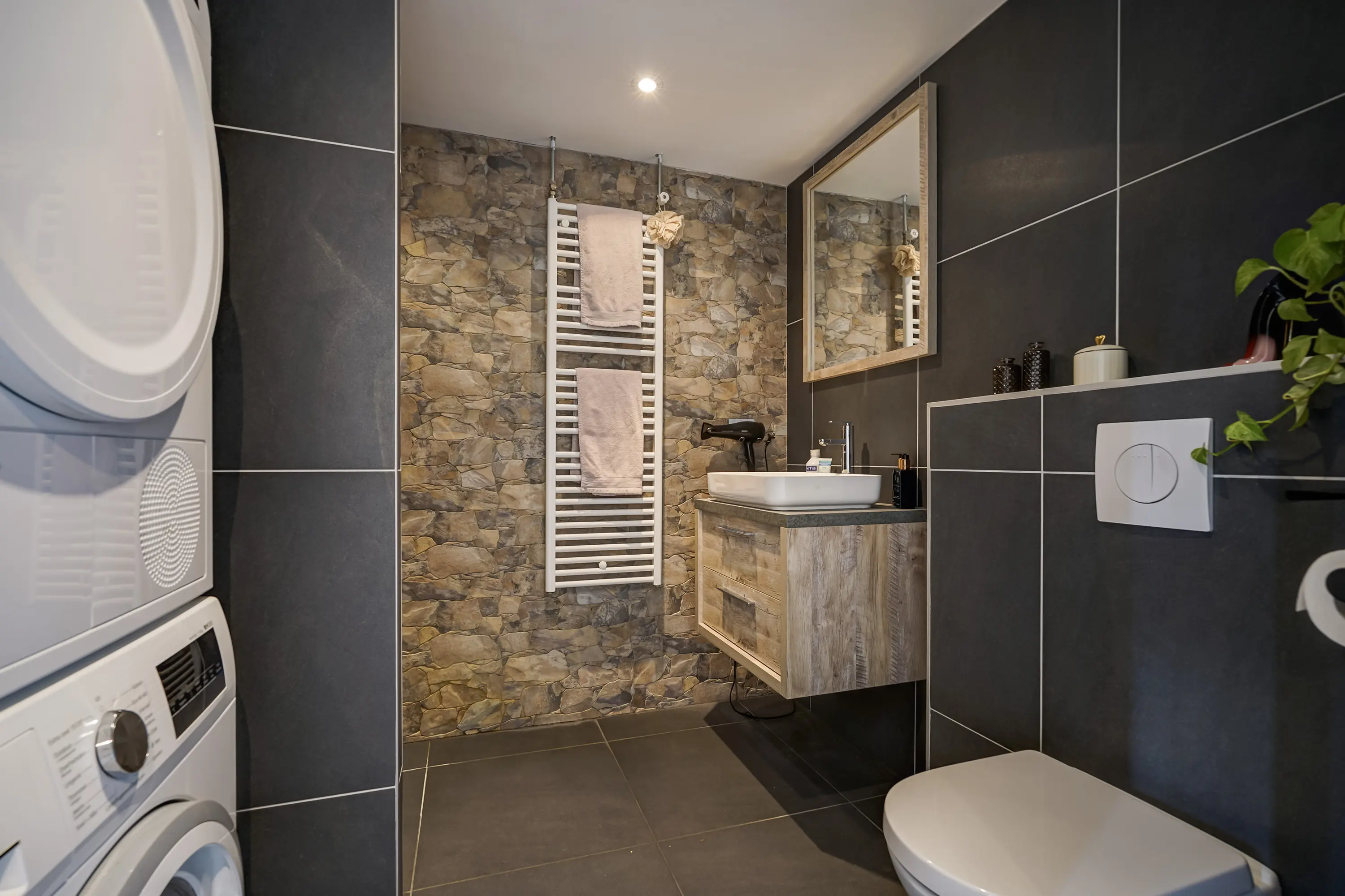 De badkamer is uitgevoerd met antracietkleurige tegels en een natuurlijke achterwand. De ruimte is voorzien van een inloopdouche met regendouche en thermostaatkraan, een houtlook wastafelmeubel en tweede toilet. De aansluitingen voor de wasmachine en droger zijn aanwezig en netjes weggewerkt.