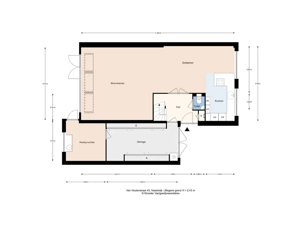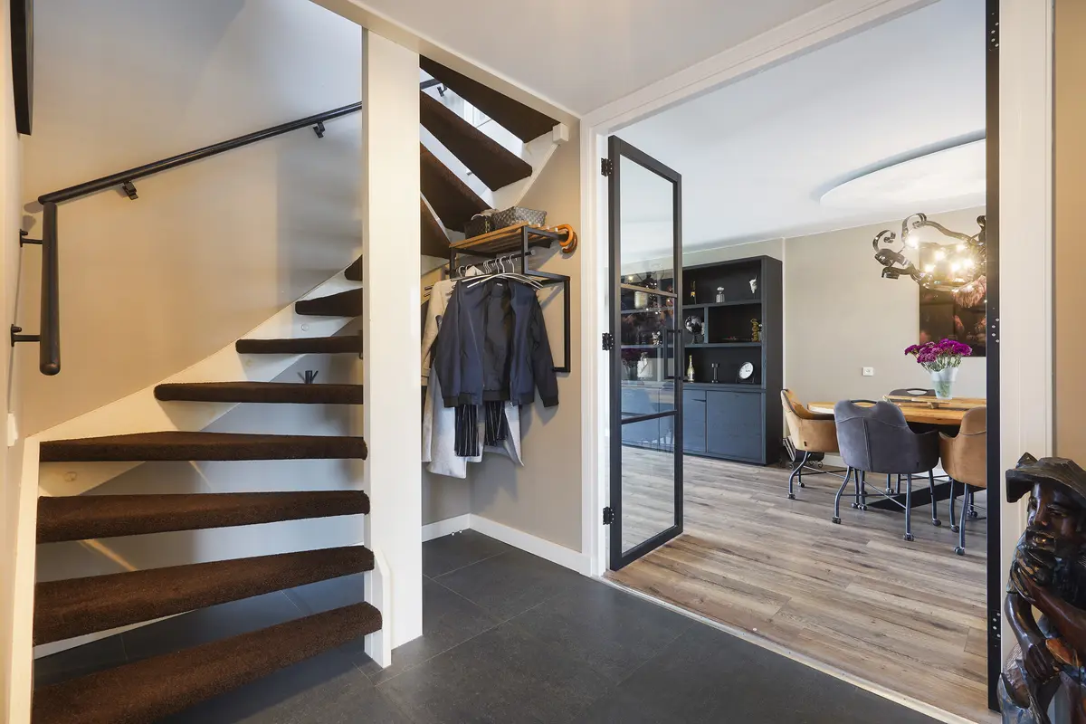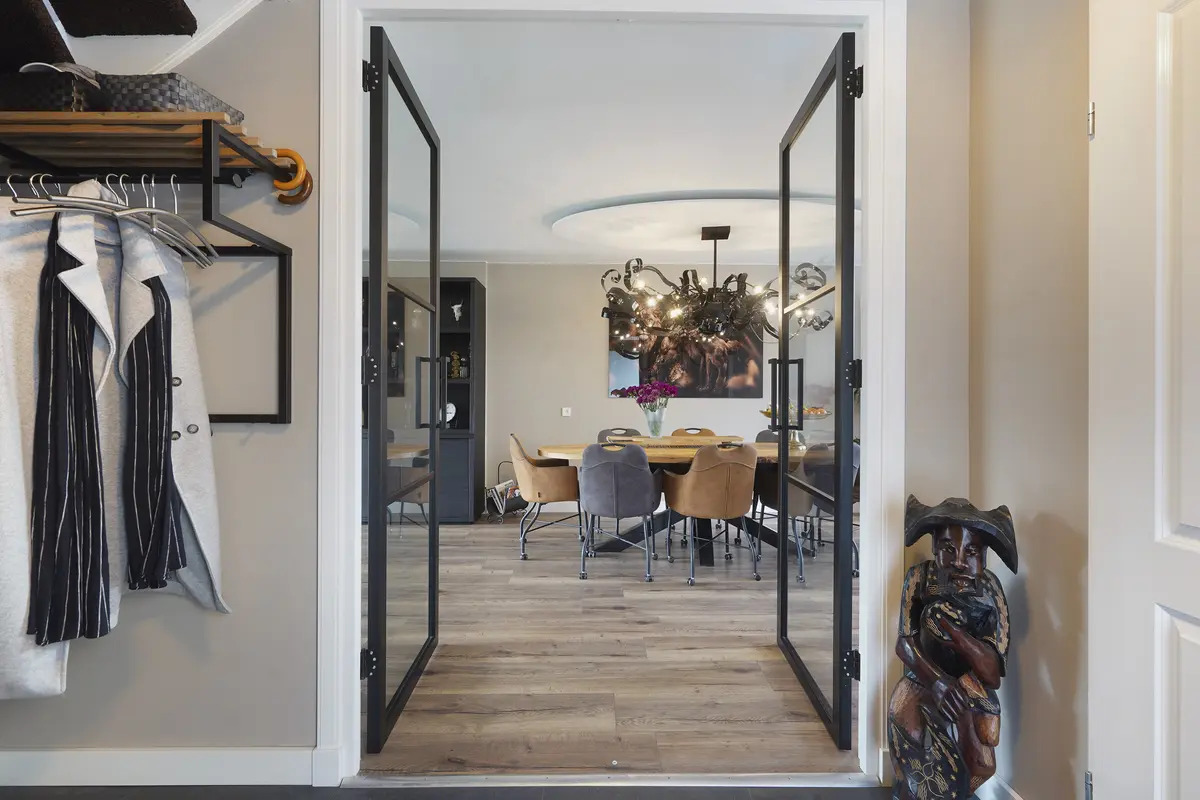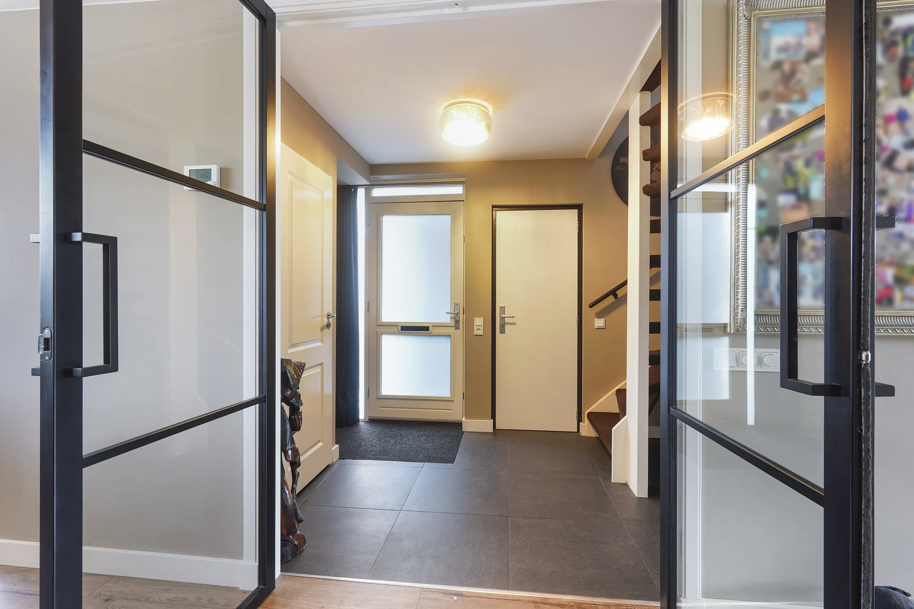 Wanneer u deze woning binnenstapt, komt u binnen in een ruime en statige hal. Hier bevinden zich de meterkast, het toilet met fonteintje, de trap naar de eerste verdieping, de deur naar de garage én stijlvolle, openslaande deuren die toegang geven tot de woonkamer.