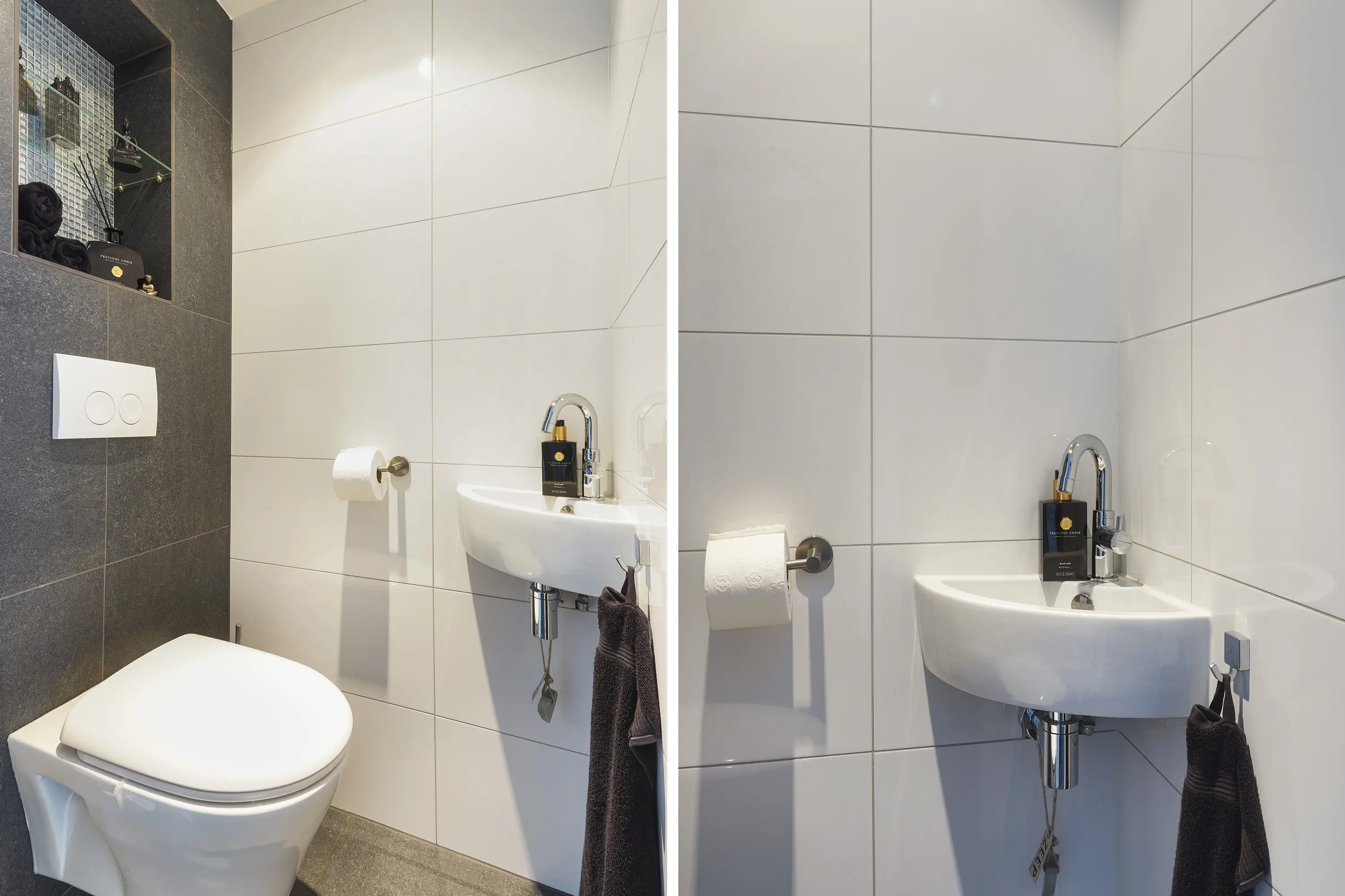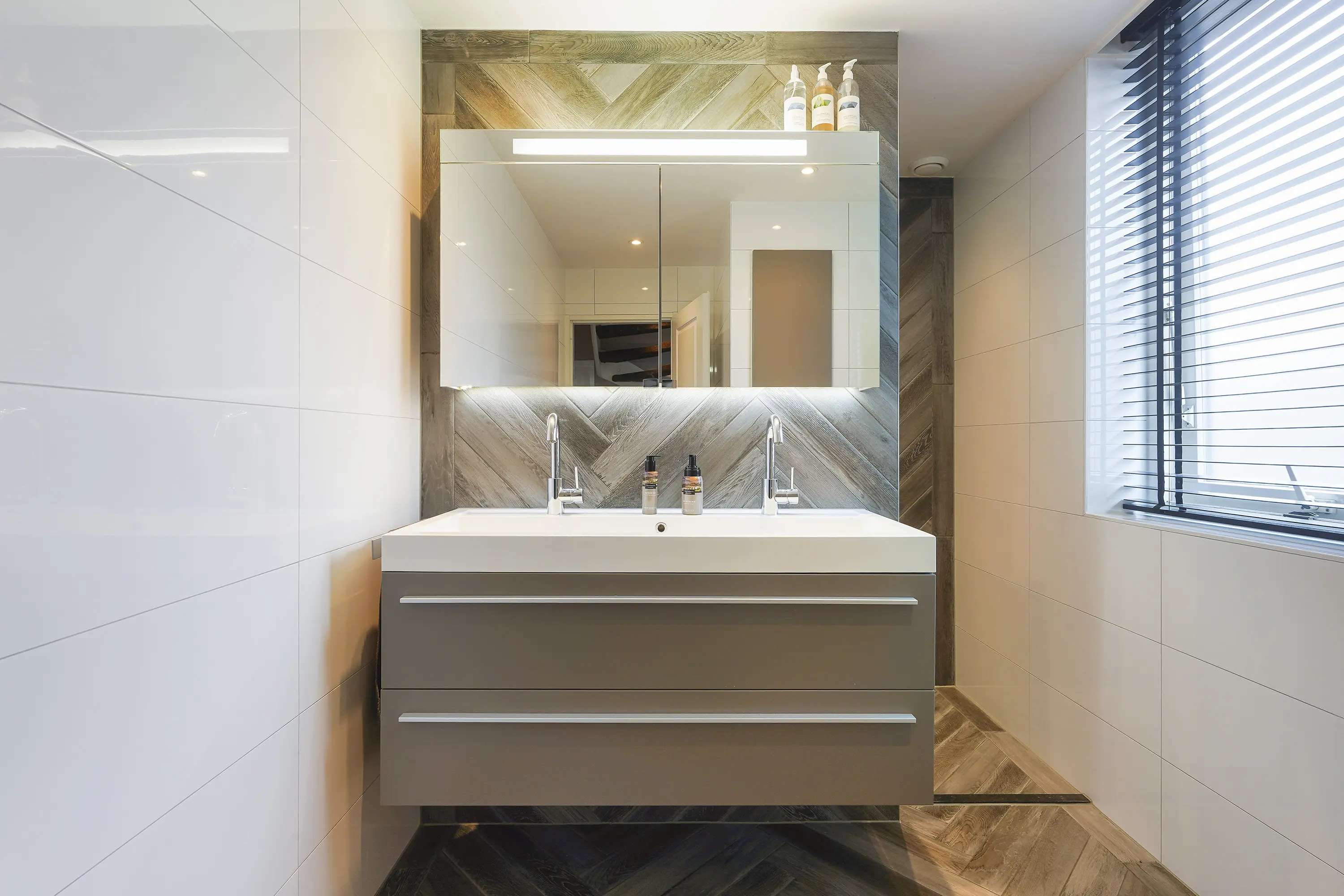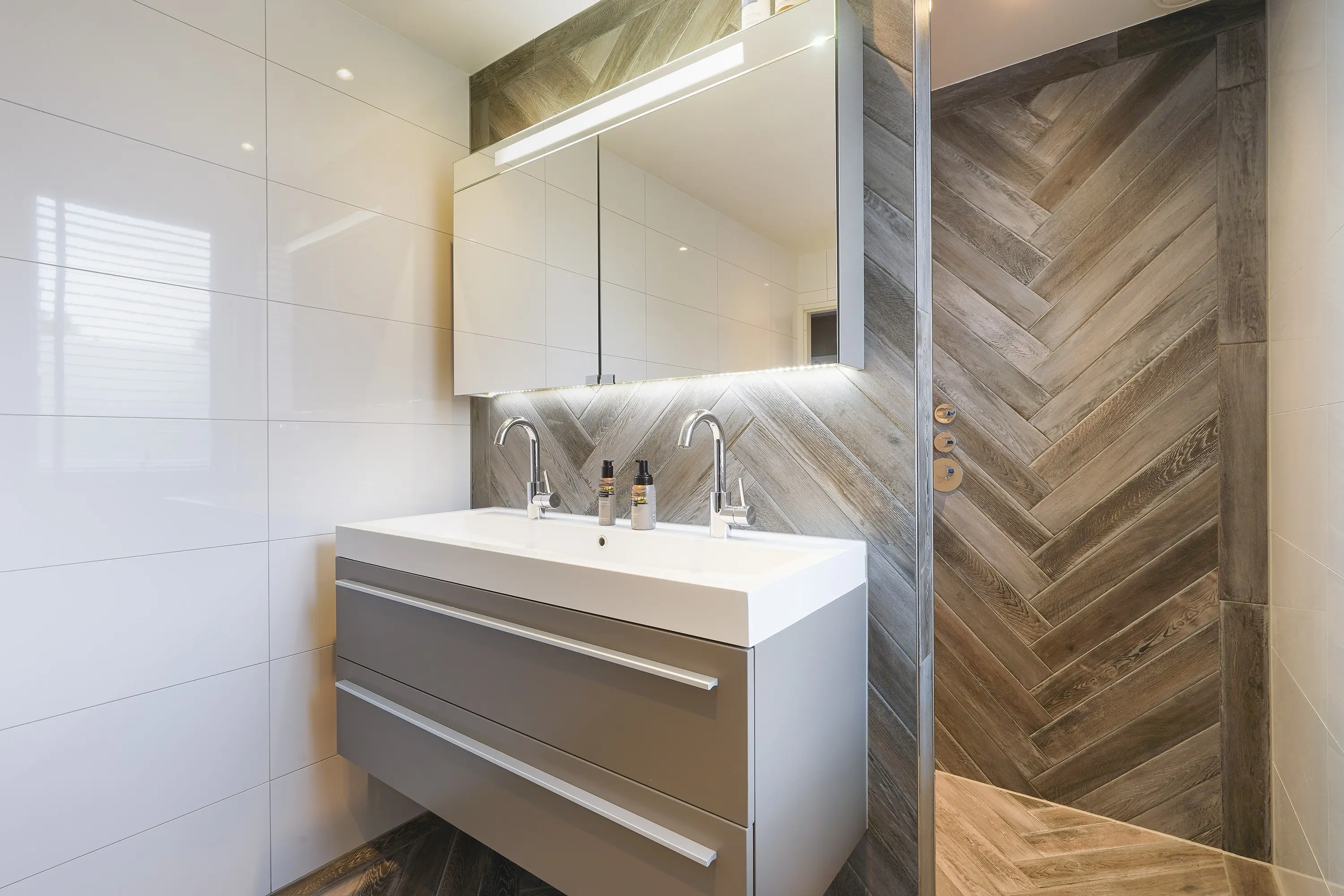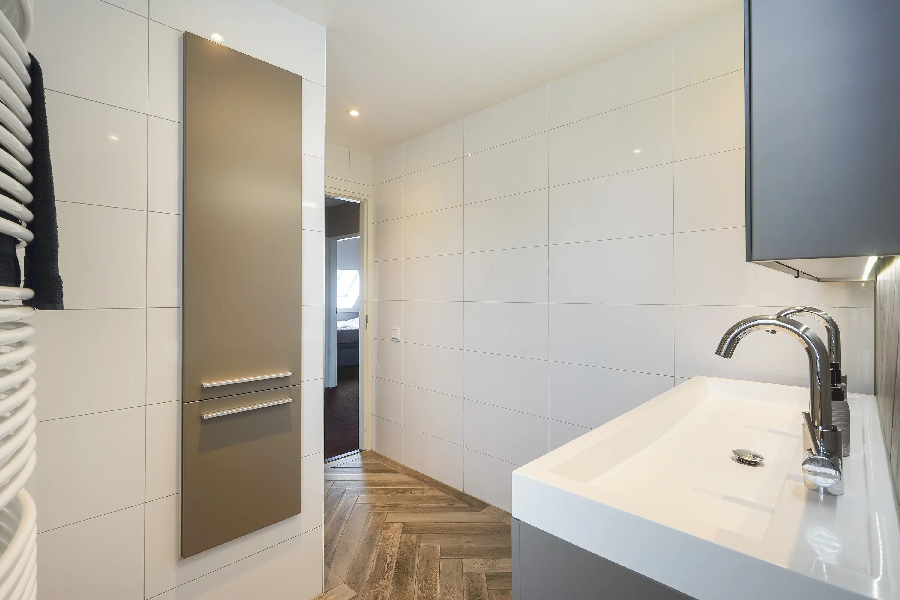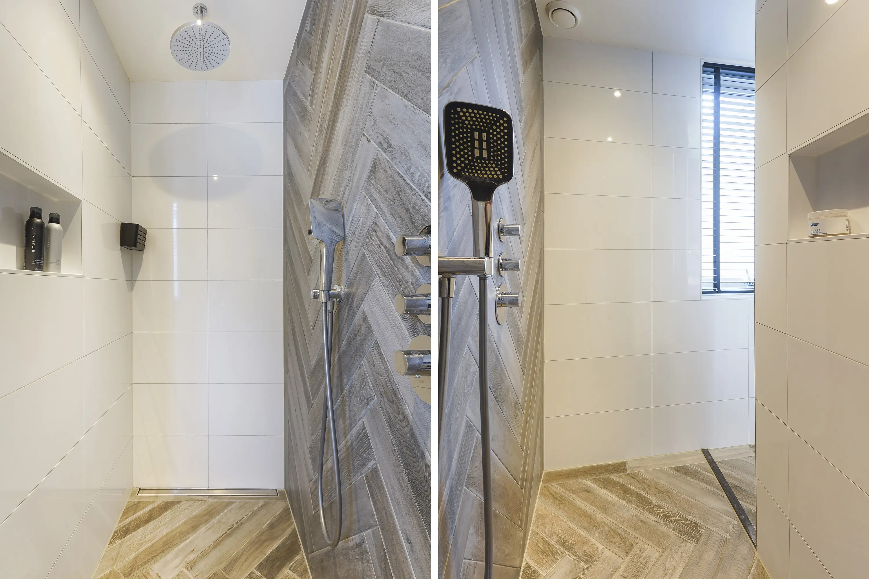 De badkamer (2020) is verrassend ruim en modern afgewerkt. Aan de achterzijde vindt u een comfortabele inloopdouche, voorzien van zowel een regendouche als een handdouche. Tegen de scheidingswand staat een brede wastafel met spiegel, wat de ruimte een luxe uitstraling geeft. De vloer is afgewerkt met stijlvolle tegels in visgraat motief en delen van de muren zijn voorzien van dezelfde tegels in warme houtlook, wat zorgt voor een rustige, natuurlijke sfeer. De badkamer beschikt over vloerverwarming; deze werkt in combinatie met de centrale verwarming van het hele huis en is dus niet afzonderlijk te regelen.