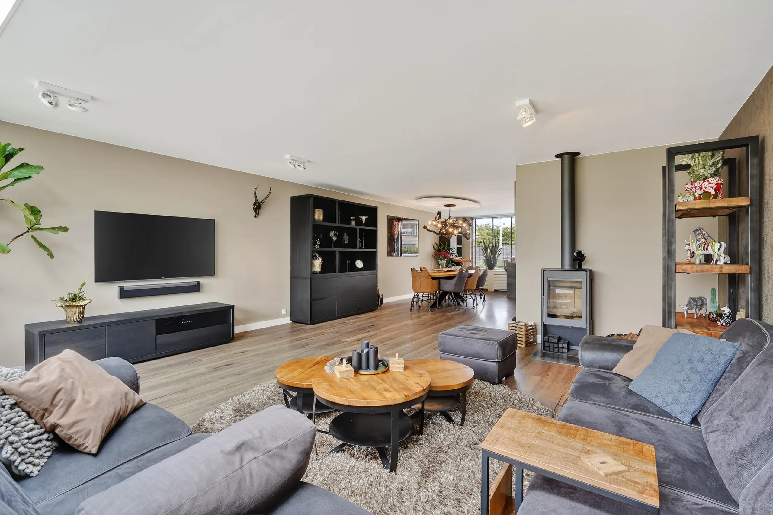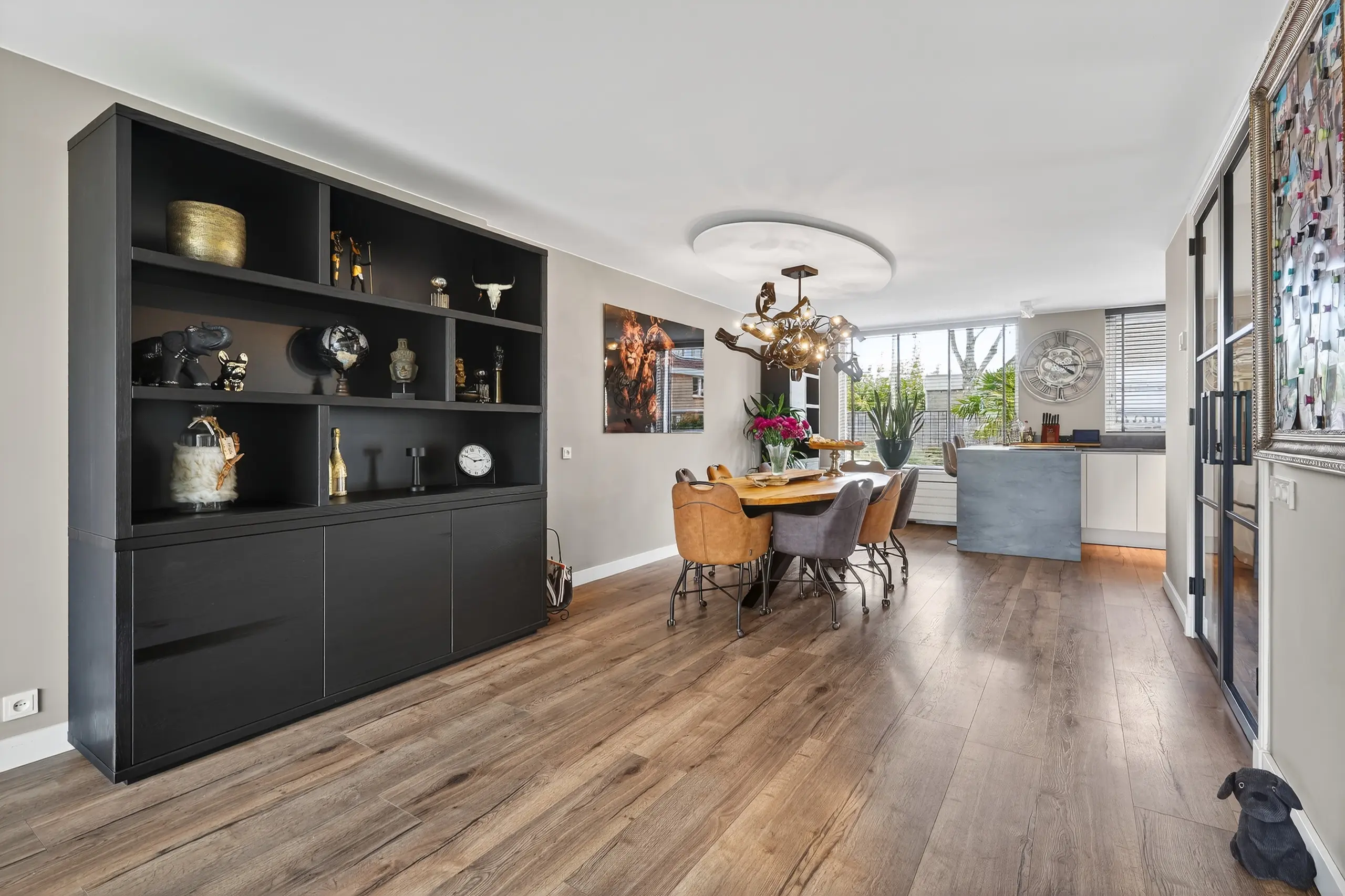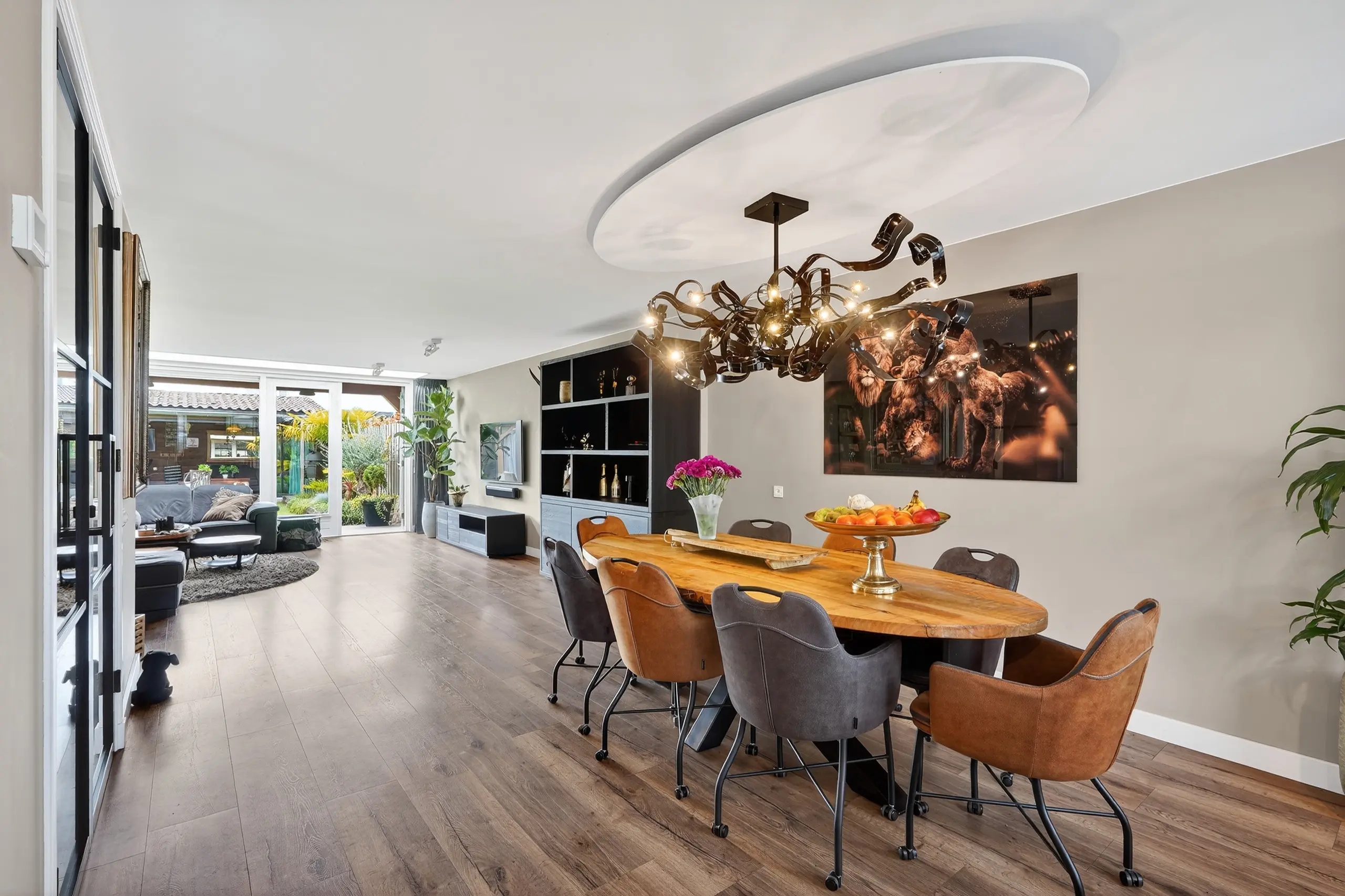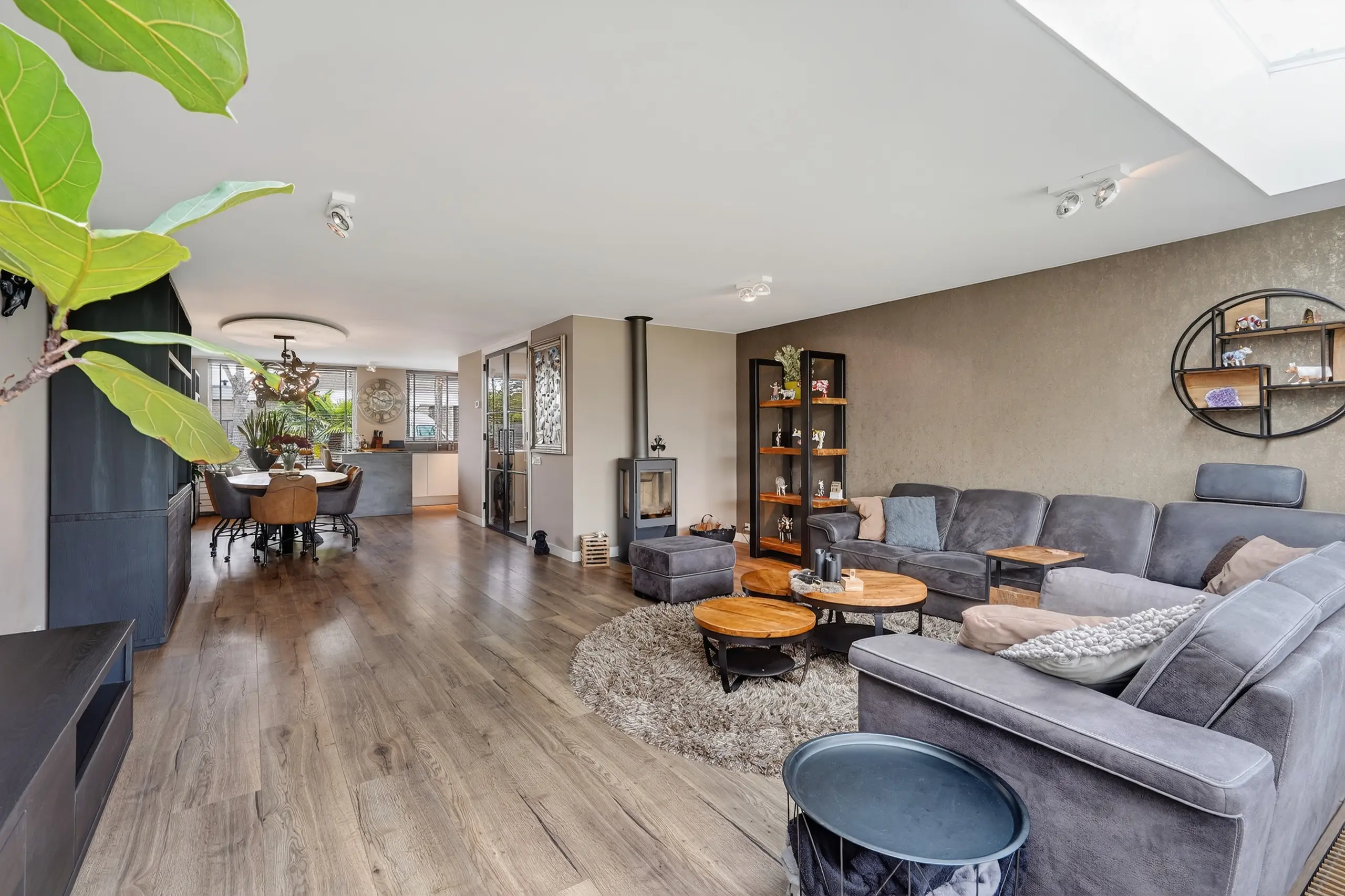 Achter deze deuren komt u in de royale woonkamer, die dankzij de aanbouw van ruim 10 m2 (2018) en een grote raampartij aan zowel voor- als achterzijde heerlijk licht aanvoelt. Aan de tuinzijde bevindt zich een comfortabele zithoek met houtkachel. Aan de voorzijde van de woning is de eethoek gesitueerd, met voldoende ruimte voor een grote eettafel – perfect voor gezellige diners met het gezin of vrienden.