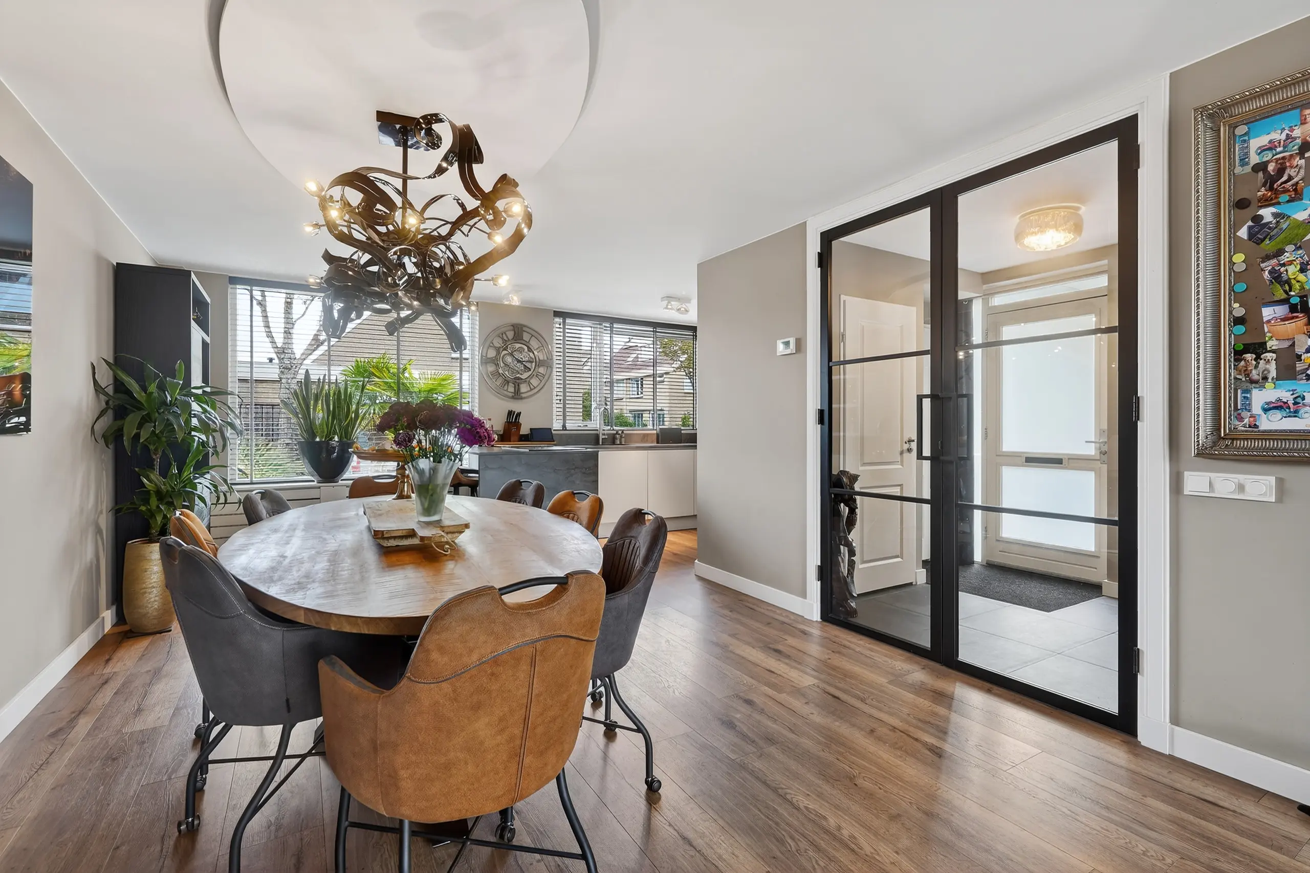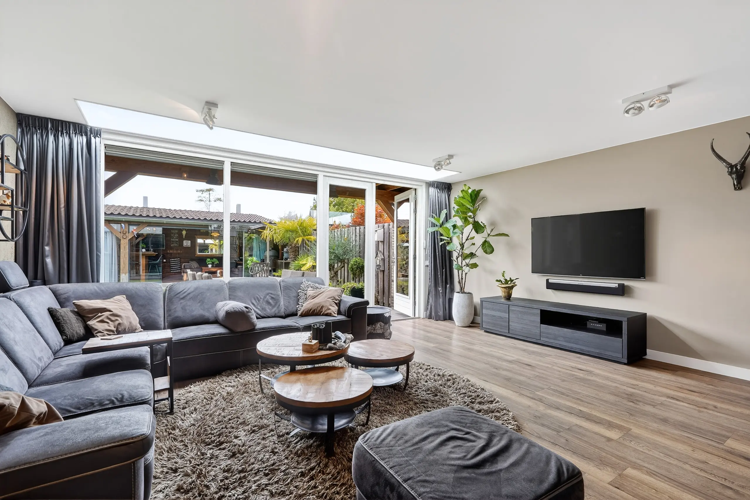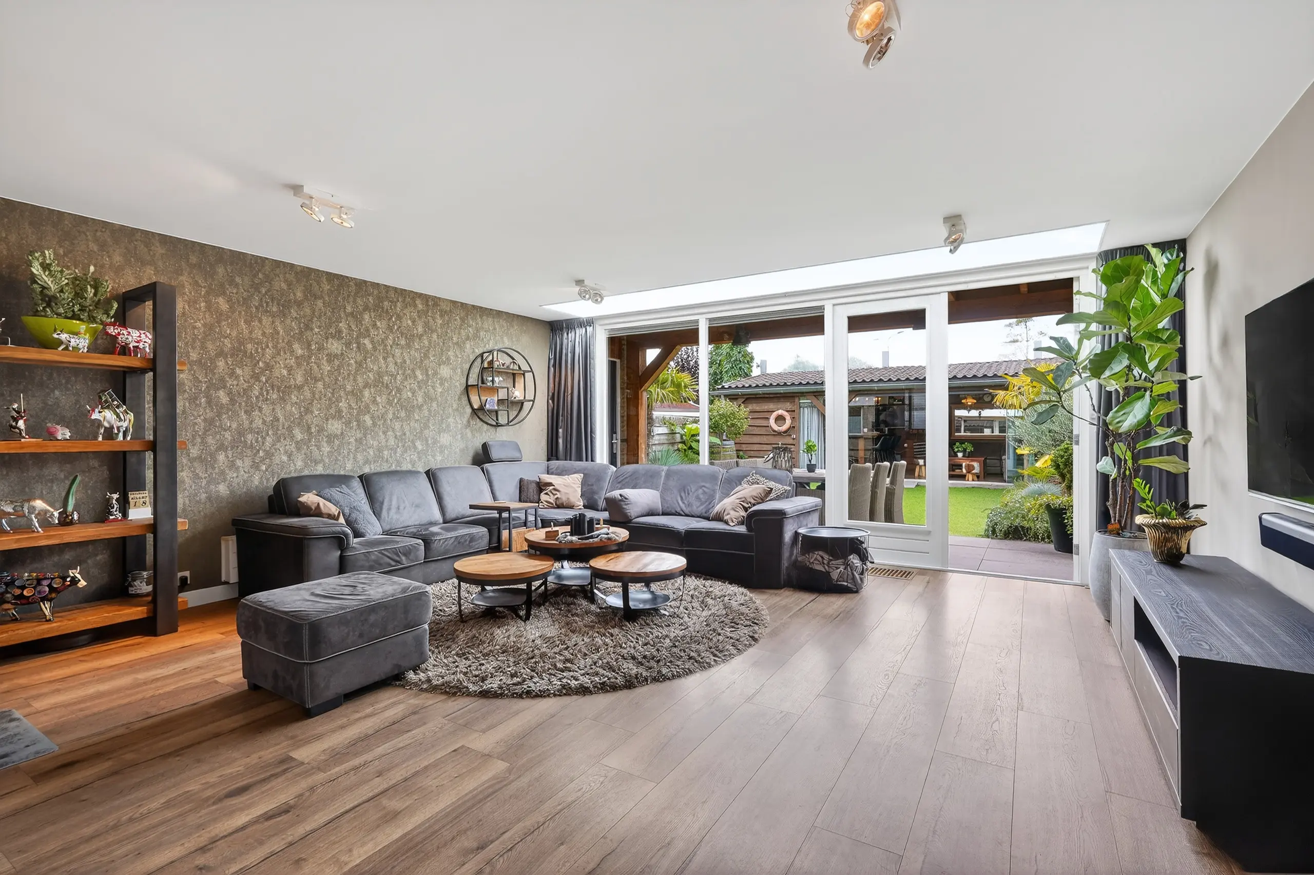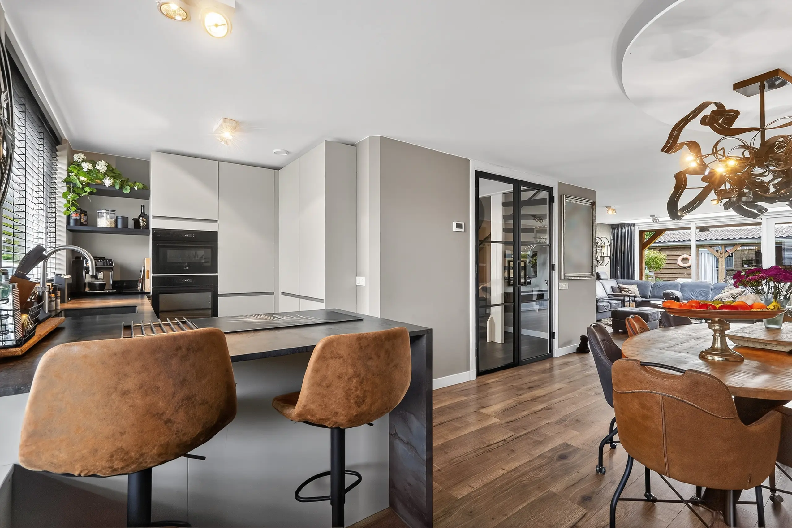 Achter deze deuren komt u in de royale woonkamer, die dankzij de aanbouw van ruim 10 m2 (2018) en een grote raampartij aan zowel voor- als achterzijde heerlijk licht aanvoelt. Aan de tuinzijde bevindt zich een comfortabele zithoek met houtkachel. Aan de voorzijde van de woning is de eethoek gesitueerd, met voldoende ruimte voor een grote eettafel – perfect voor gezellige diners met het gezin of vrienden.