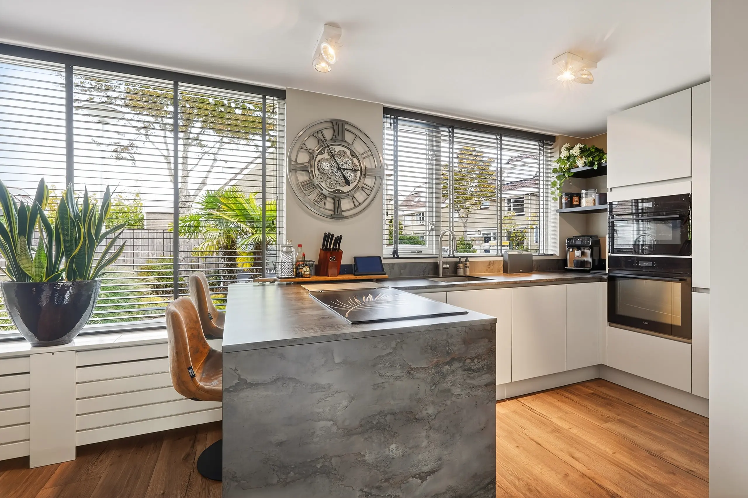 De moderne keuken aan de voorzijde is van alle gemakken voorzien. Zo is er een ruim kookeiland, een BORA kookplaat, een oven én combi-magnetron – ideaal voor de kookliefhebber.