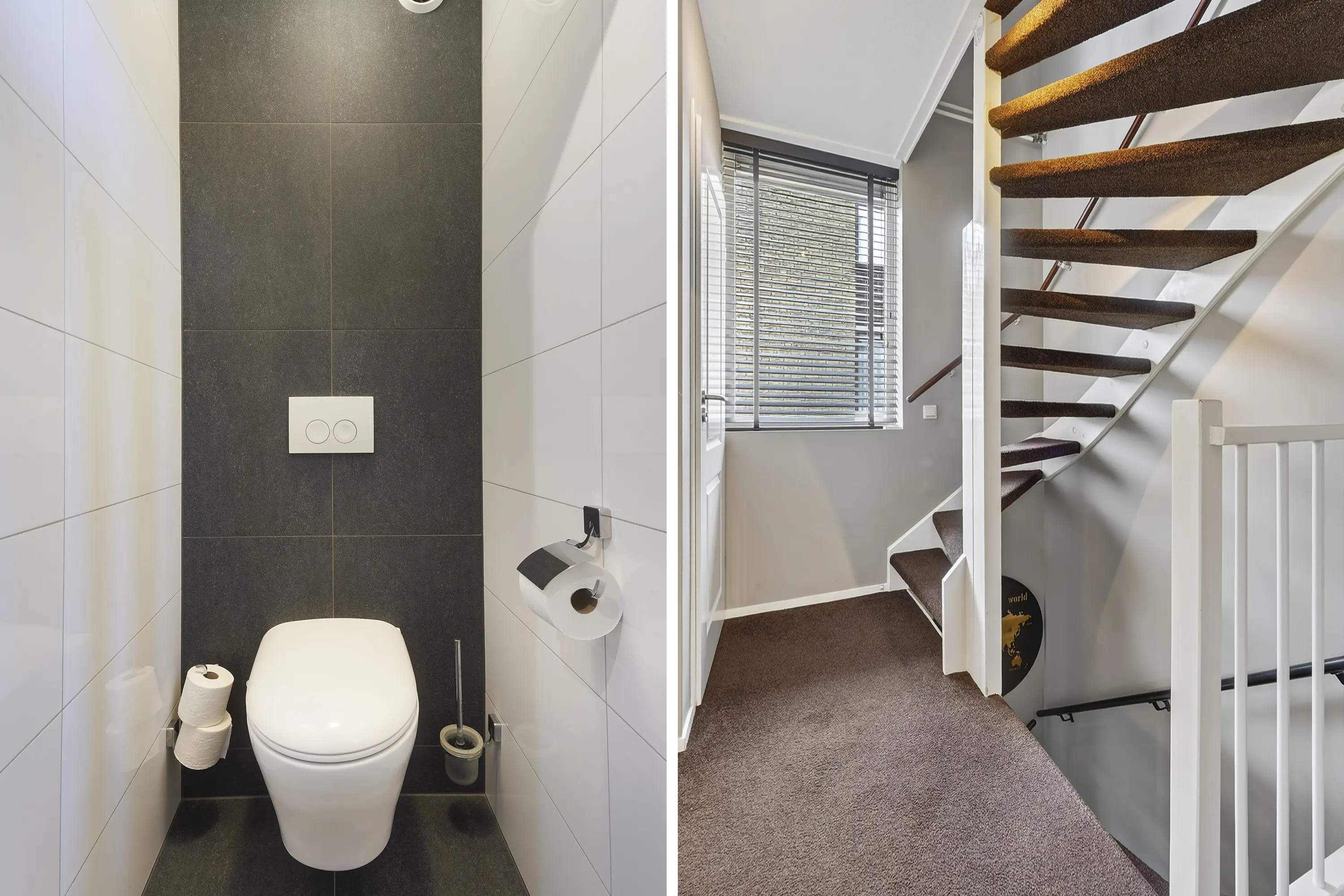 De gehele eerste en tweede verdieping, inclusief de trappen, is momenteel afgewerkt met tapijt, wat bijdraagt aan een warme en comfortabele sfeer.