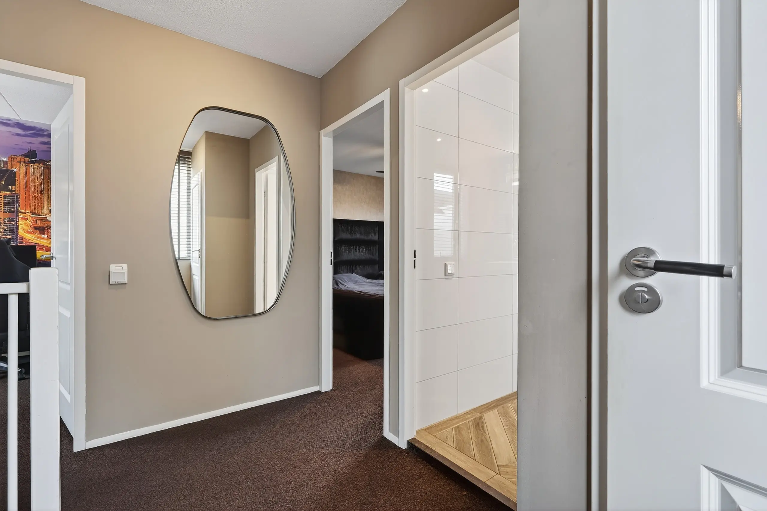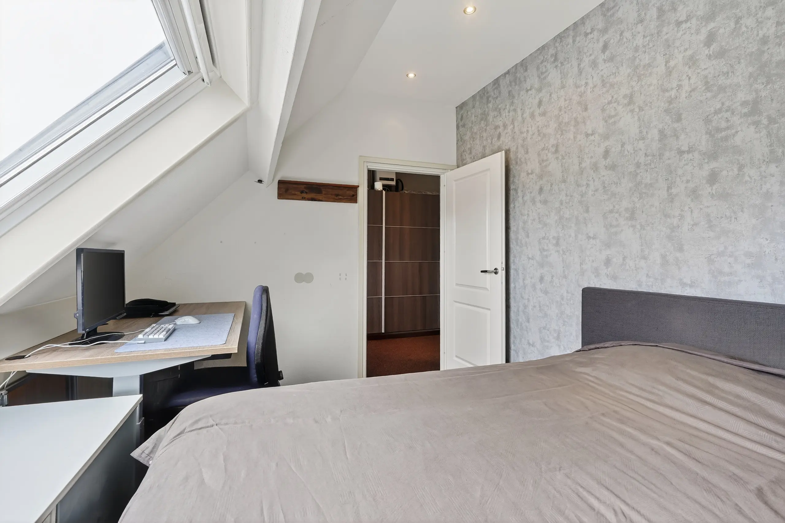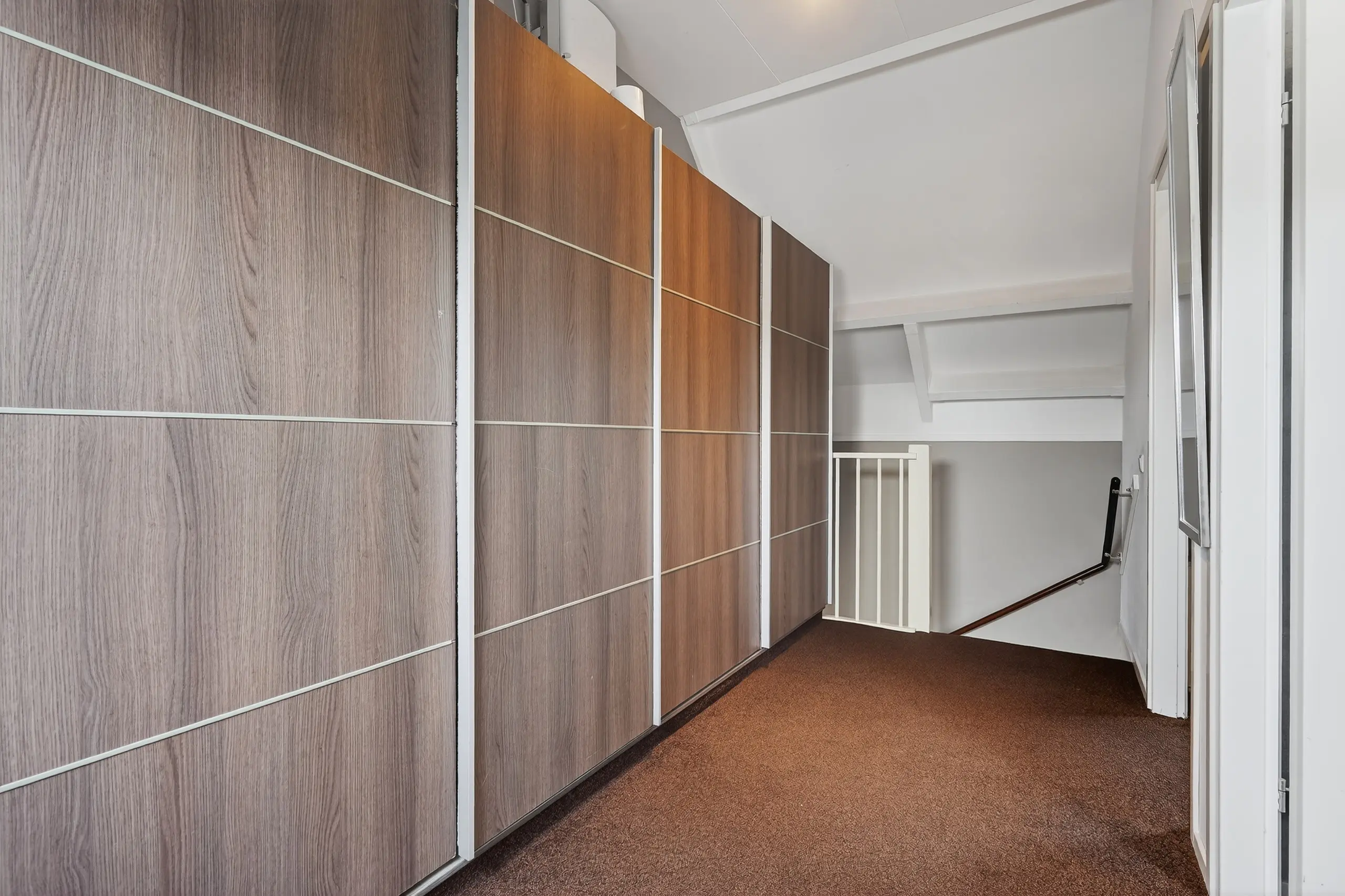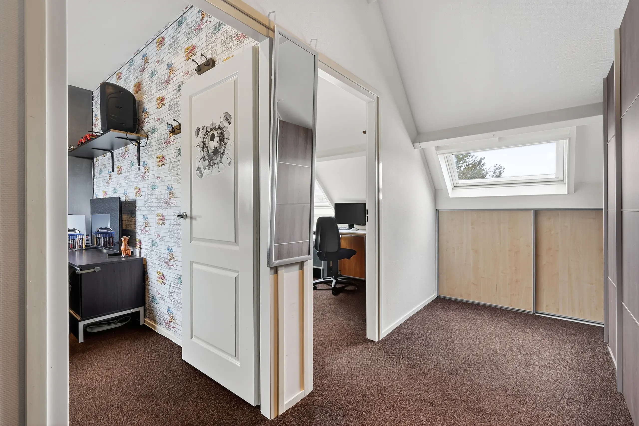 Wanneer u de tweede verdieping betreedt, komt u uit op een verrassend ruime overloop. Deze is voorzien van een royale kastenwand die zich uitstrekt over bijna de volledige lengte van de verdieping – een ideale oplossing voor extra opbergruimte. Dankzij het dakraam valt er prettig daglicht binnen, wat de ruimte licht en aangenaam maakt.