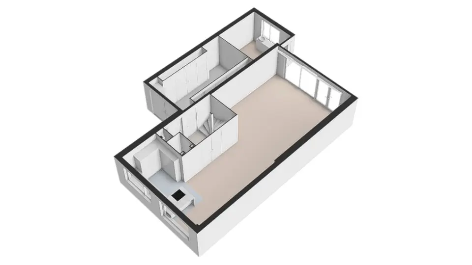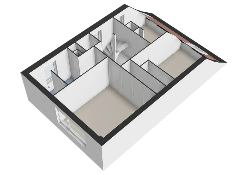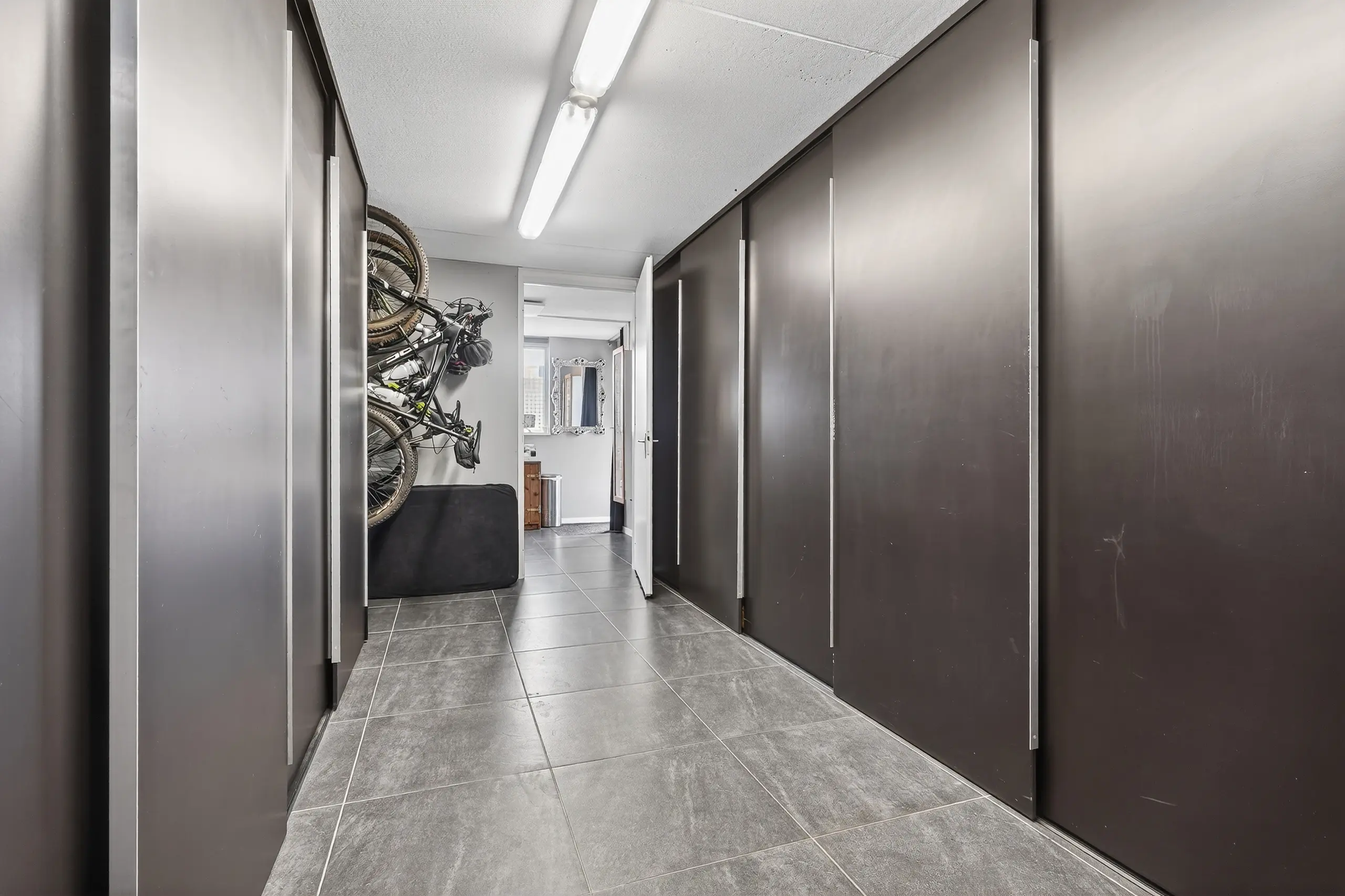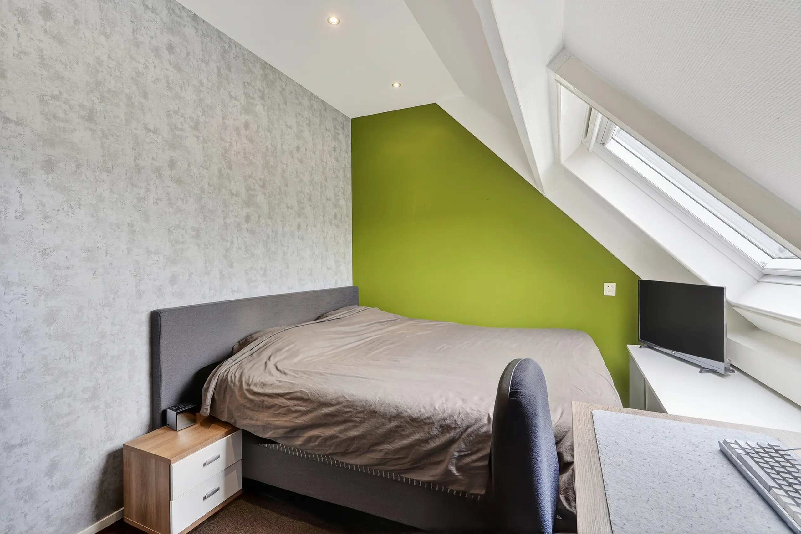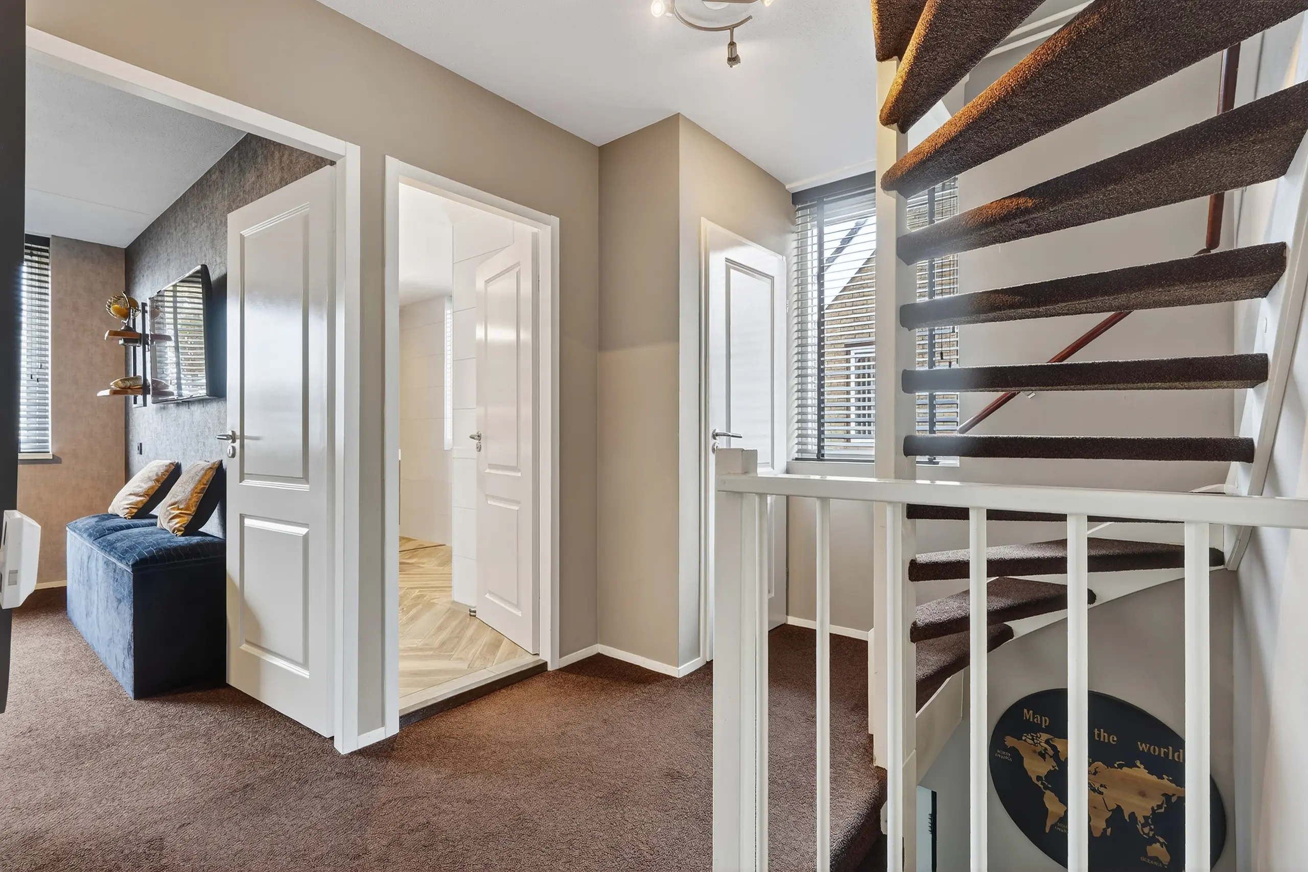 Wanneer u de tweede verdieping betreedt, komt u uit op een verrassend ruime overloop. Deze is voorzien van een royale kastenwand die zich uitstrekt over bijna de volledige lengte van de verdieping – een ideale oplossing voor extra opbergruimte. Dankzij het dakraam valt er prettig daglicht binnen, wat de ruimte licht en aangenaam maakt.