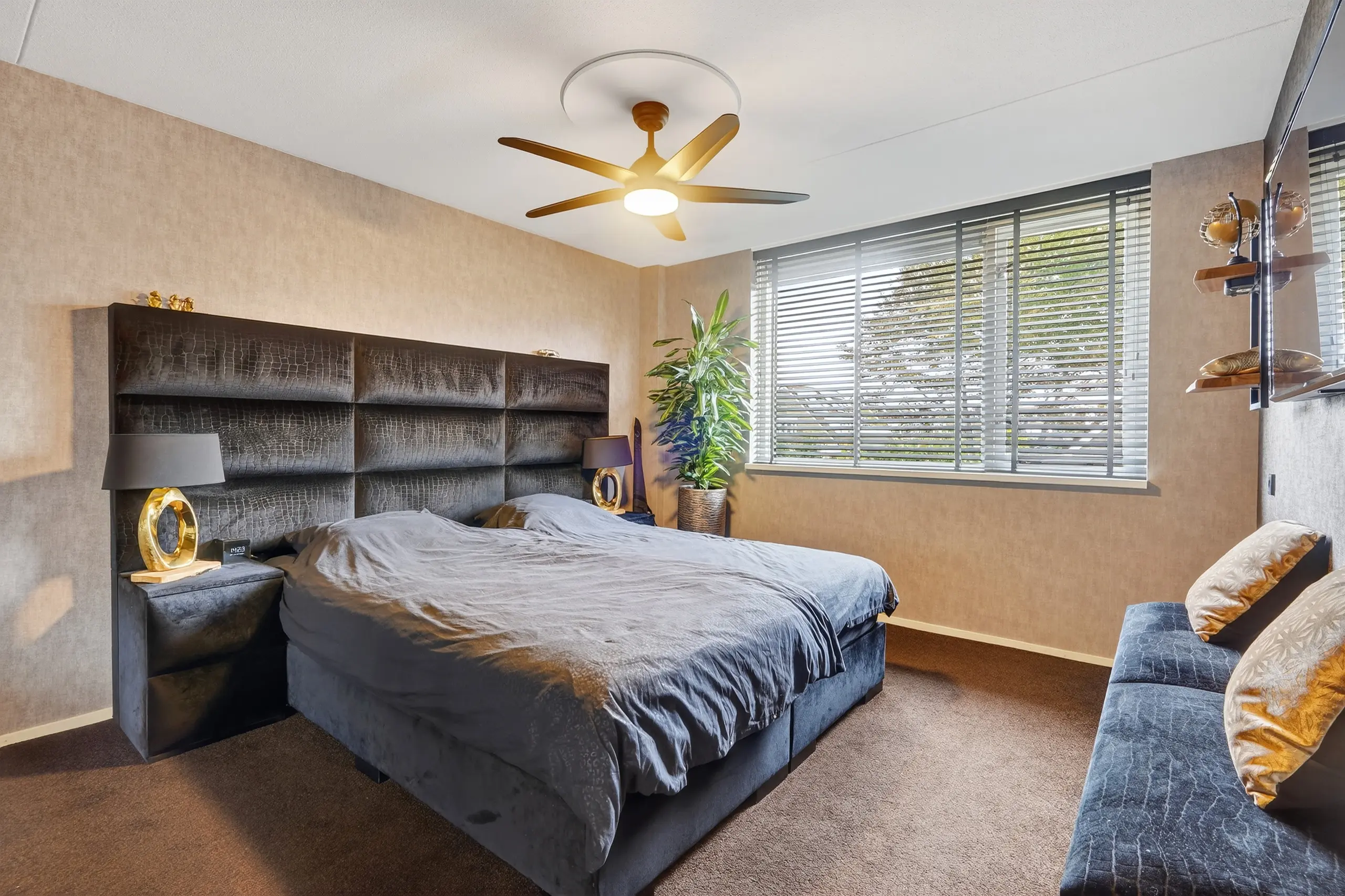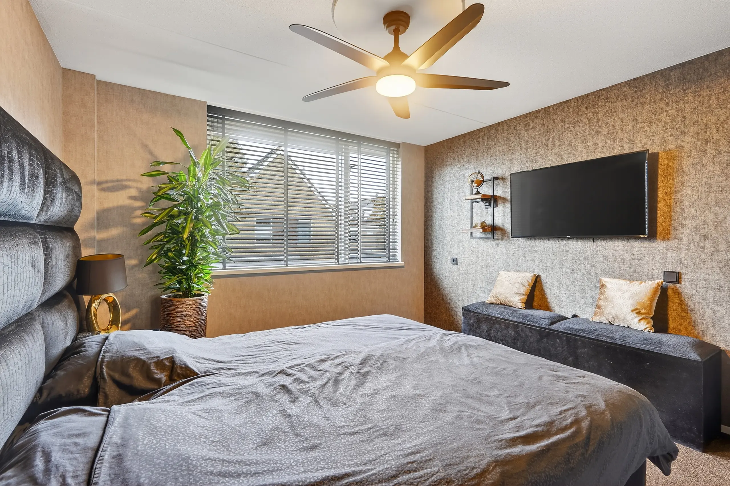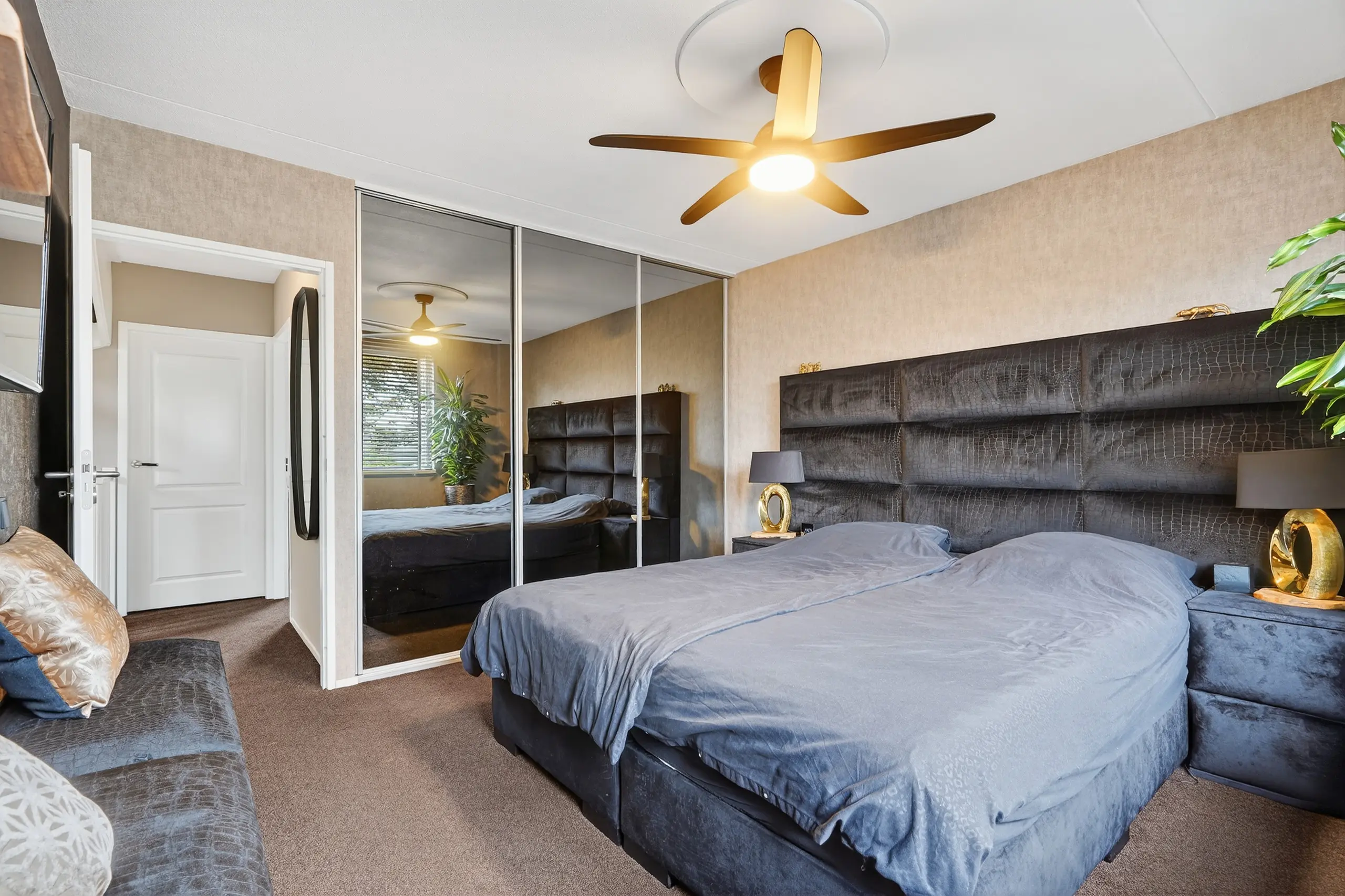 Aan de voorzijde van de woning bevindt zich de grootste slaapkamer. Bij binnenkomst valt direct de ruime kastenwand op, waarin ook een geïntegreerde spiegel is verwerkt. Dankzij het grote raam is er volop daglicht, wat u naar wens kunt reguleren met luxaflex raamdecoratie.
