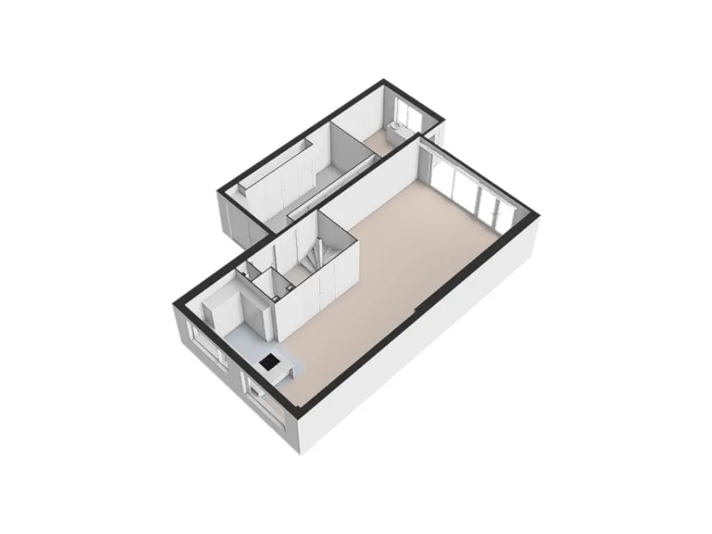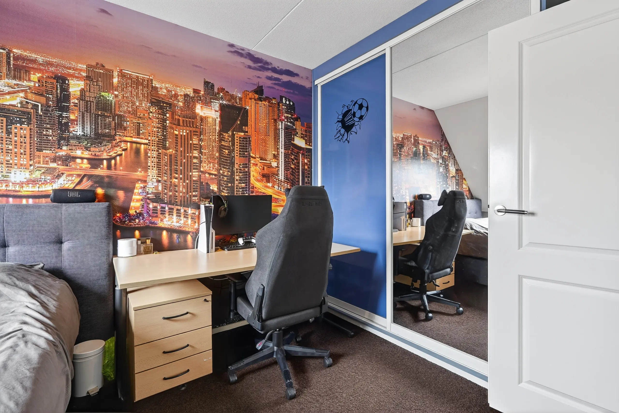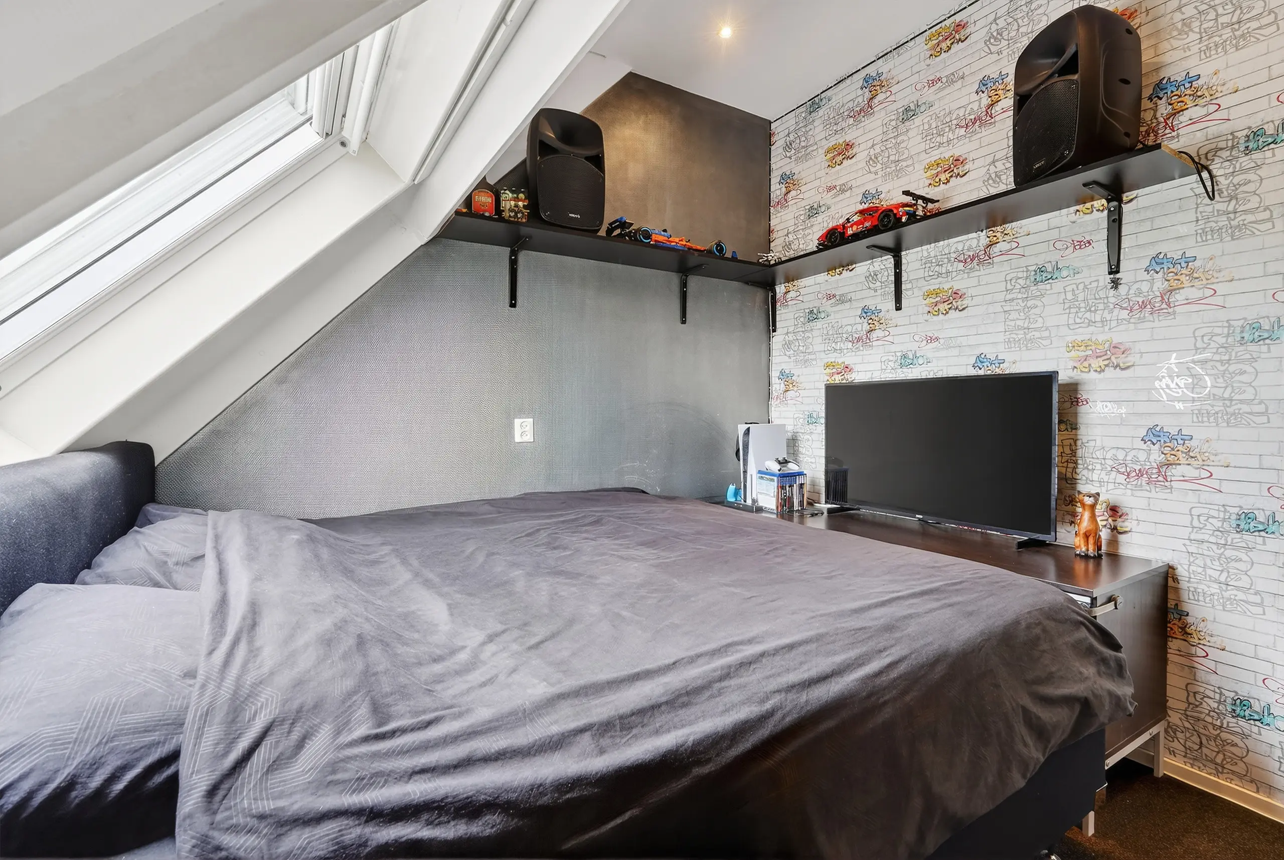Aan de voorzijde van de woning bevindt zich de grootste slaapkamer. Bij binnenkomst valt direct de ruime kastenwand op, waarin ook een geïntegreerde spiegel is verwerkt. Dankzij het grote raam is er volop daglicht, wat u naar wens kunt reguleren met luxaflex raamdecoratie.