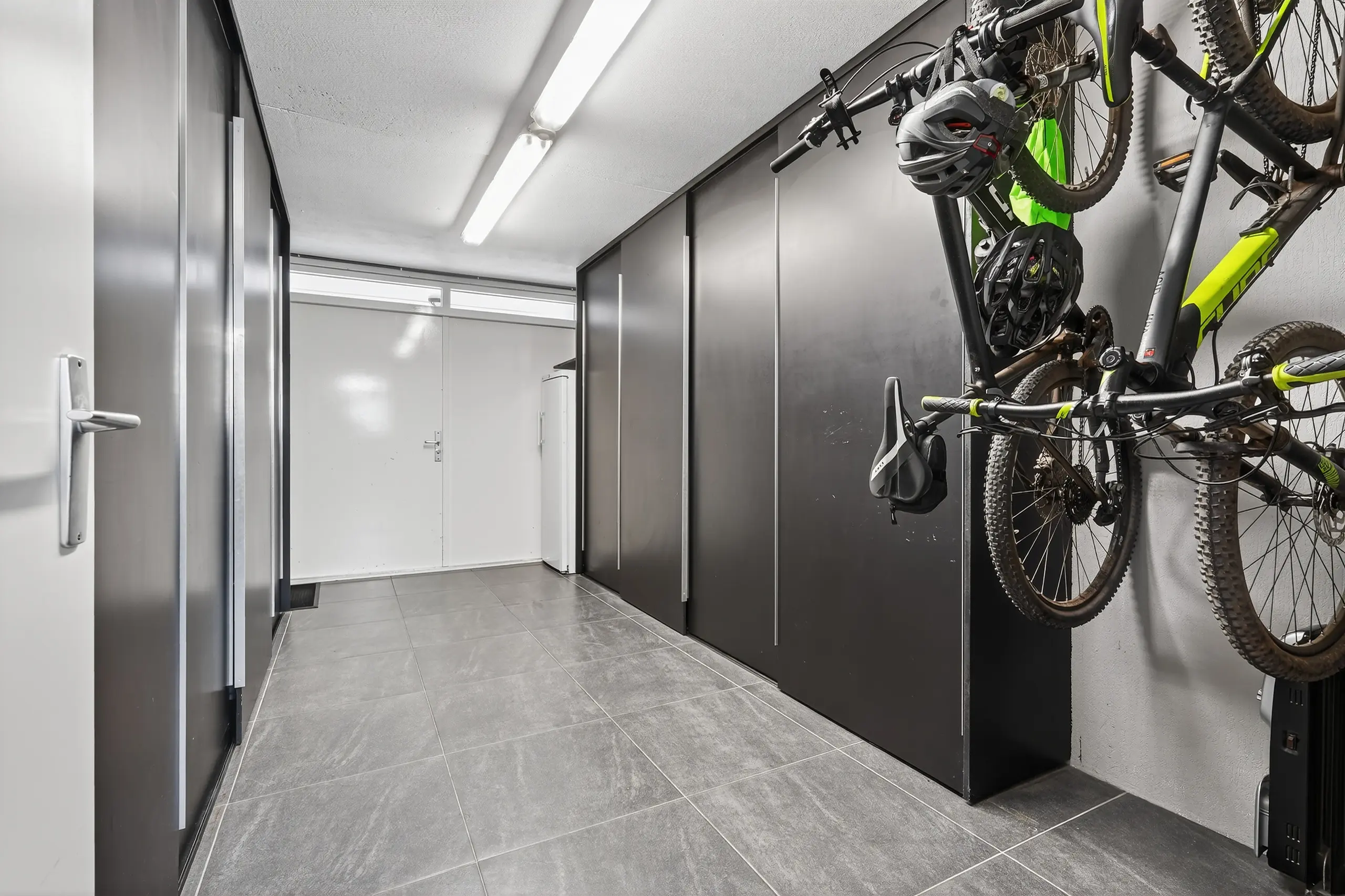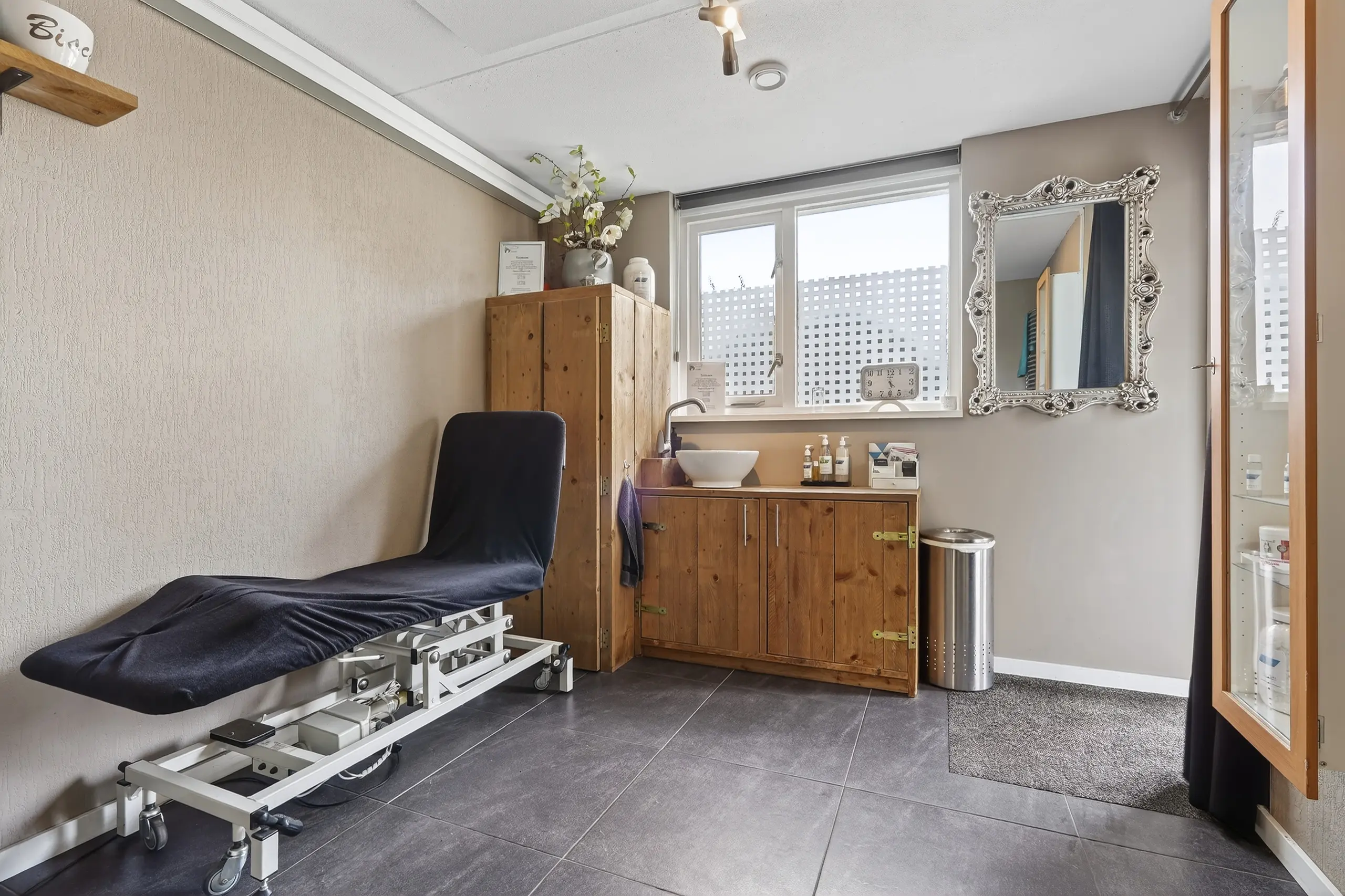 Via de hal is ook de garage te bereiken. Deze ruimte is bijzonder praktisch ingedeeld en voorzien van een grote kastenwand over de volledige lengte, ideaal voor het opbergen van fietsen, scooters, voorraad of andere spullen. Aan het einde van de garage bevindt zich een verrassende extra ruimte, momenteel in gebruik als praktijkruimte. Deze lichte en comfortabele ruimte biedt talloze mogelijkheden en is ideaal voor wie aan huis wil werken, een eigen praktijkruimte zoekt of een rustige plek nodig heeft voor creatieve of ontspannende activiteiten. Tevens zijn hier aansluitingen voor wasmachine en droger aanwezig, en via deze ruimte is er ook directe toegang tot de tuin.