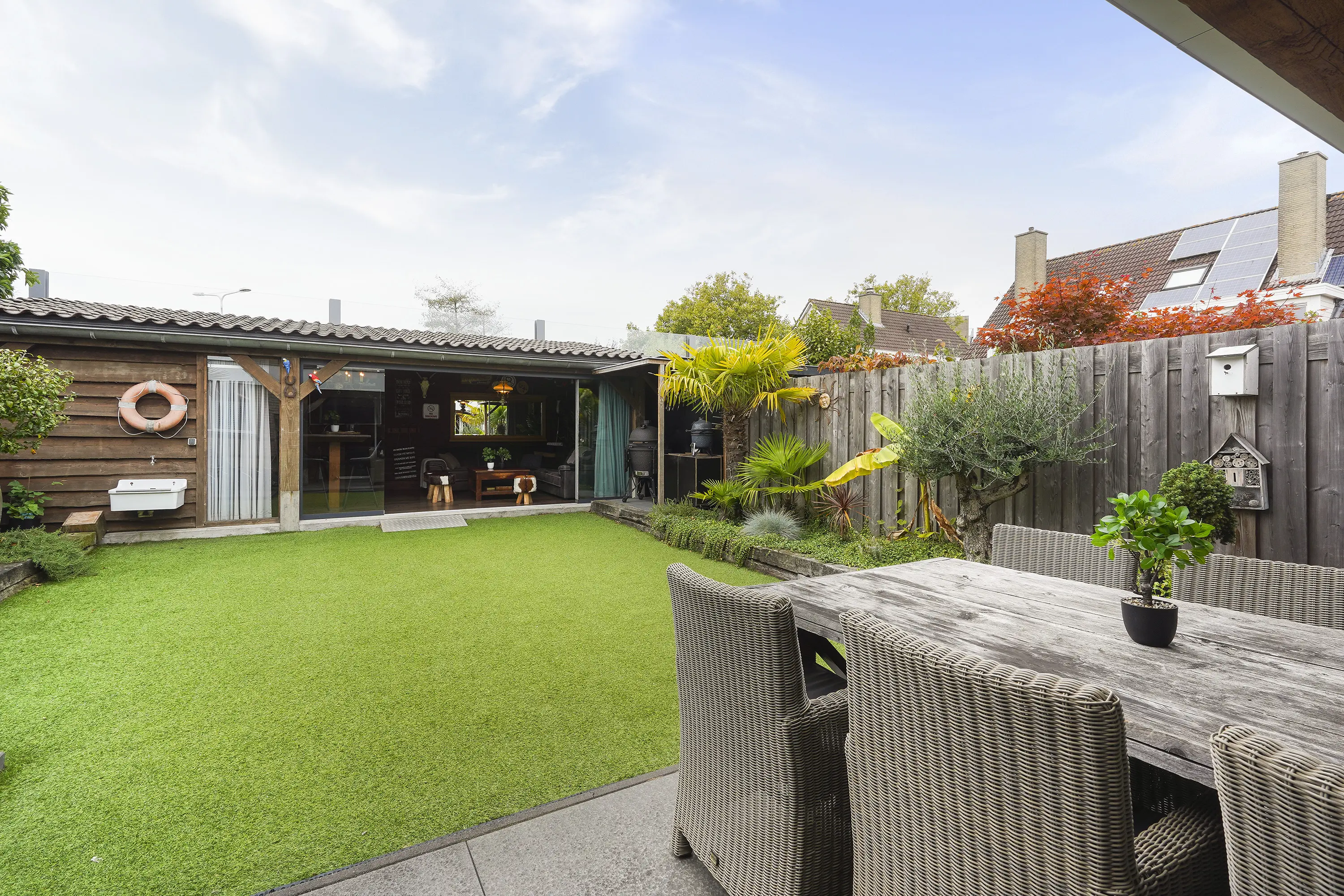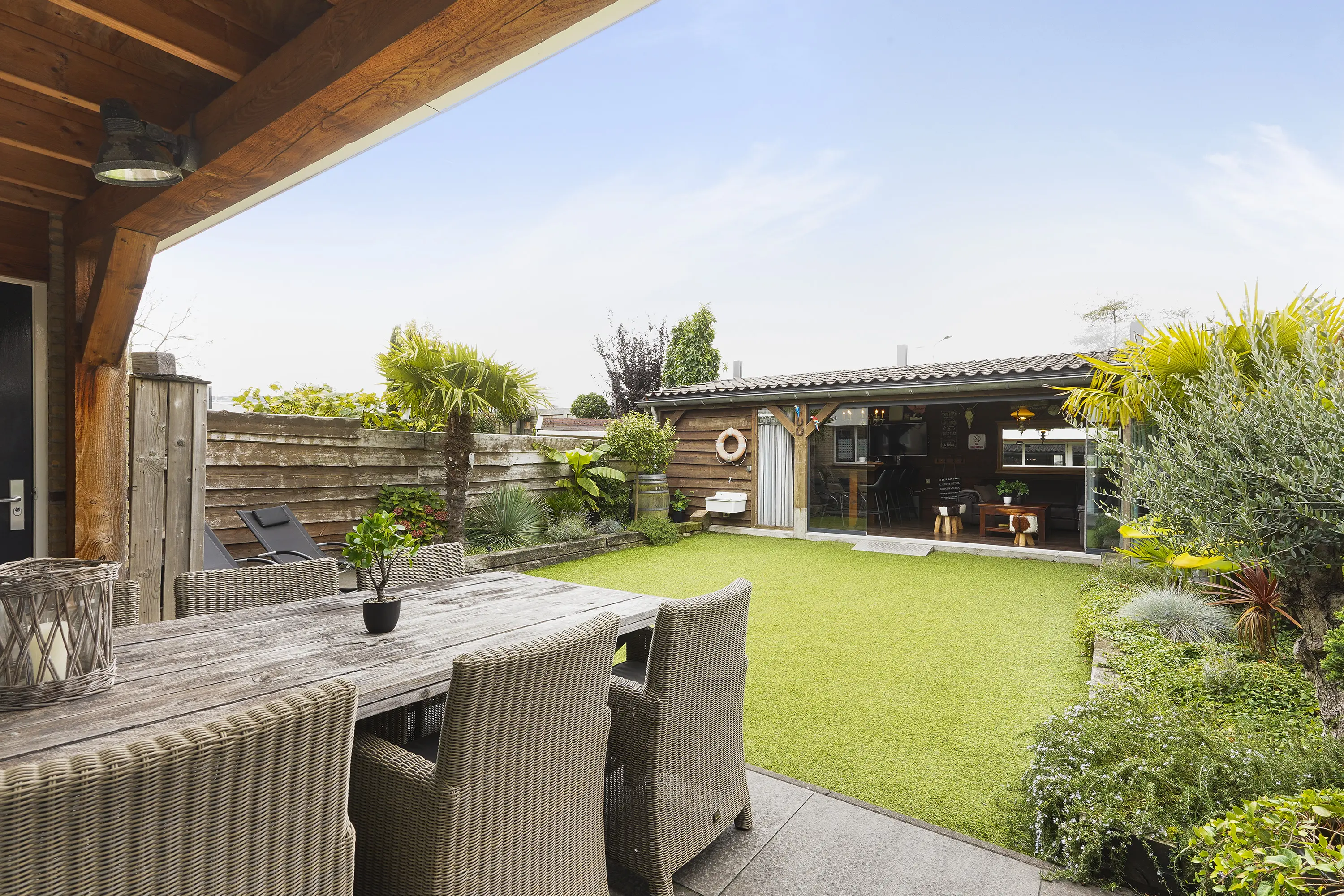 De achtertuin, gesitueerd op het zuidwesten, heeft een ruim terras, deels onder een overkapping, en een grasveld (kunstgras) met aan weerszijden beplanting in hardhouten plantenbakken.