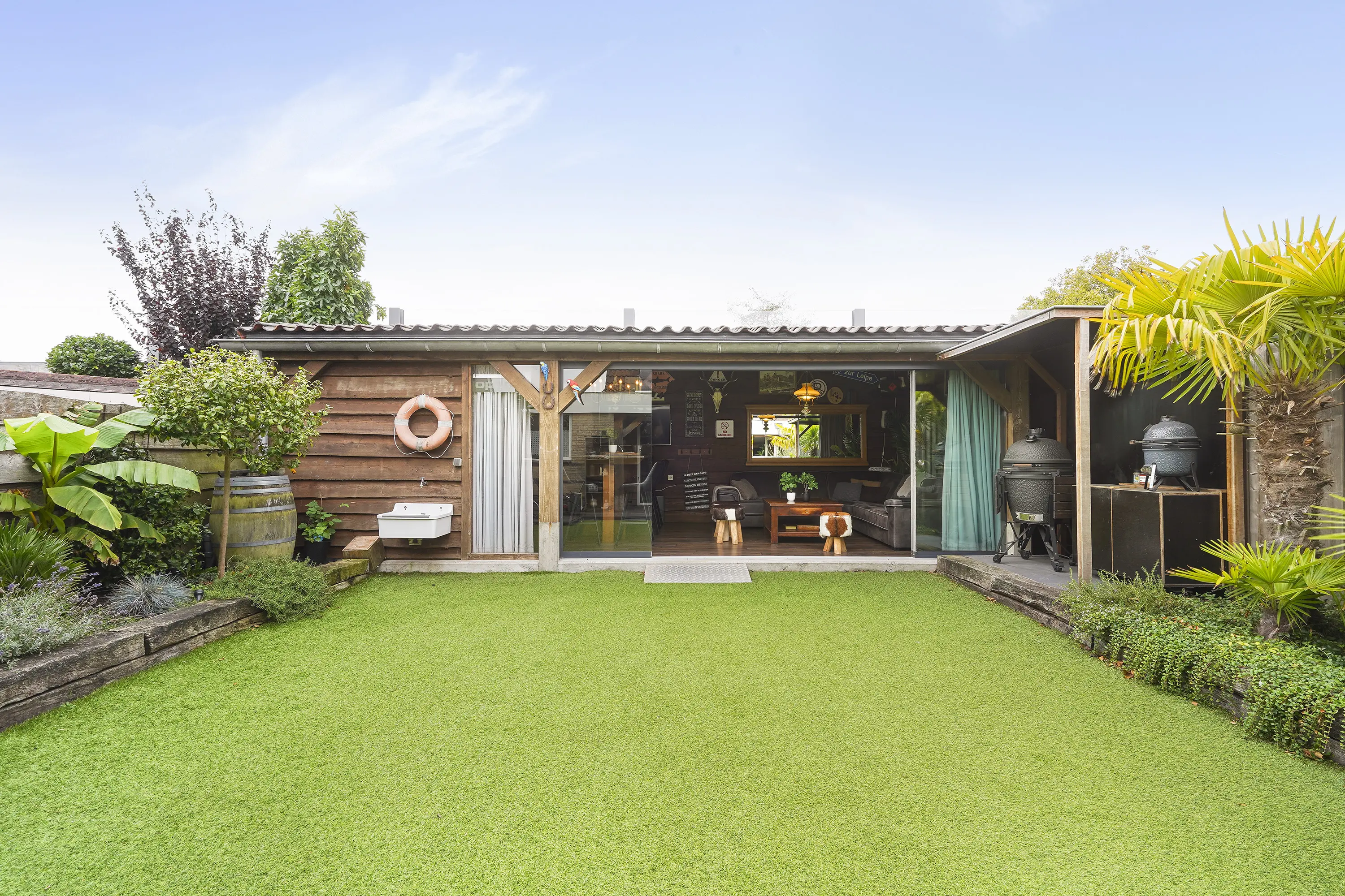 Een ander pluspunt van de tuin is de overdekte buitenkeuken – perfect voor zomerse barbecues of gezellige etentjes in de buitenlucht.