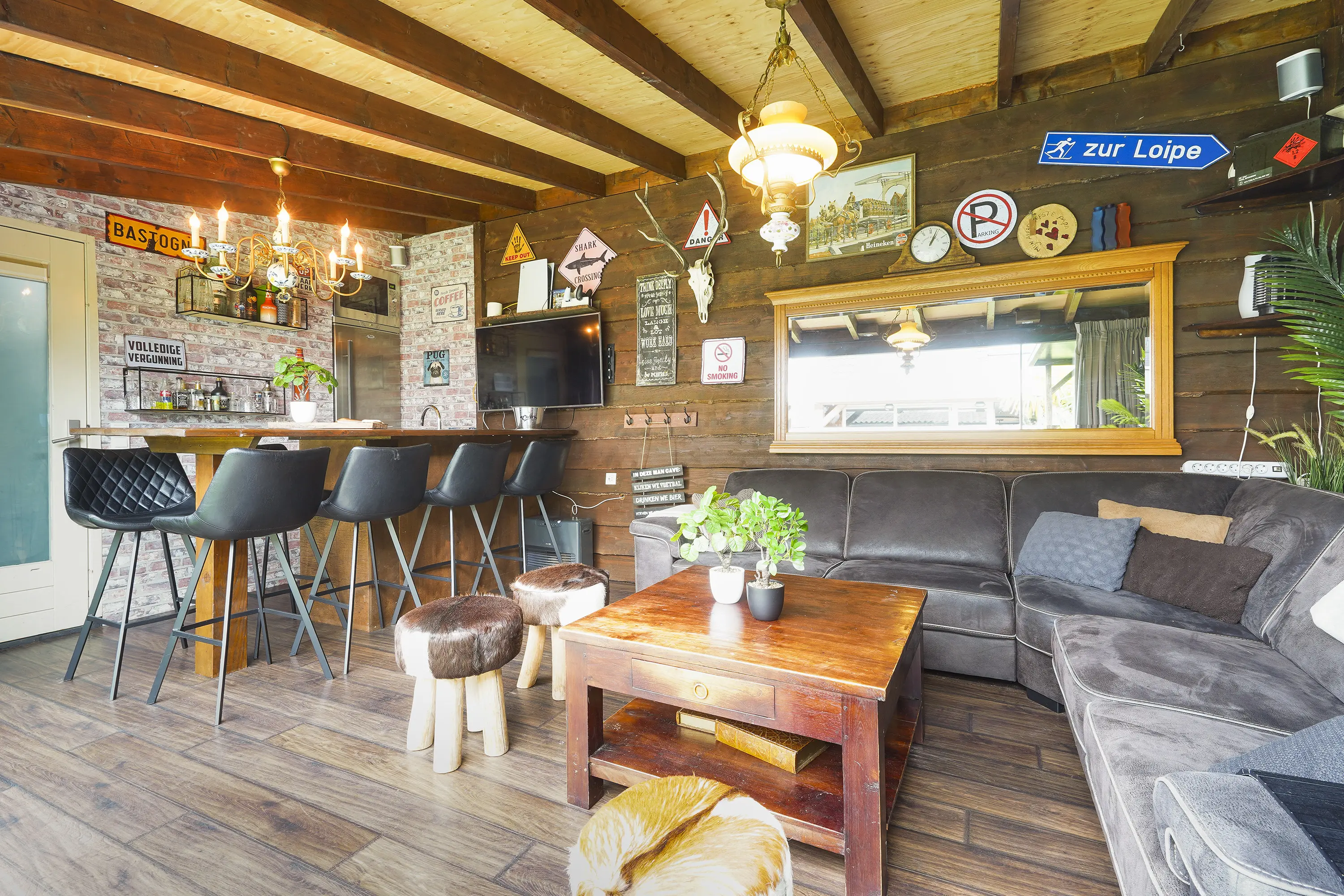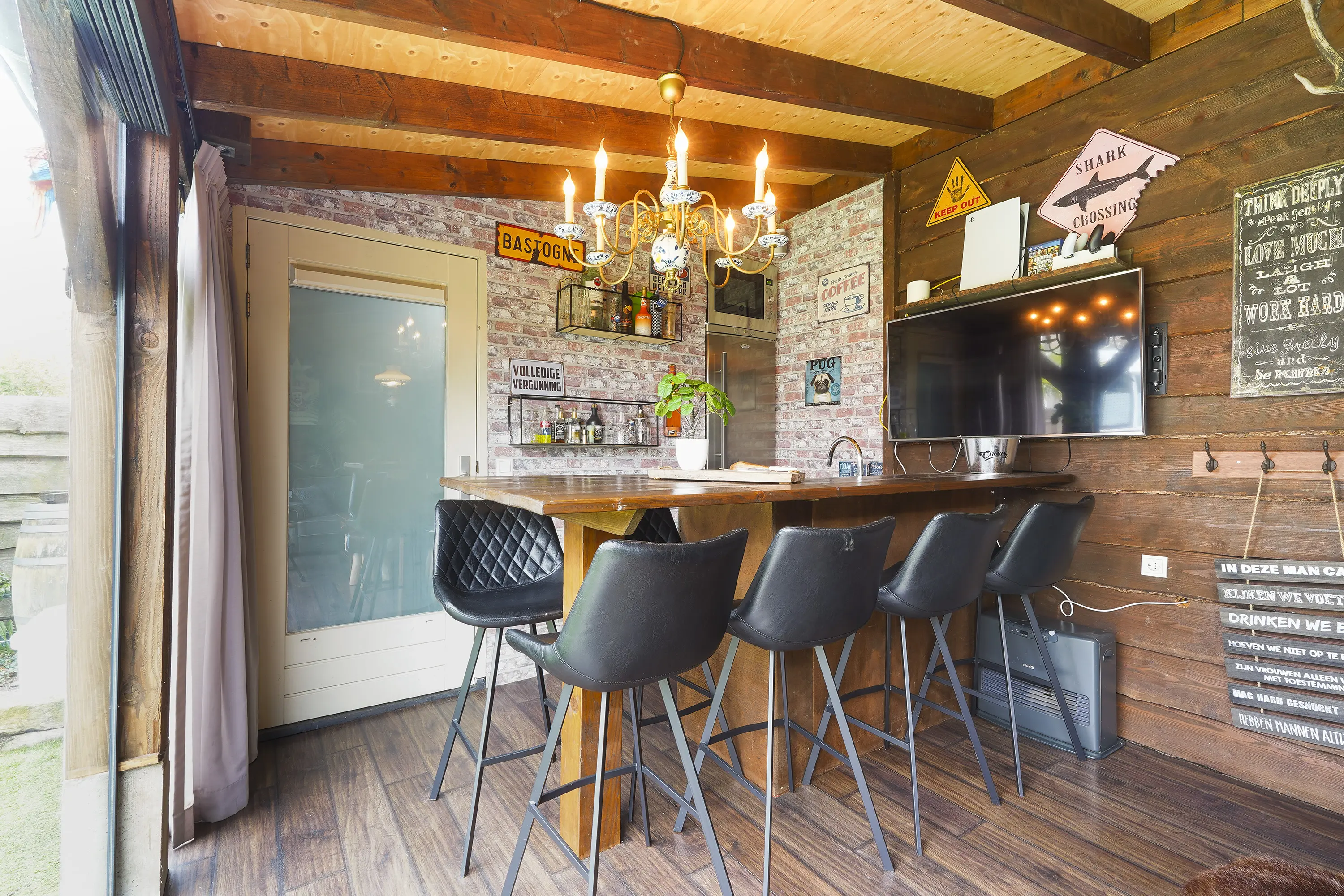 Achterin de tuin is het heerlijk vertoeven in de luxe veranda, met glazen schuifpui over de gehele breedte. Deze veranda is compleet ingericht met toiletruimte, bar, koel-/vriescombinatie en magnetron die netjes in de wand zijn weggewerkt.