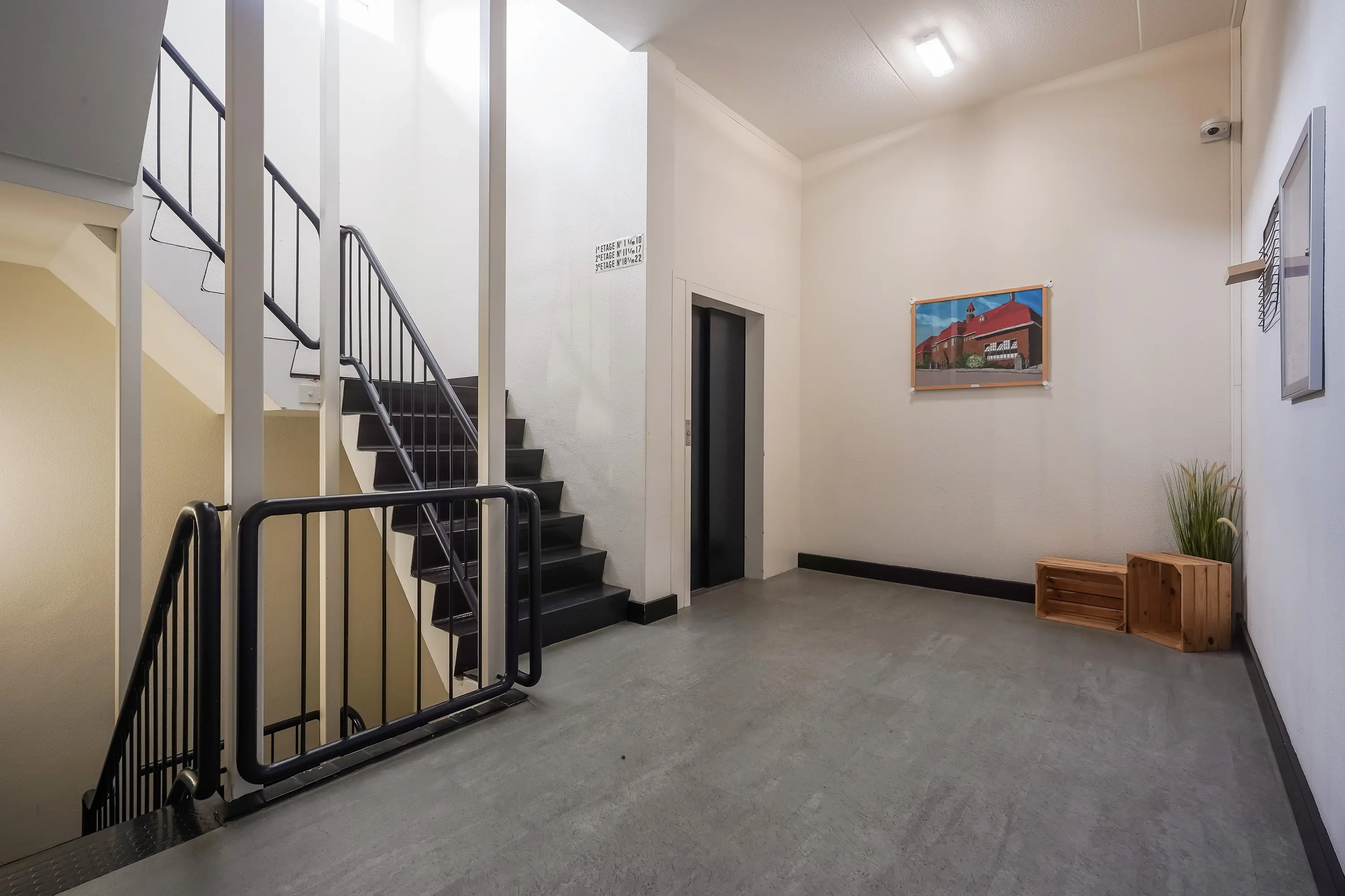 Gemeenschappelijke entree met brievenbussen en videofooninstallatie. De centrale hal geeft toegang tot de lift, het trappenhuis en de bergingen.