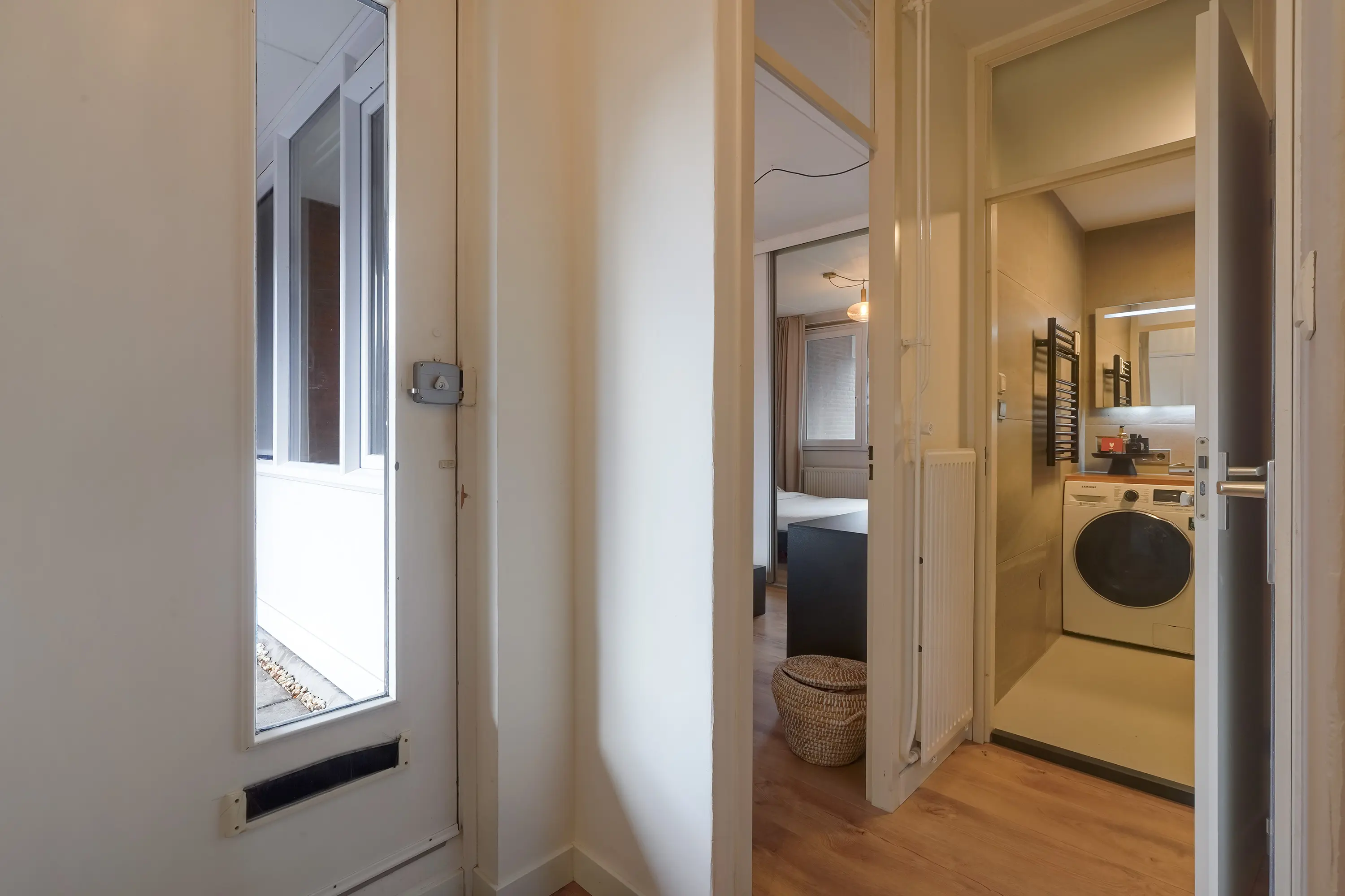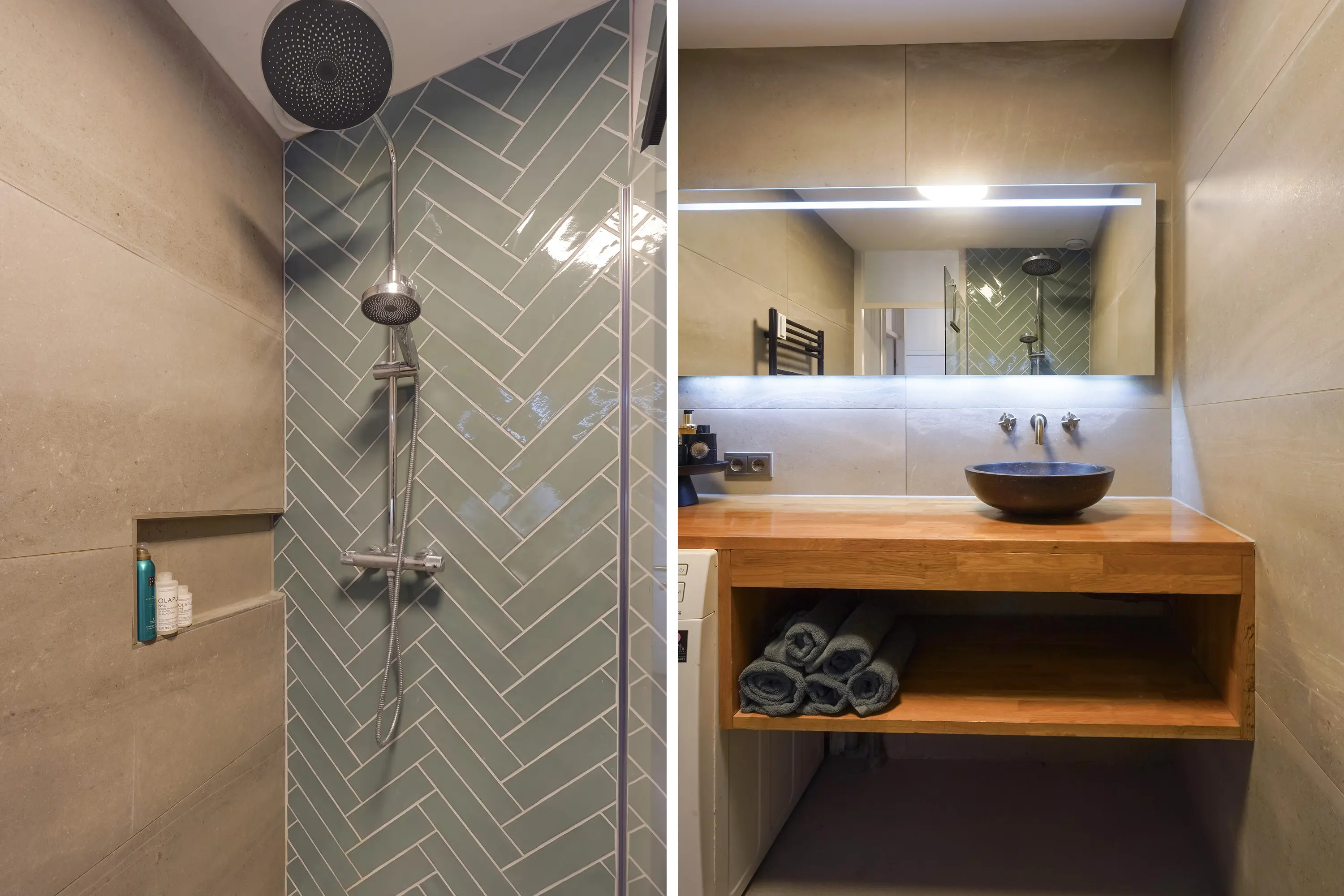 De badkamer (gedeeltelijk vernieuwd in 2025) is gelegen naast de slaapkamer en heeft een moderne uitstraling. Deze is uitgerust met een inloopdouche, wastafelmeubel en een aansluiting voor de wasmachine. De badkamer is afgewerkt met grijs gekleurde wandtegels, met in de inloopdouche een accentmuur met een turquoise tegel.