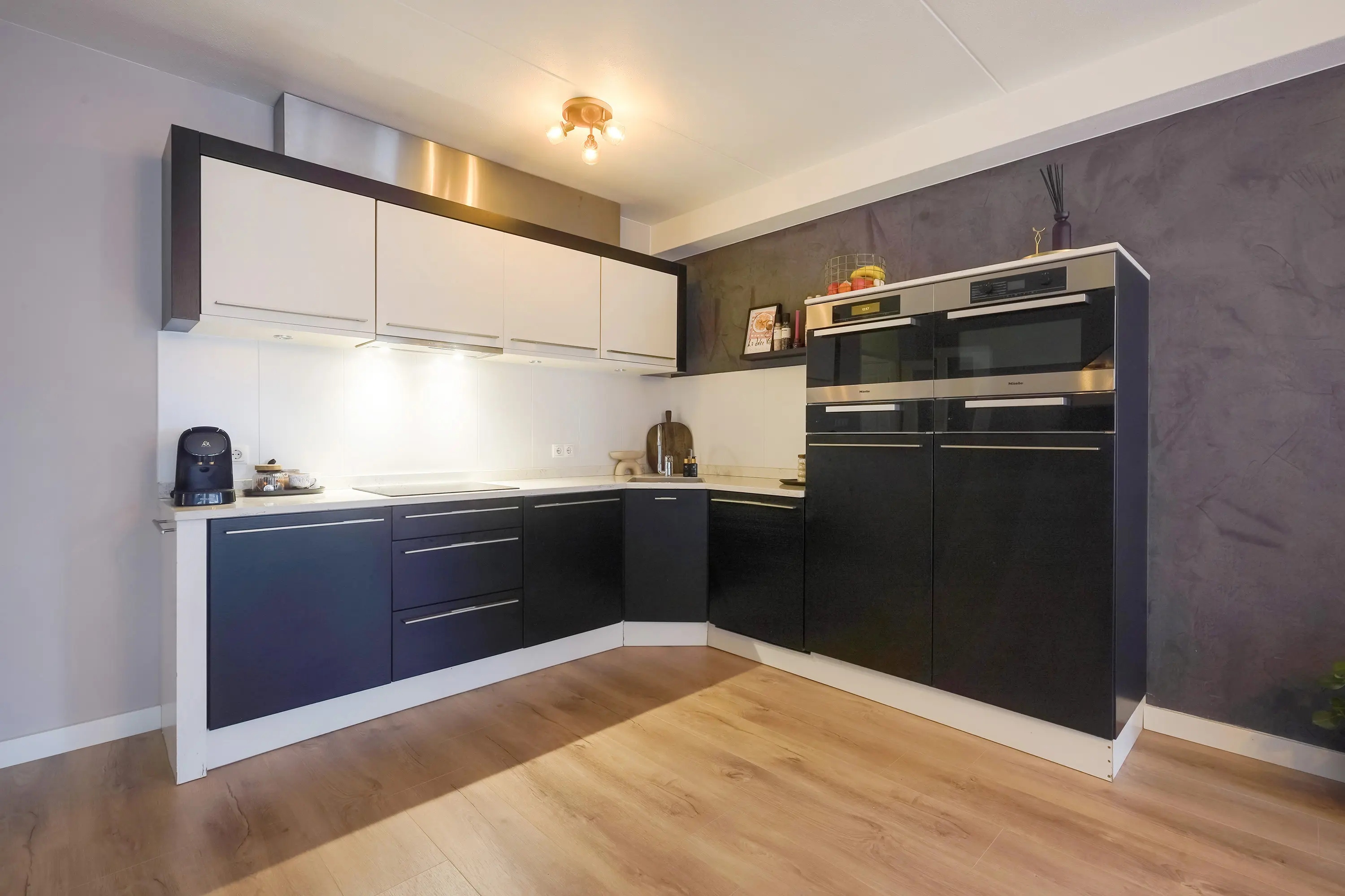 De open keuken heeft een moderne uitstraling in wit met zwarte accenten en is voorzien van diverse inbouwapparatuur, waaronder een inductiekookplaat, magnetron, oven, vaatwasser, koelkast en vriezer.