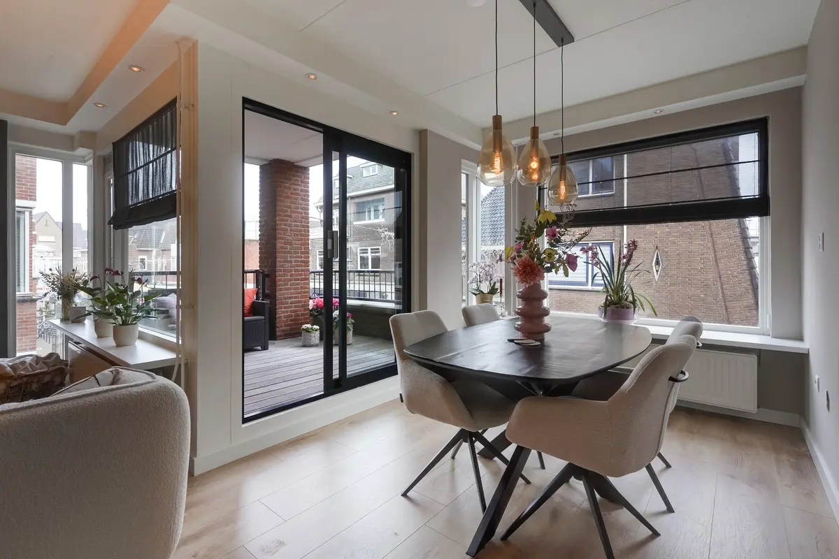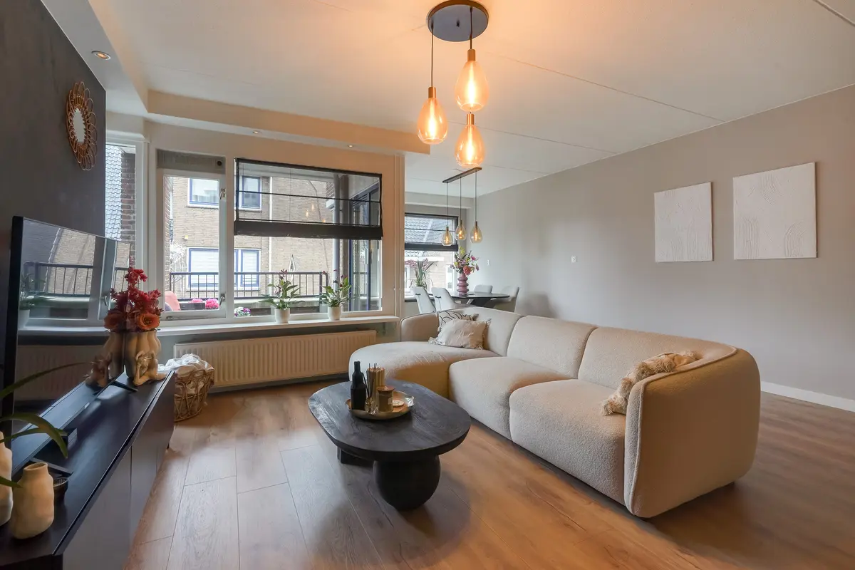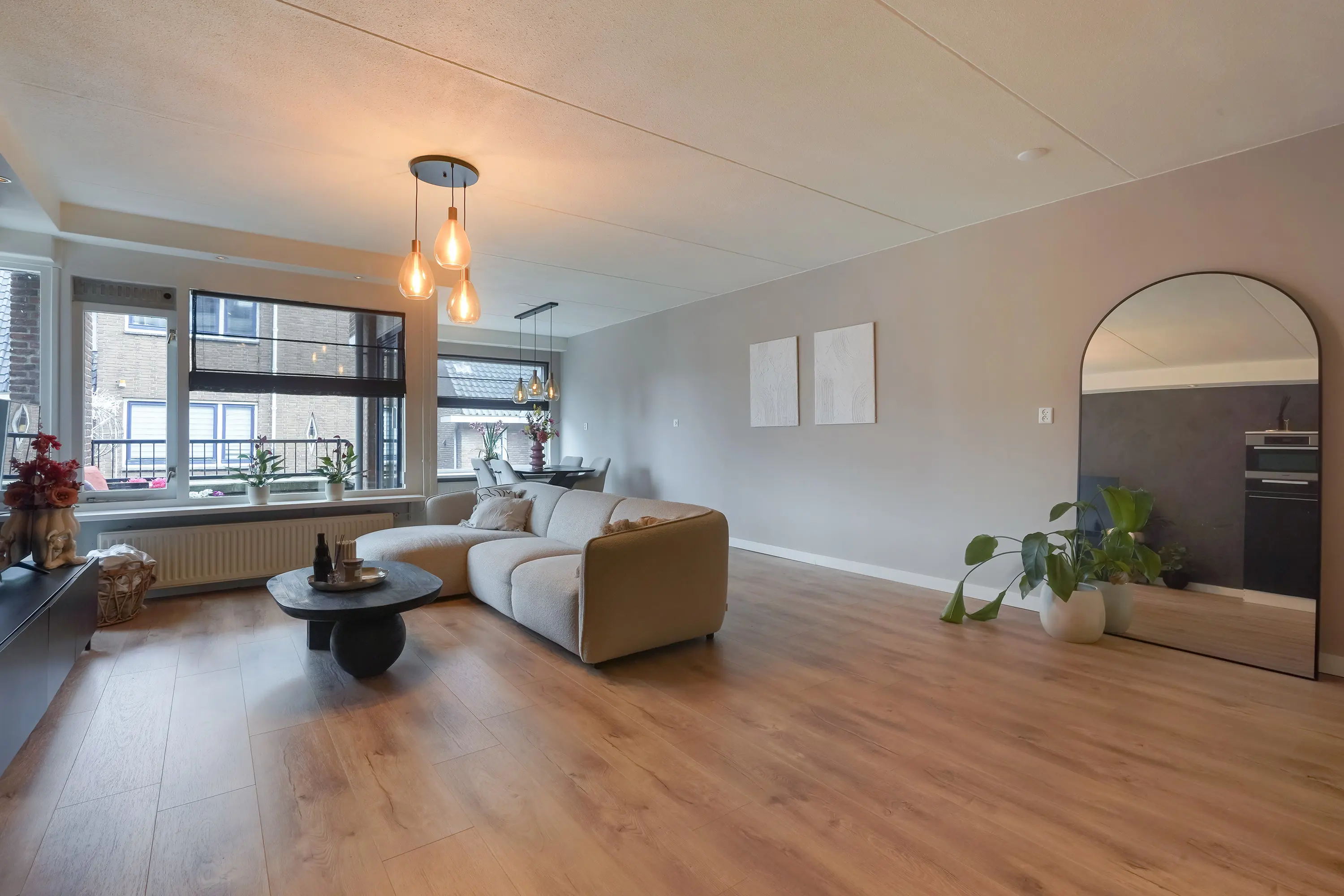 De woonkamer is bijzonder royaal en licht en volledig afgewerkt met een nette laminaatvloer. Aan de voorzijde bevindt zich de comfortabele zithoek, grenzend aan het balkon en de open keuken. Aan de achterzijde is de eethoek gesitueerd bij de grote glazen pui, die zorgt voor een prettige en natuurlijke lichtinval. Het balkon is gelegen op het oosten en biedt een mooi uitzicht over de sfeervolle straat.