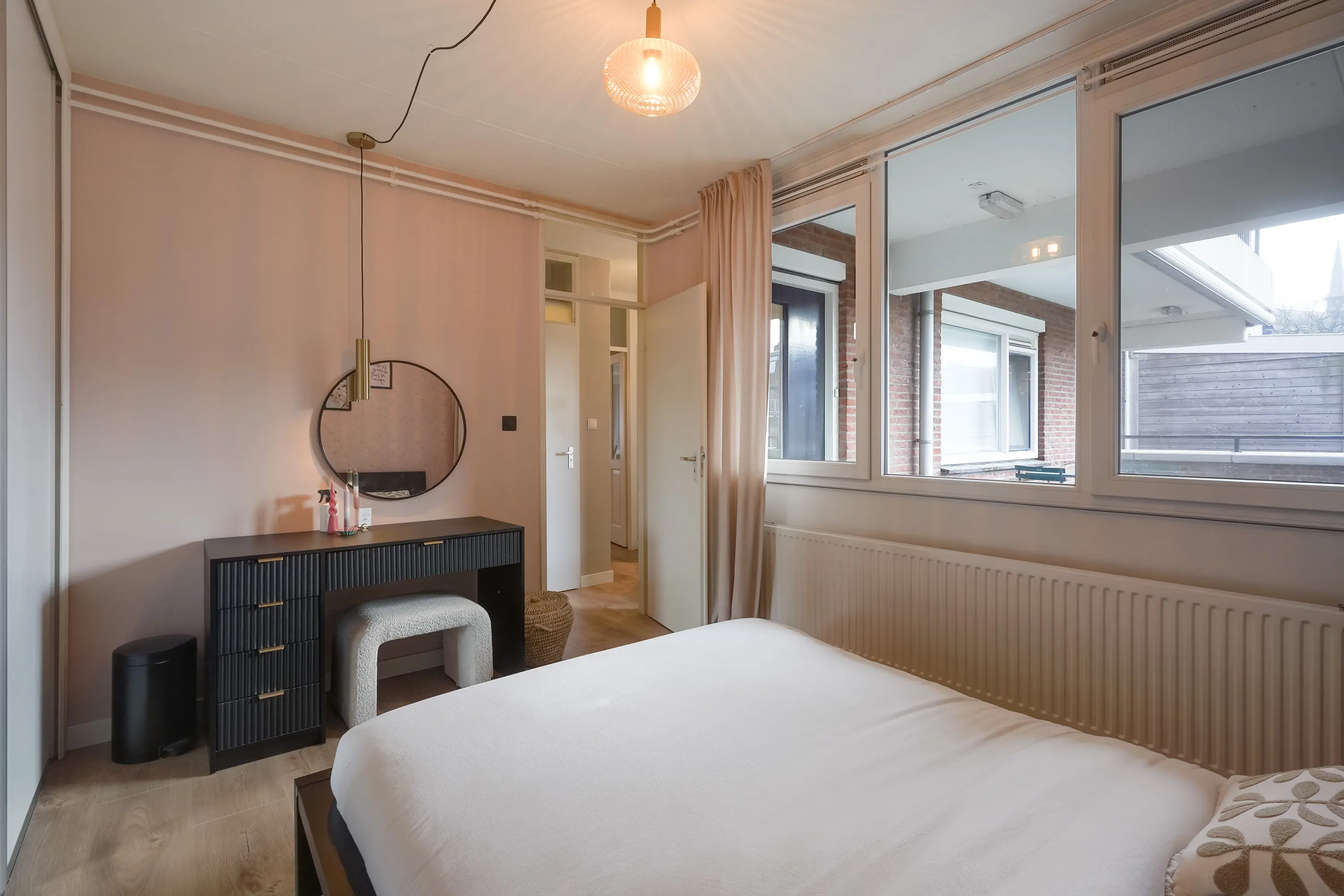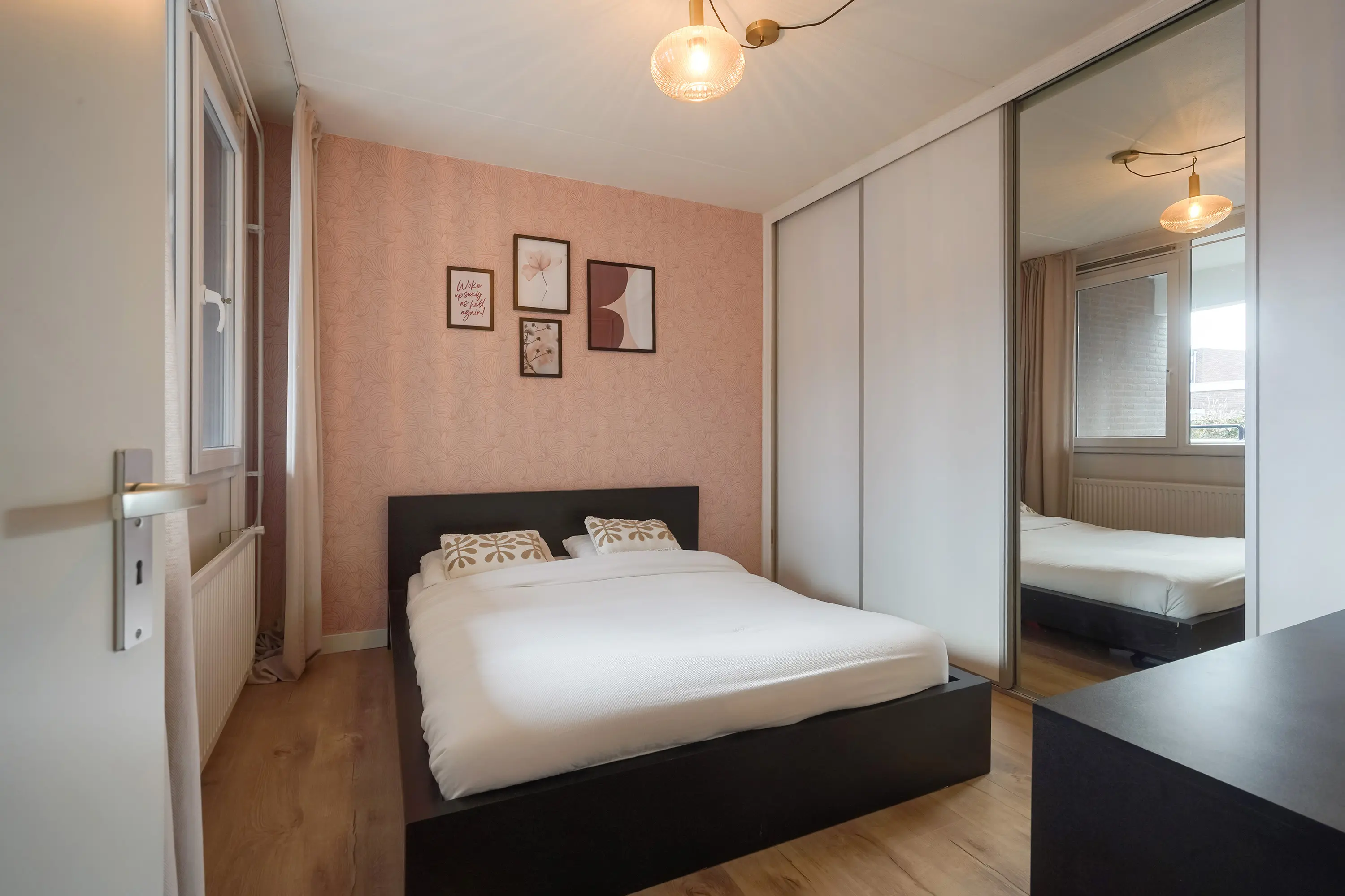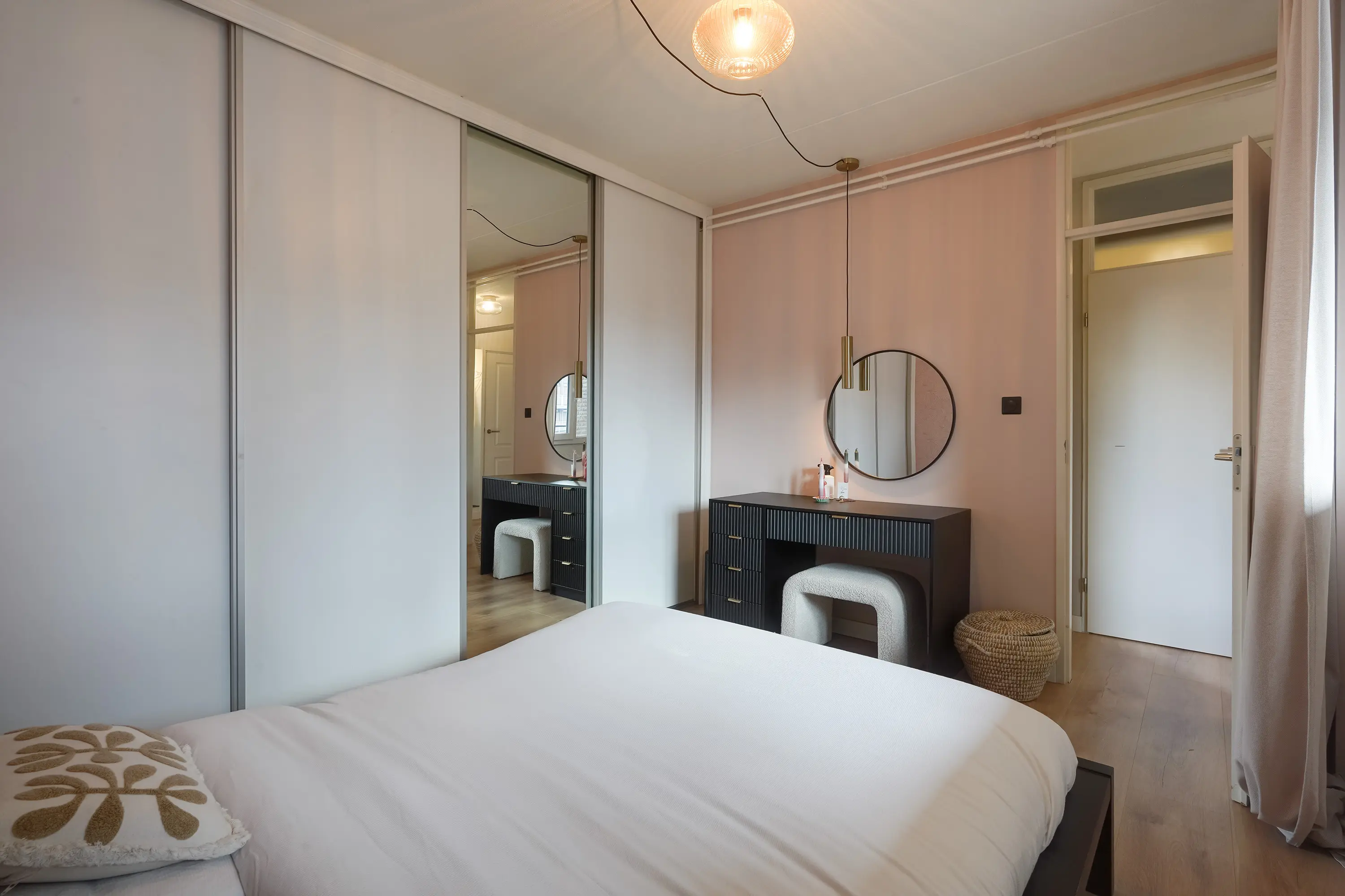 De slaapkamer beschikt over een grote raampartij, wat zorgt voor voldoende daglicht. Daarnaast is hier een ruime kastenwand aanwezig, ideaal voor het opbergen van kleding.