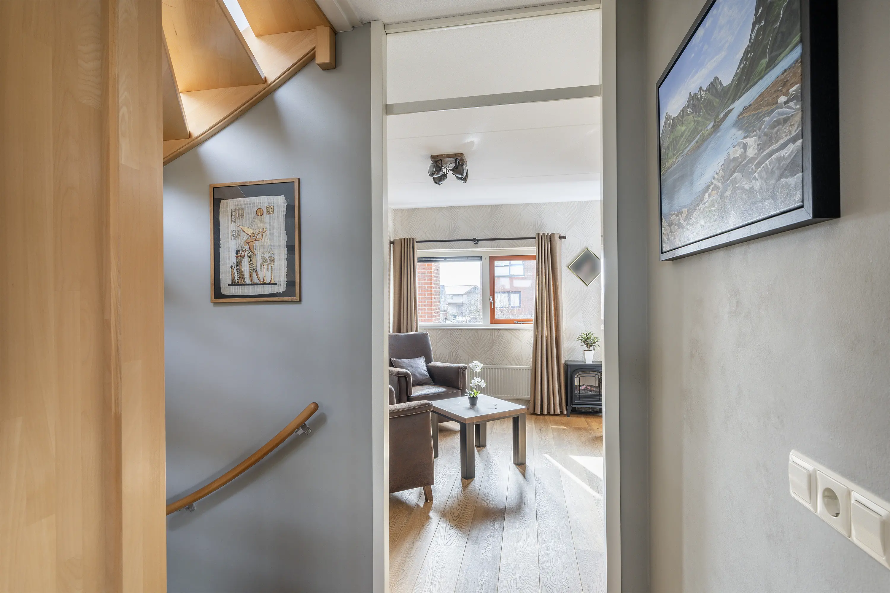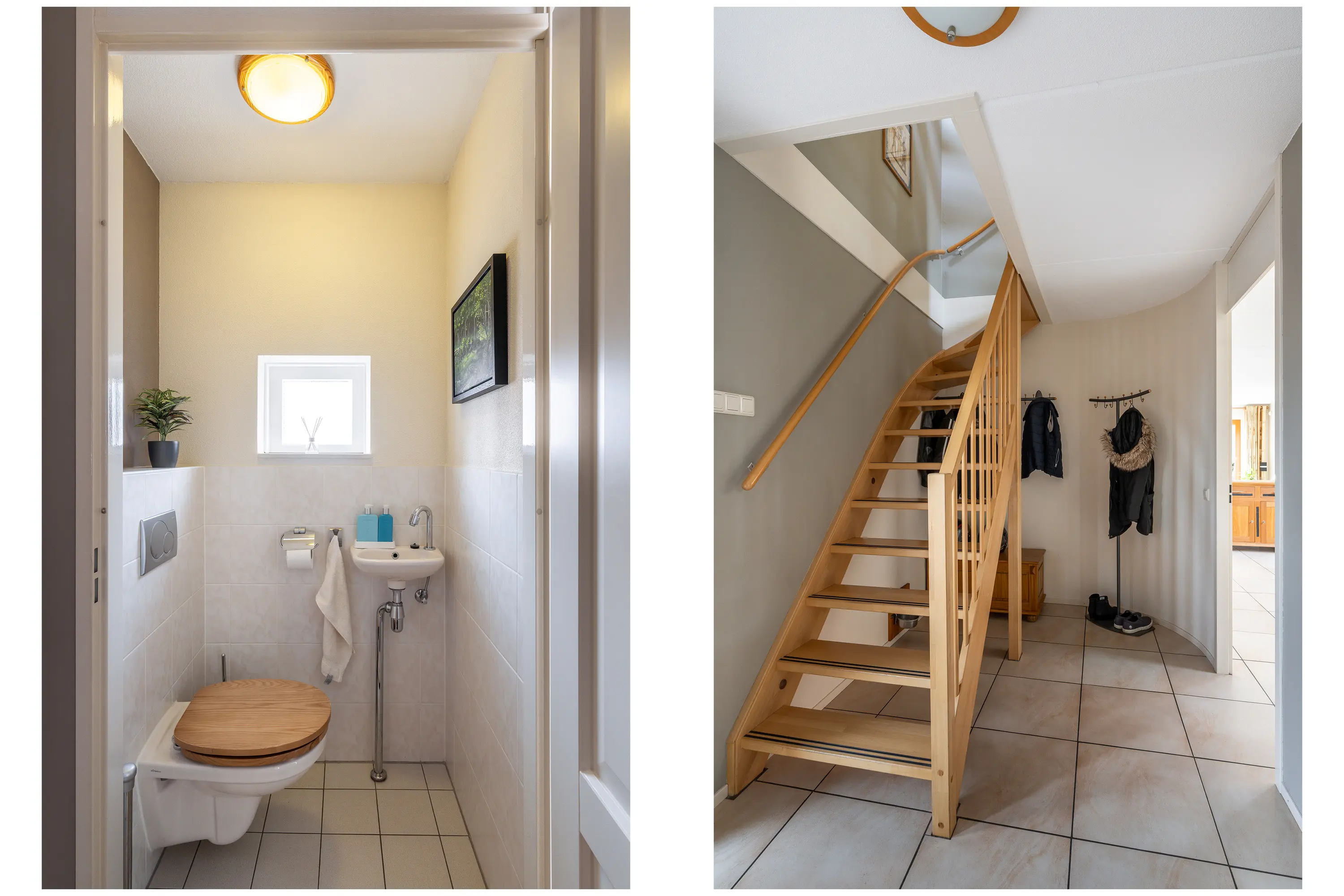 Kom binnen in de royale hal met garderobe, het toilet met fonteintje, de meterkast, de trapopgang naar de eerste verdieping en toegang tot de woonkamer.