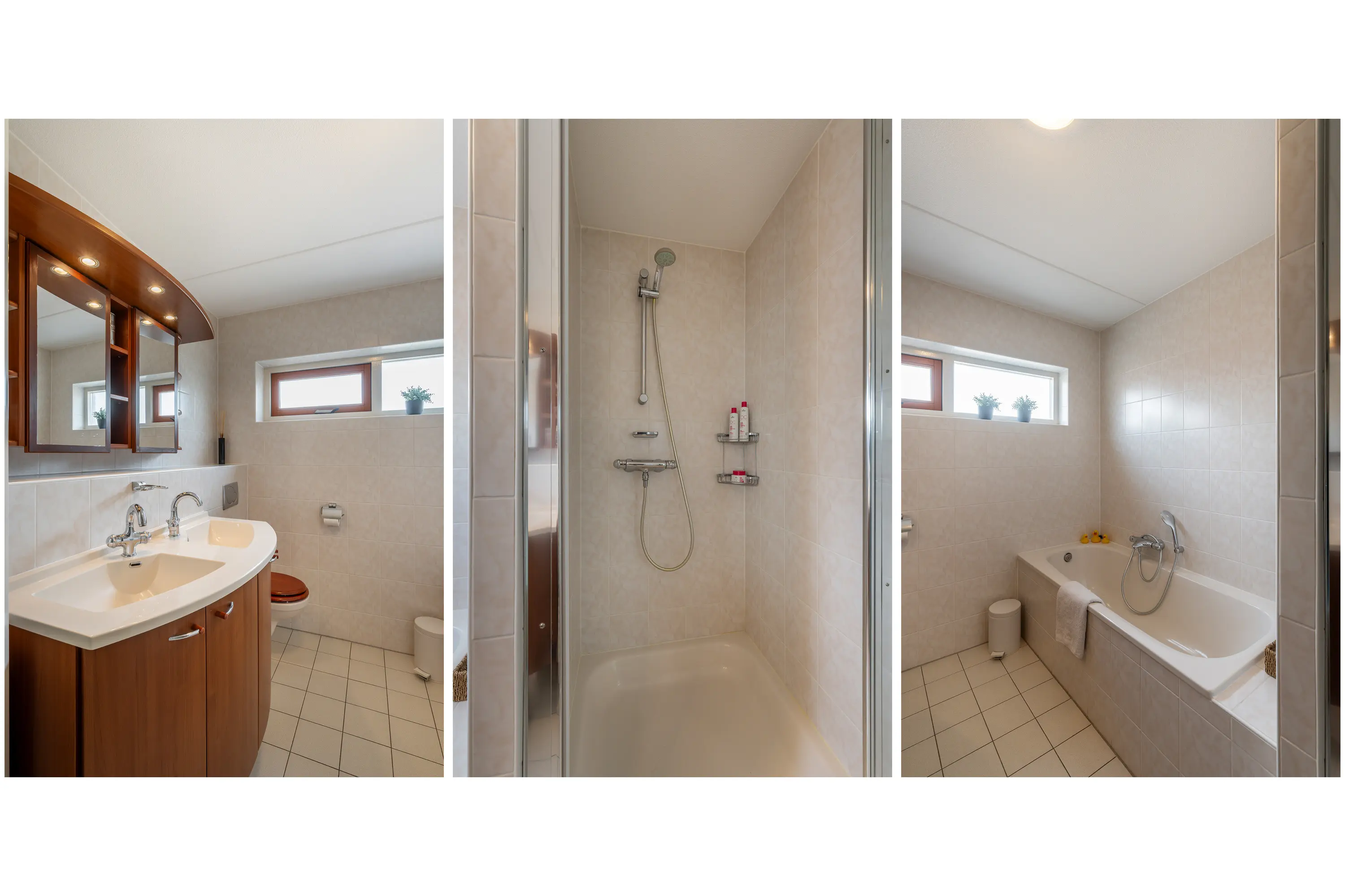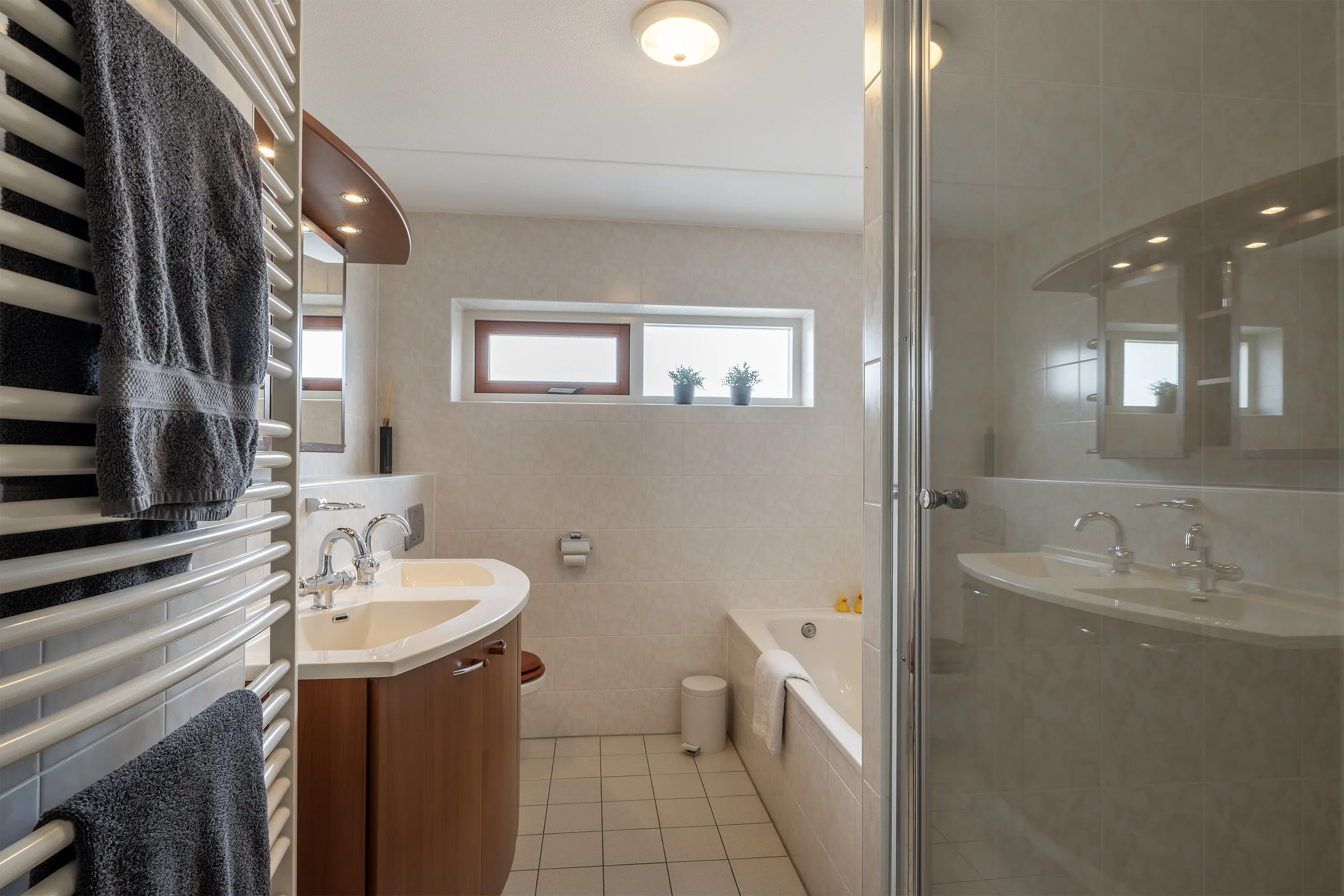 De badkamer is compleet uitgerust met een douche, een ligbad, een toilet, een dubbele wastafel met meubel en designradiator. Voor extra comfort is de badkamer voorzien van elektrische vloerverwarming.
