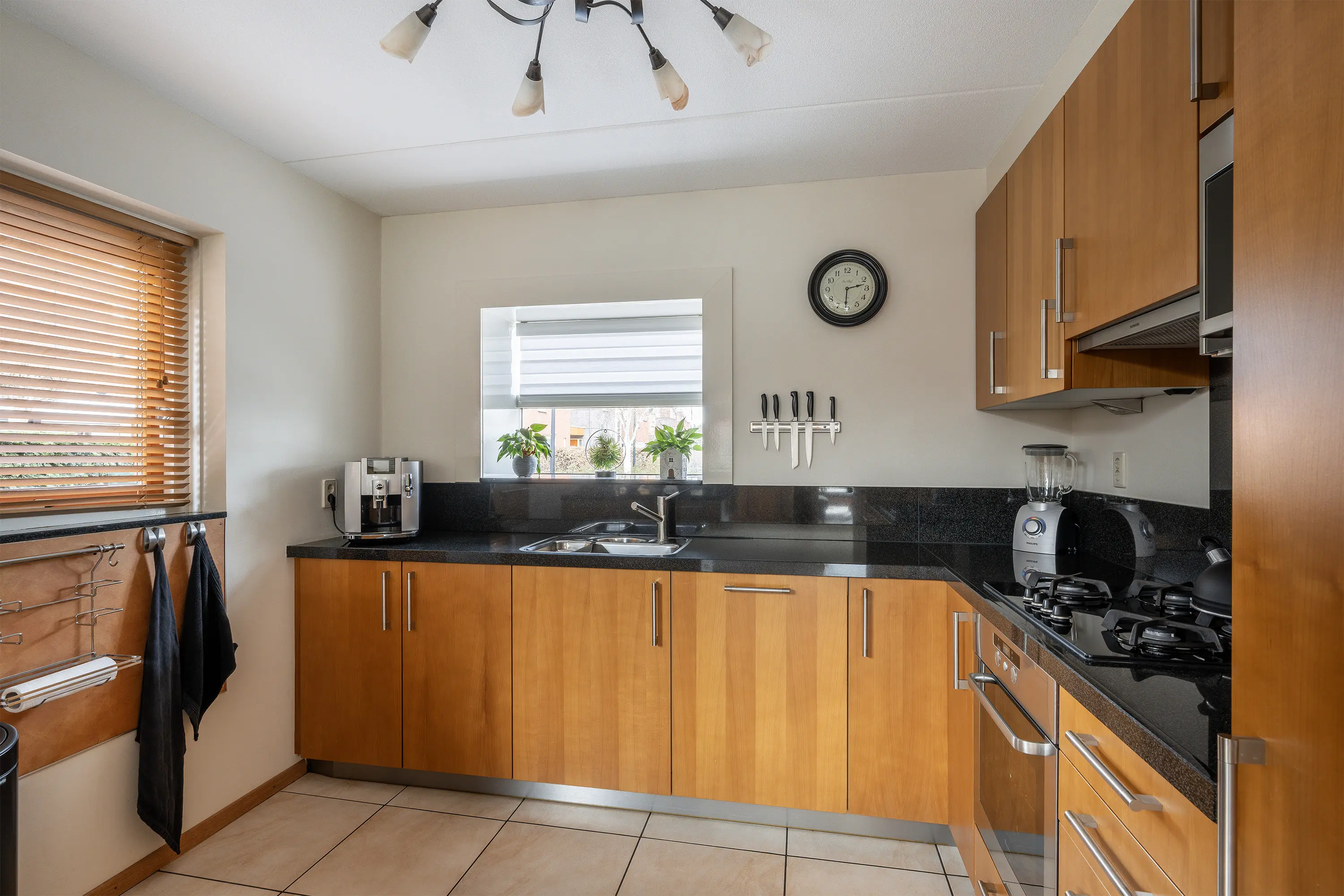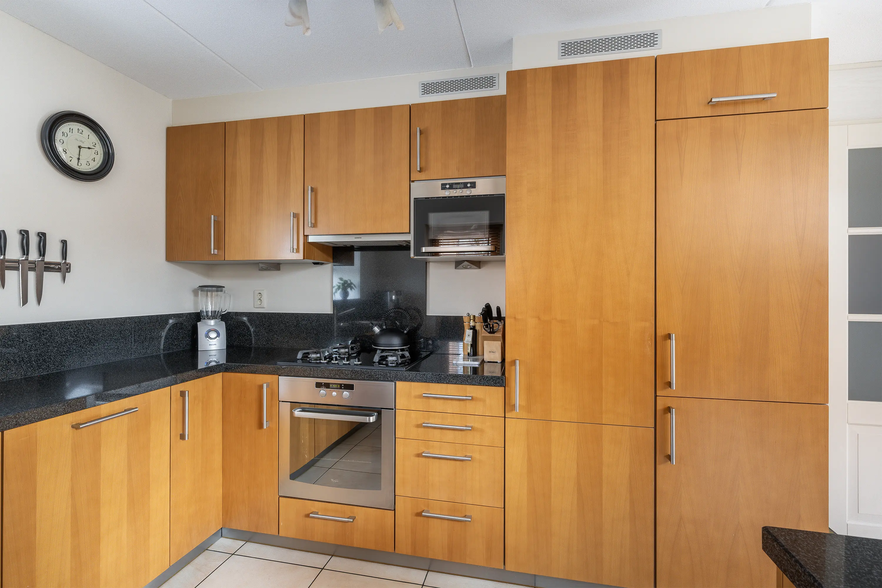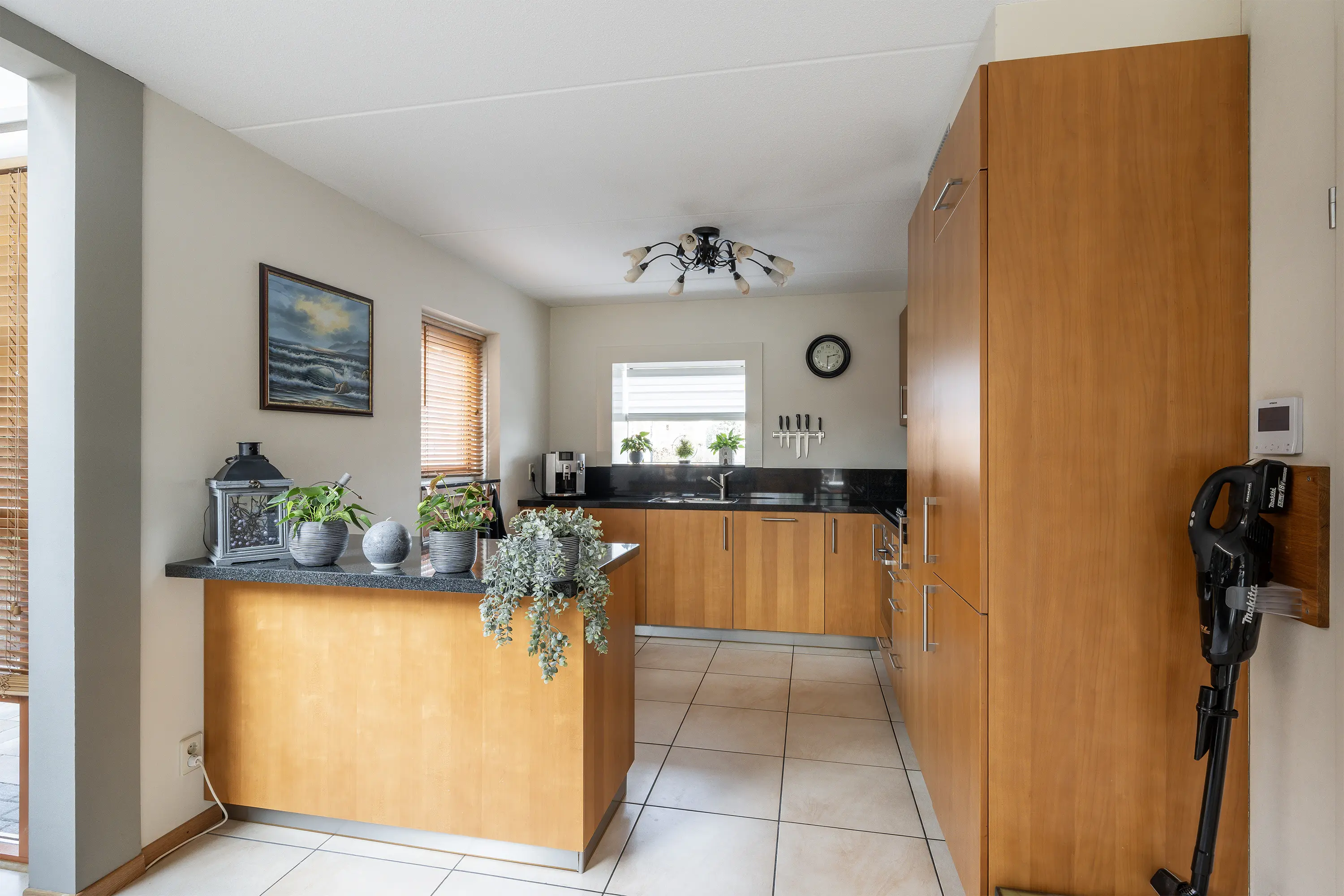 De open keuken is praktisch ingedeeld, met een bar/keuken-eiland dat zowel extra werkruimte als een gezellige ontmoetingsplek biedt. Dankzij de open opstelling is er een directe verbinding met de woonkamer. De keuken beschikt over veel opbergruimte en is van alle gemakken voorzien. Waaronder een 1,5 RVS spoelbak met mengkraan, een 4-pits gasfornuis met afzuigkap, oven, magnetron, vaatwasser, koelkast en vriezer.