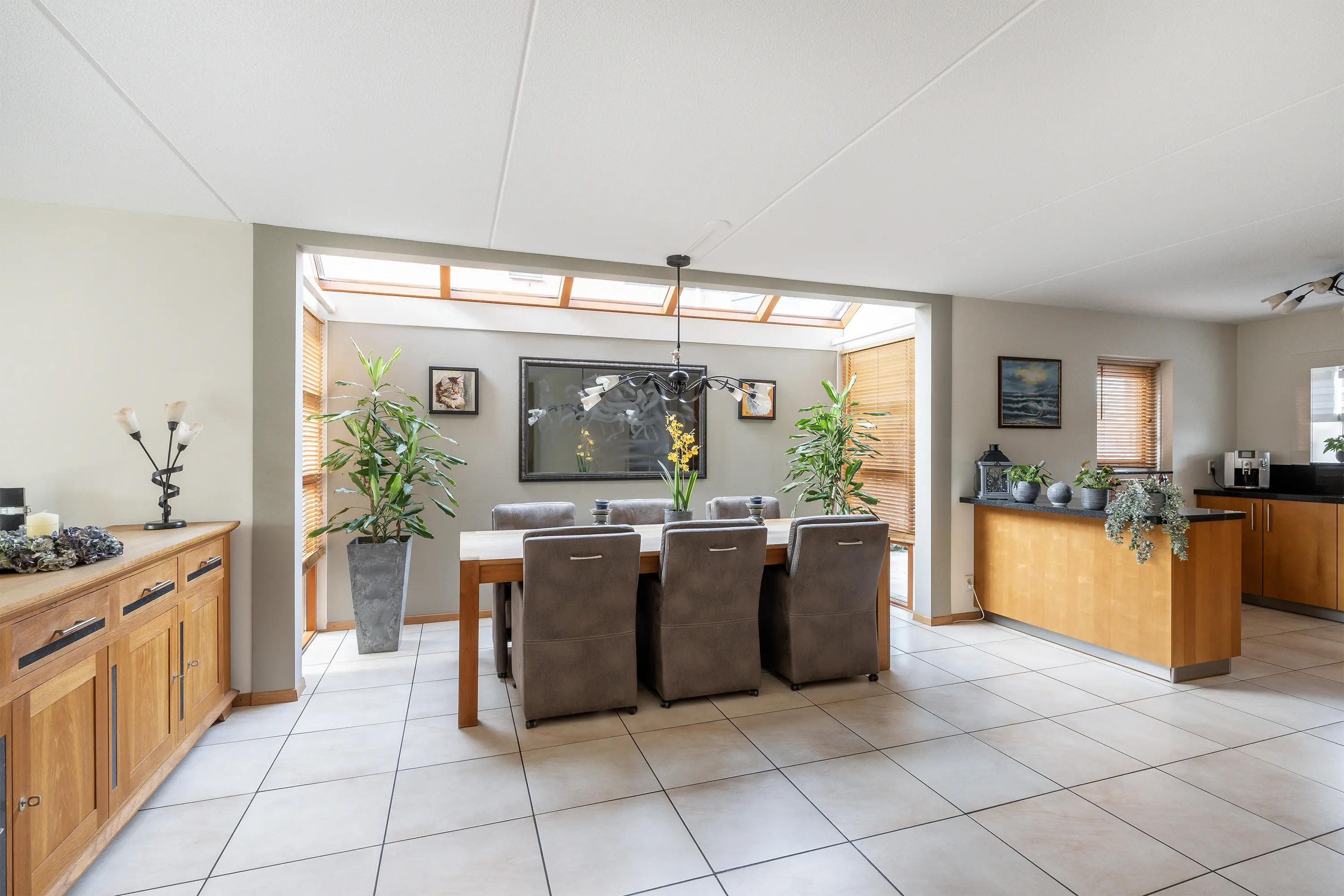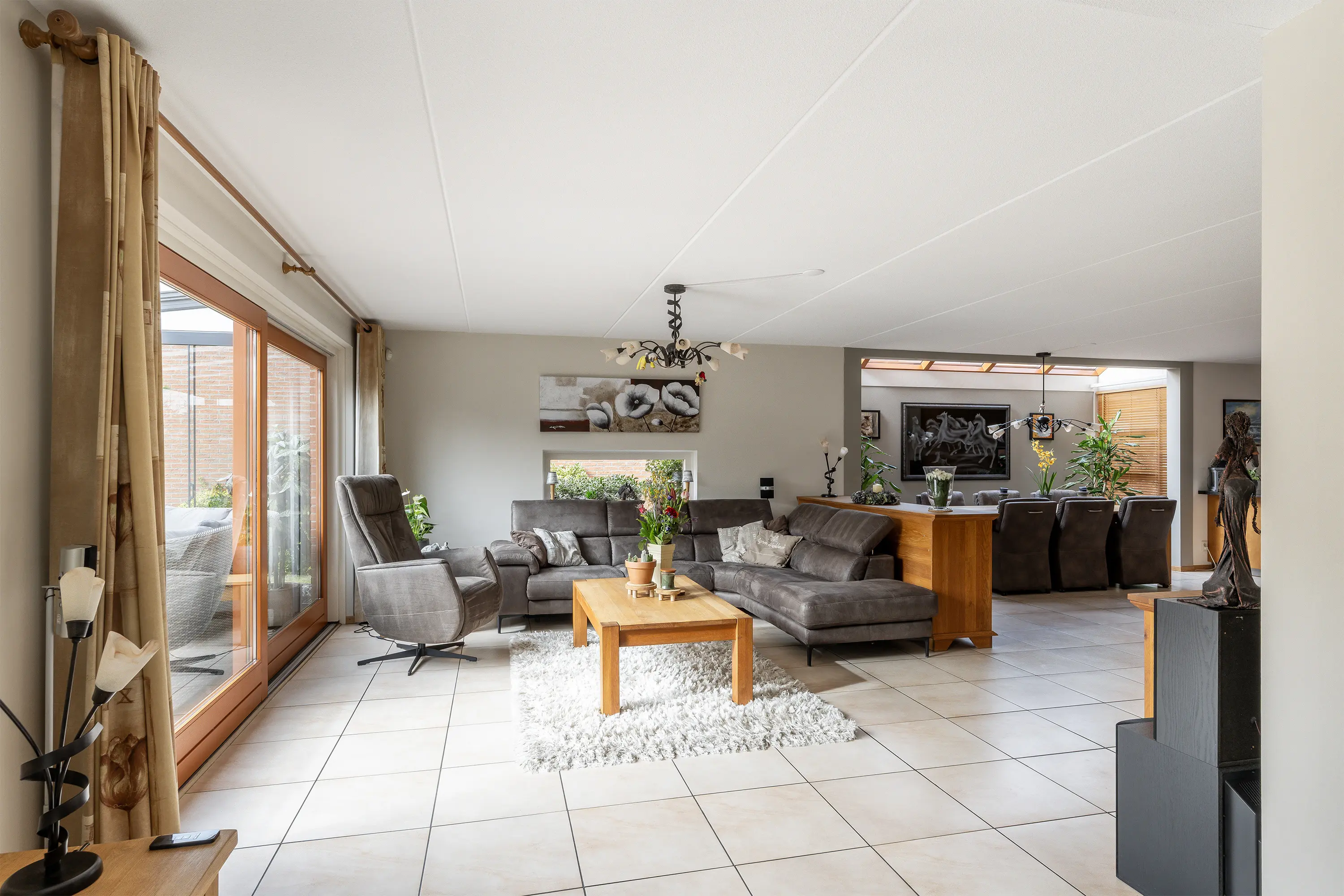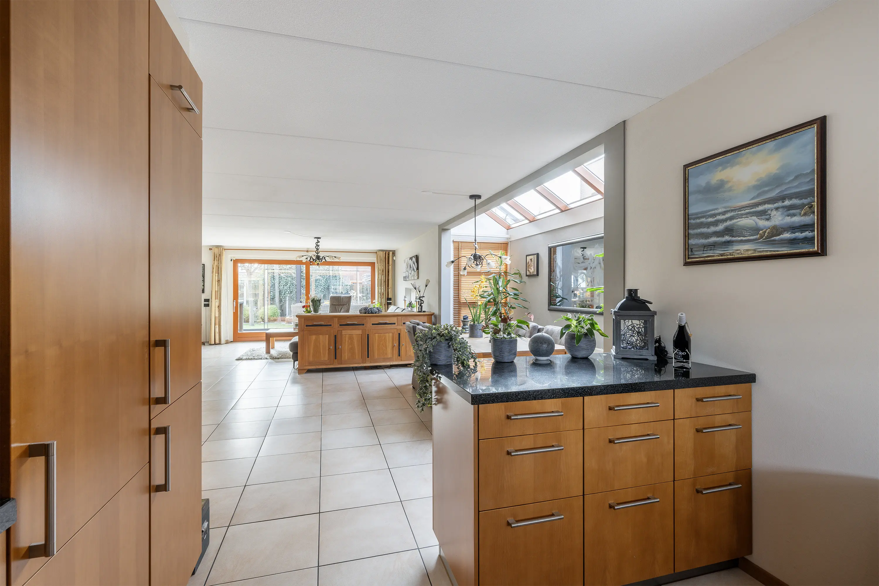 De woonkamer (ca. 67,7 m2 incl. keuken) is royaal opgezet en heeft, mede door de erker, een speelse indeling waardoor er plek is voor meerdere zitjes. Dankzij de grote ramen en de lichtstraat is er een overvloed aan natuurlijk licht. De plavuizen vloer is voorzien van vloerverwarming en koeling middels de warmtepomp. Via de schuifpui loop je zo de serre en de achtertuin in, waardoor binnen en buiten prachtig in elkaar overlopen.