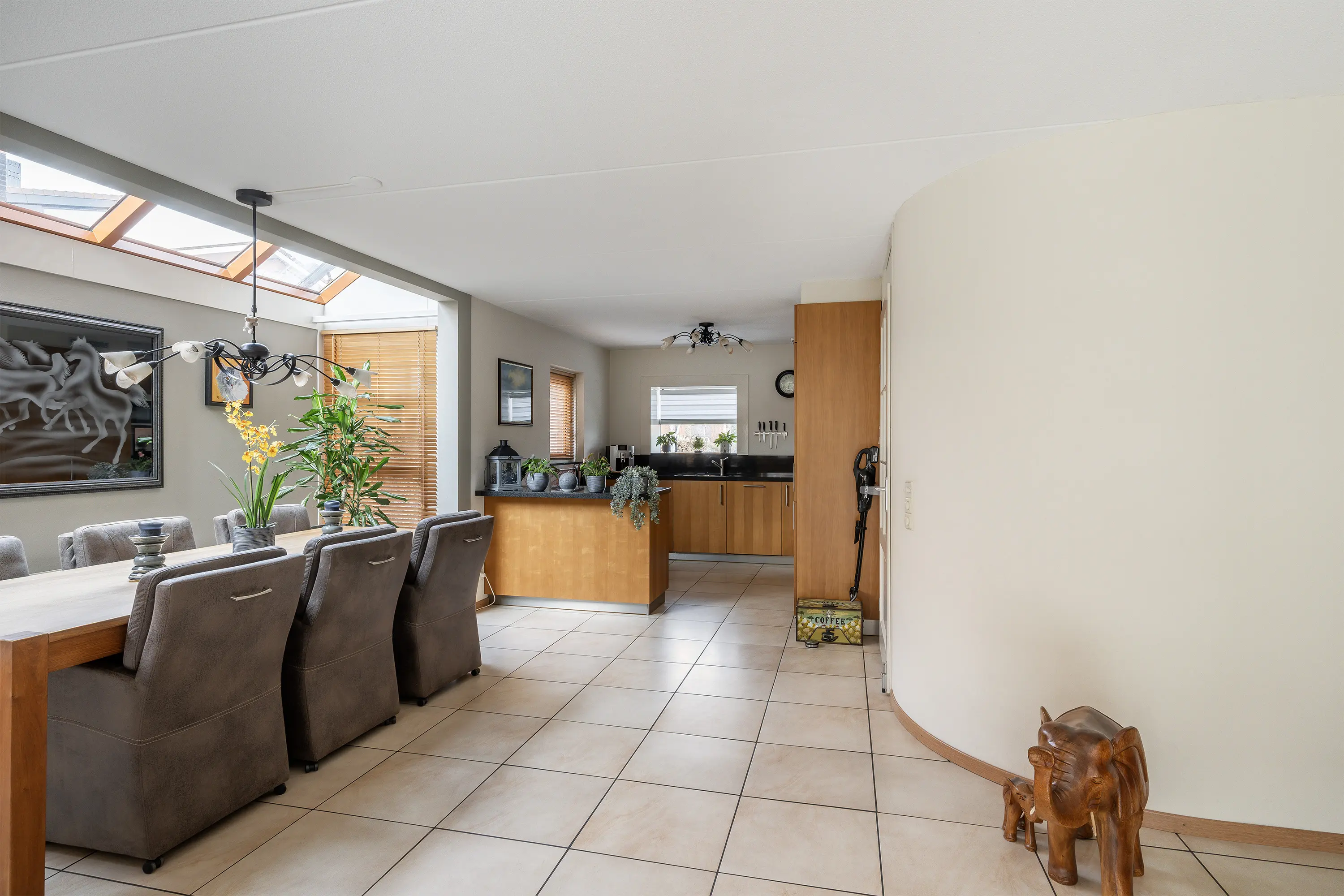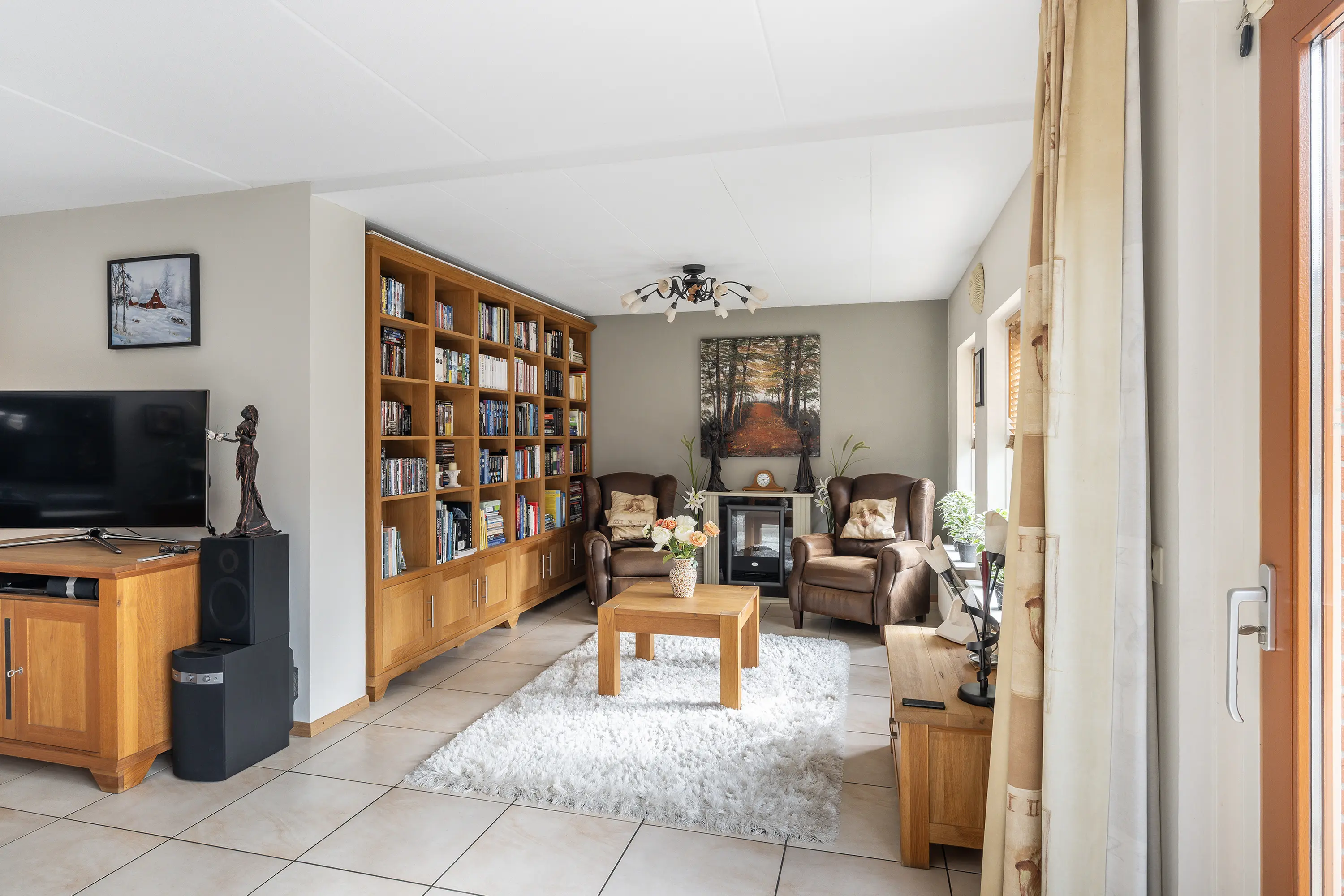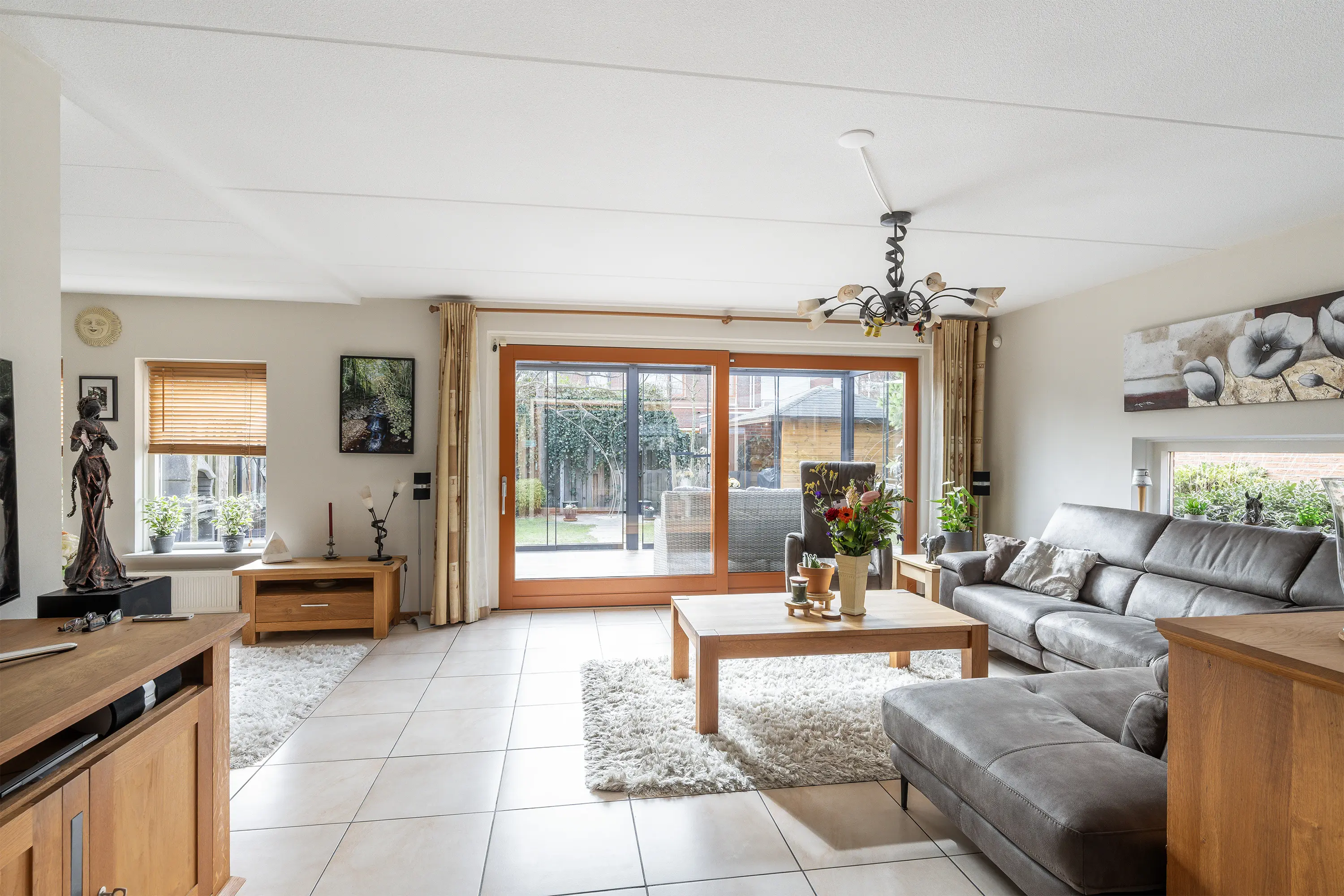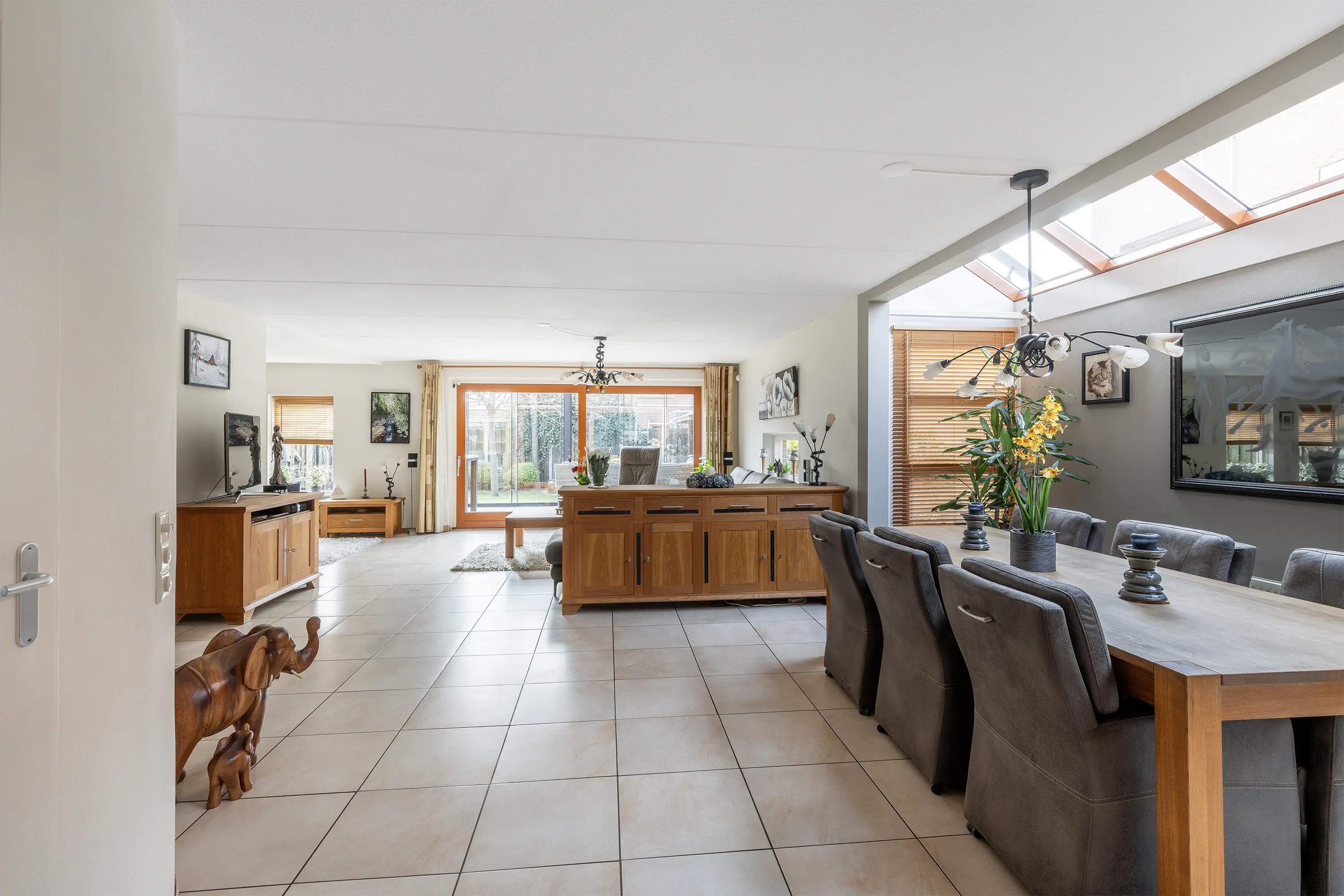 De woonkamer (ca. 67,7 m2 incl. keuken) is royaal opgezet en heeft, mede door de erker, een speelse indeling waardoor er plek is voor meerdere zitjes. Dankzij de grote ramen en de lichtstraat is er een overvloed aan natuurlijk licht. De plavuizen vloer is voorzien van vloerverwarming en koeling middels de warmtepomp. Via de schuifpui loop je zo de serre en de achtertuin in, waardoor binnen en buiten prachtig in elkaar overlopen.