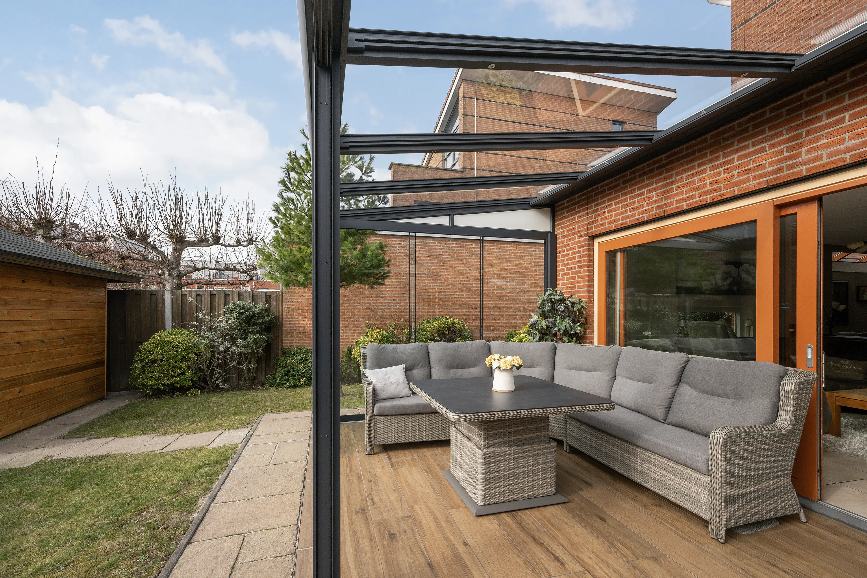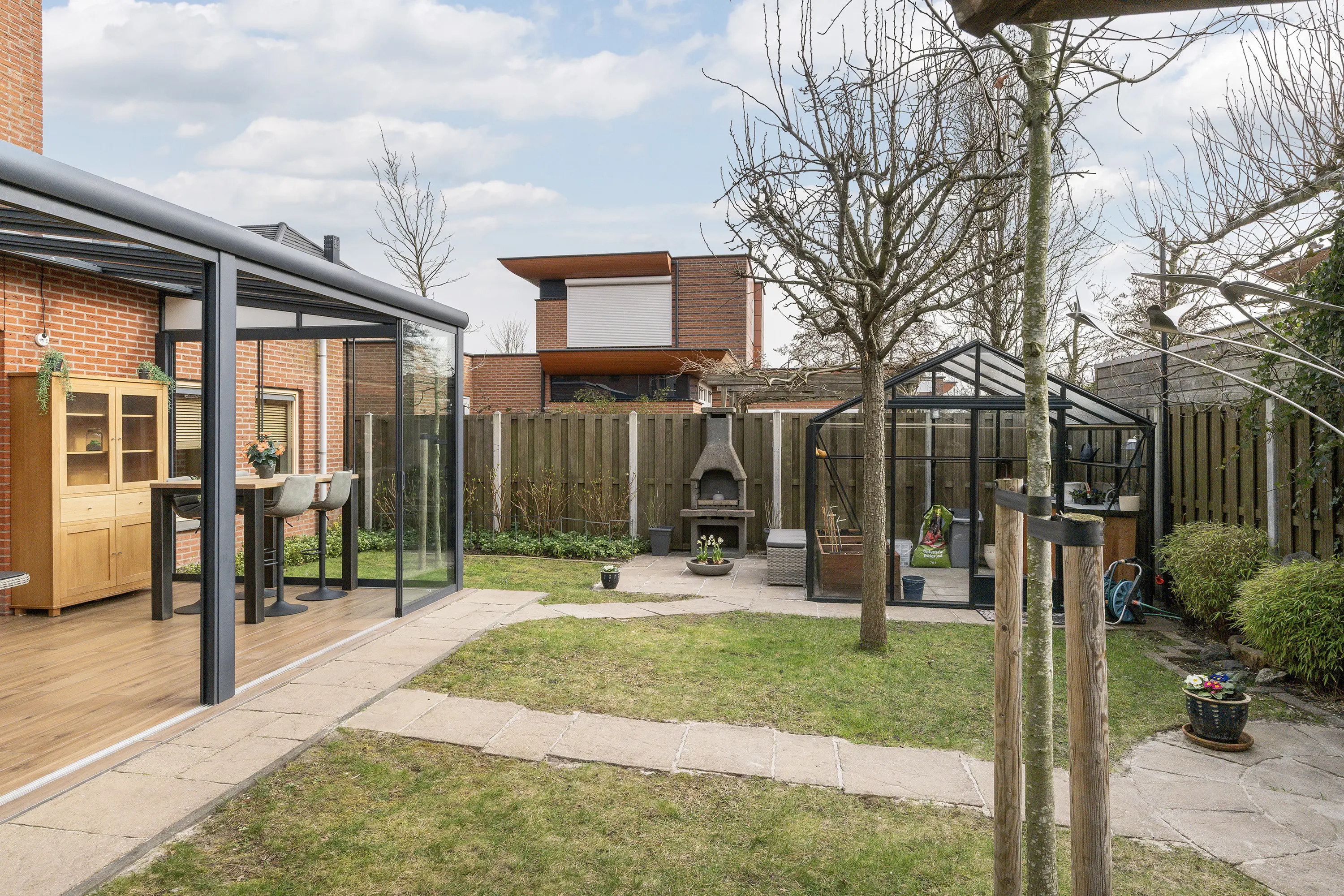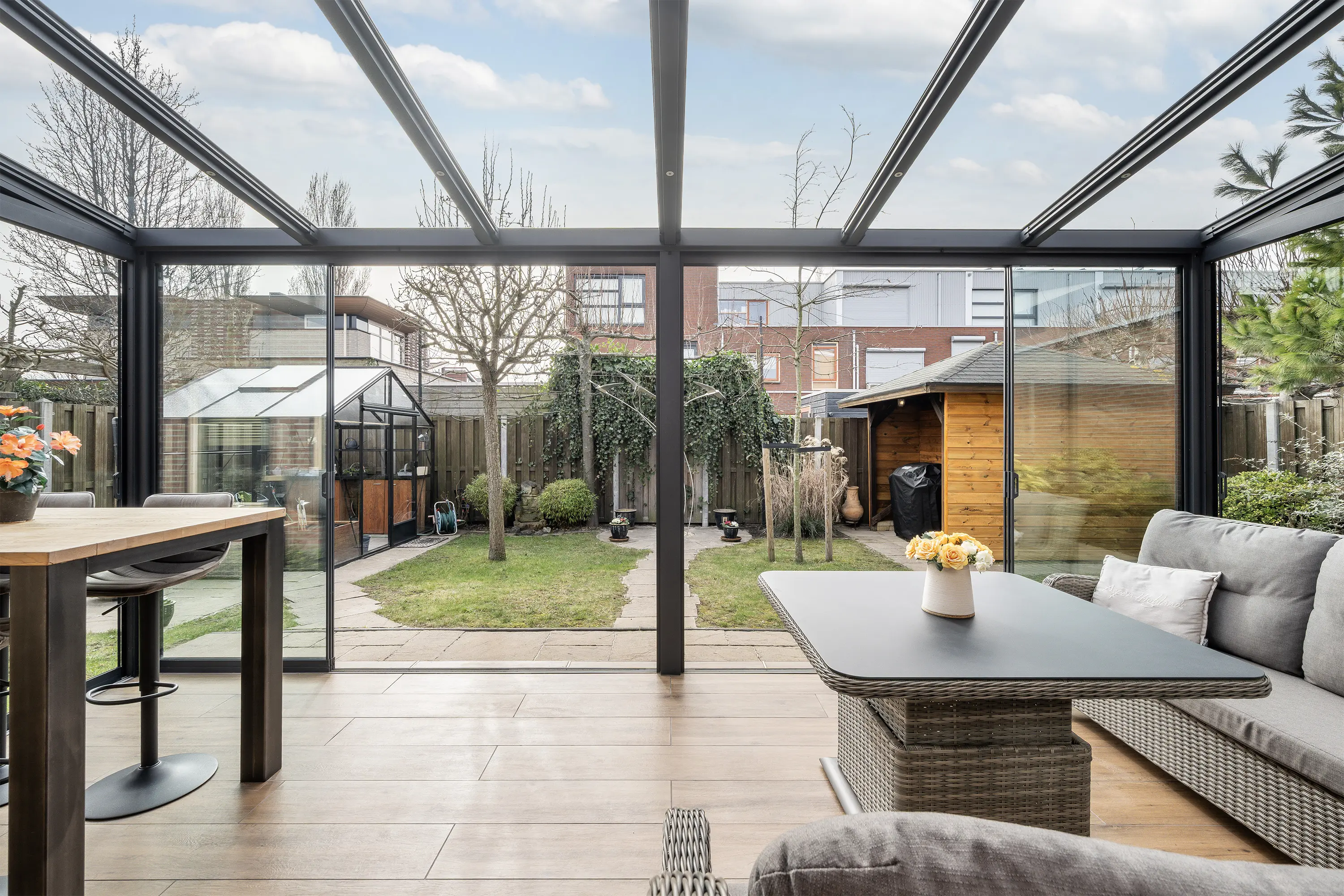 In 2020 is de royale serre aangebouwd welke is voorzien van screens en verlichting. Gelegen op het zuidwesten, geniet je hier al vroeg in het voorjaar en tot laat in het najaar van het zonnetje. De serre vormt een natuurlijke verlenging van de woonkamer en is de ideale plek om te ontspannen of gasten te ontvangen, terwijl je uitzicht hebt op de fraai aangelegde tuin. De ruime achtertuin is eveneens op het zuidwesten gelegen, waardoor je zomers de hele dag van zon en licht kunt genieten. Voor gemak en onderhoud is er een automatische sproei-installatie aanwezig. De tuin biedt veel privacy en heeft een hobbykas voor een eigen moestuin, evenals een houten overkapping voor fietsen of tuingereedschap. Zo is er een perfecte balans tussen ontspanning, tuinplezier en functionaliteit.