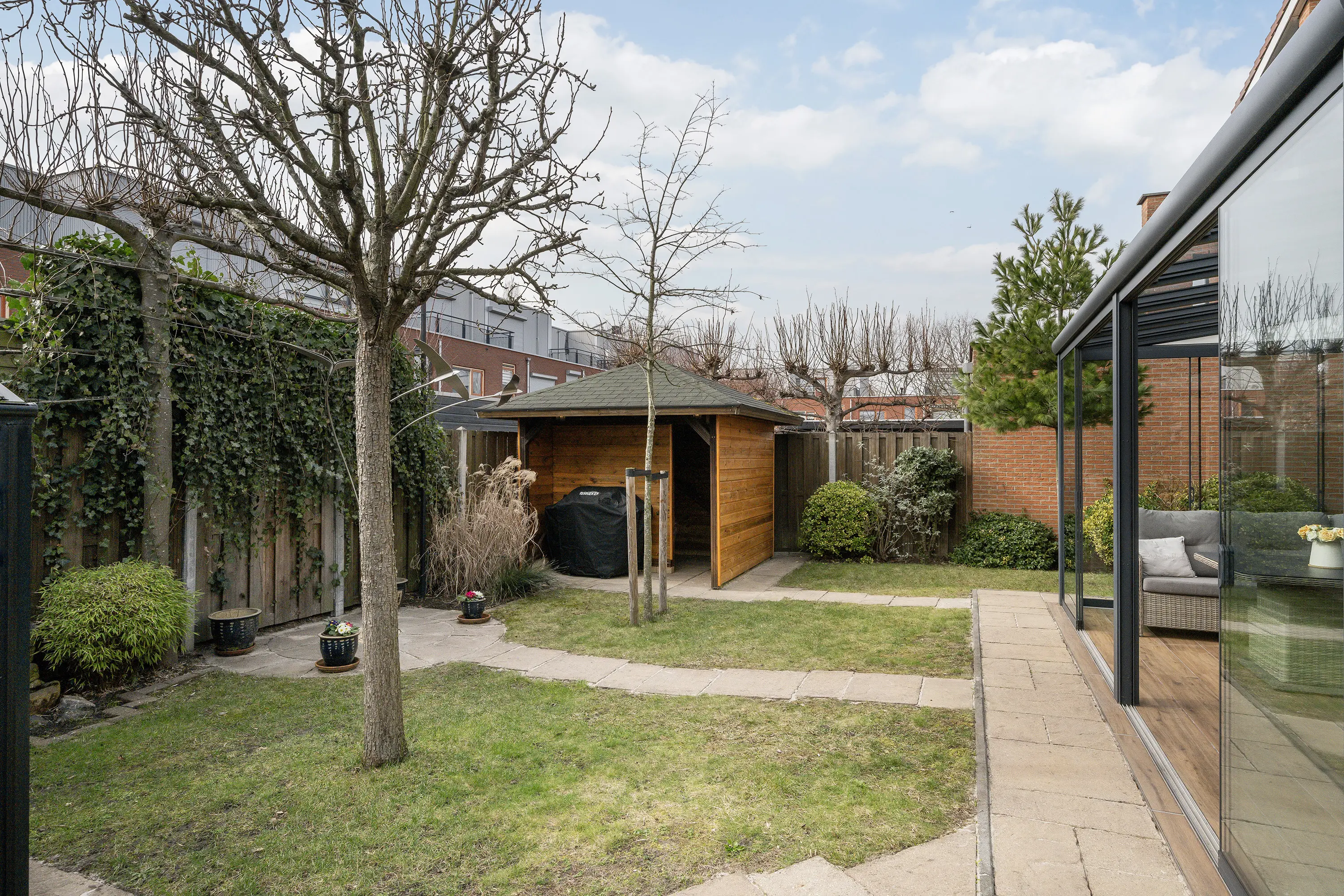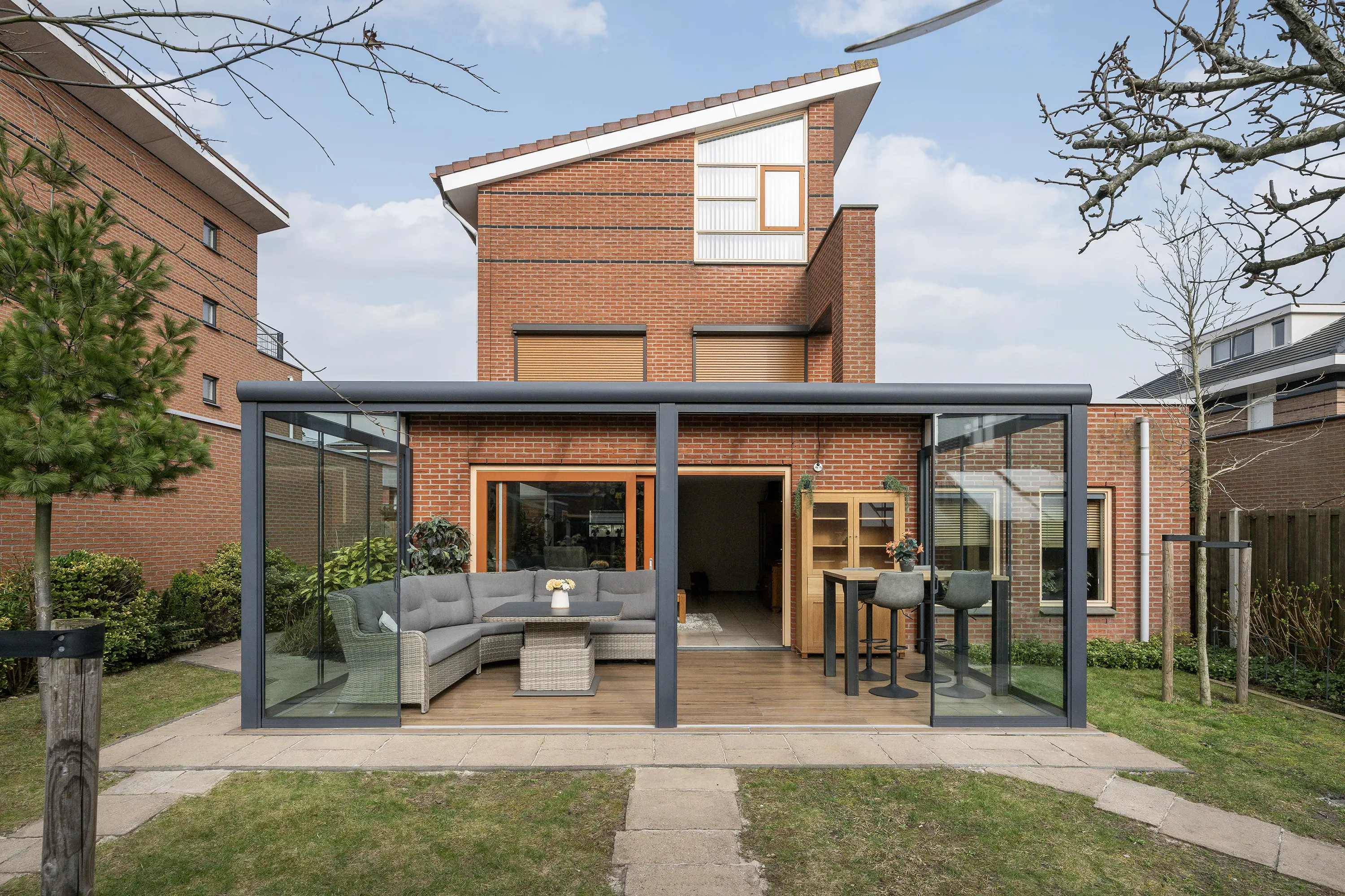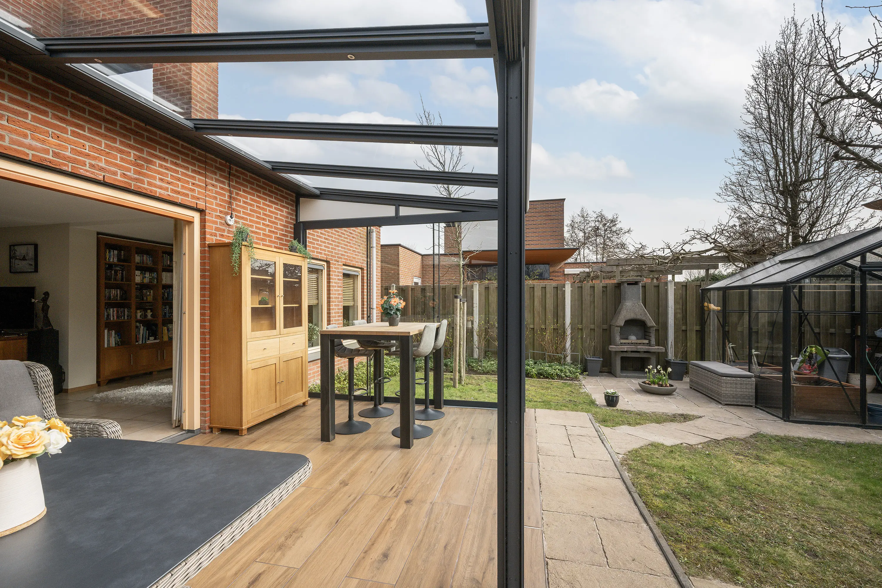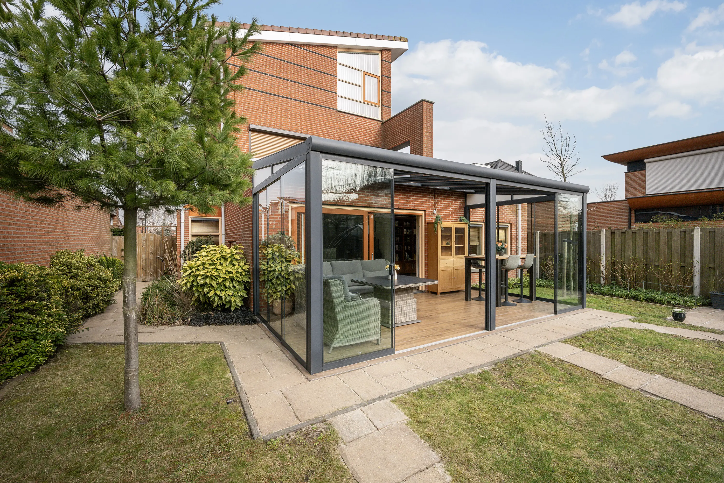 In 2020 is de royale serre aangebouwd welke is voorzien van screens en verlichting. Gelegen op het zuidwesten, geniet je hier al vroeg in het voorjaar en tot laat in het najaar van het zonnetje. De serre vormt een natuurlijke verlenging van de woonkamer en is de ideale plek om te ontspannen of gasten te ontvangen, terwijl je uitzicht hebt op de fraai aangelegde tuin. De ruime achtertuin is eveneens op het zuidwesten gelegen, waardoor je zomers de hele dag van zon en licht kunt genieten. Voor gemak en onderhoud is er een automatische sproei-installatie aanwezig. De tuin biedt veel privacy en heeft een hobbykas voor een eigen moestuin, evenals een houten overkapping voor fietsen of tuingereedschap. Zo is er een perfecte balans tussen ontspanning, tuinplezier en functionaliteit.