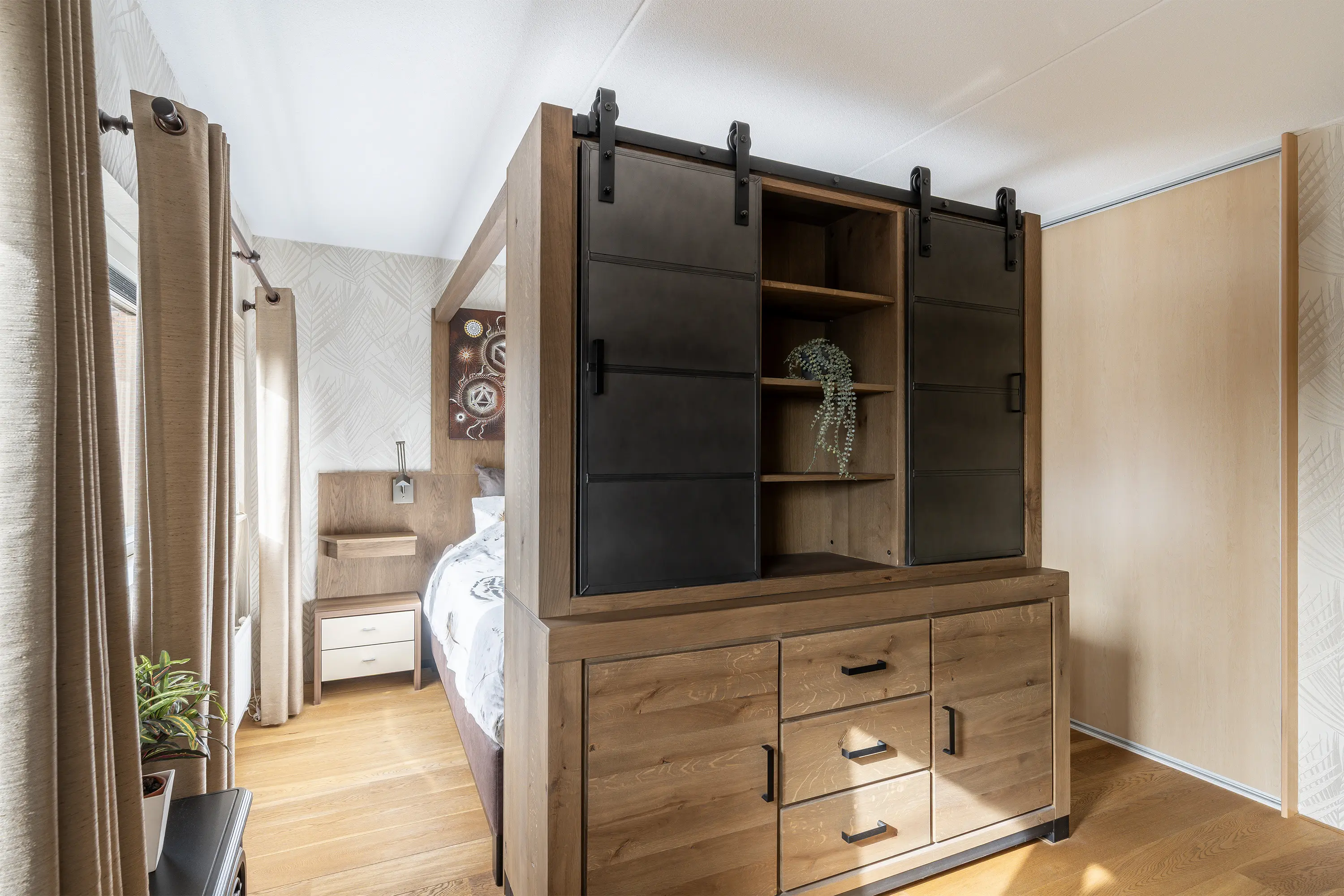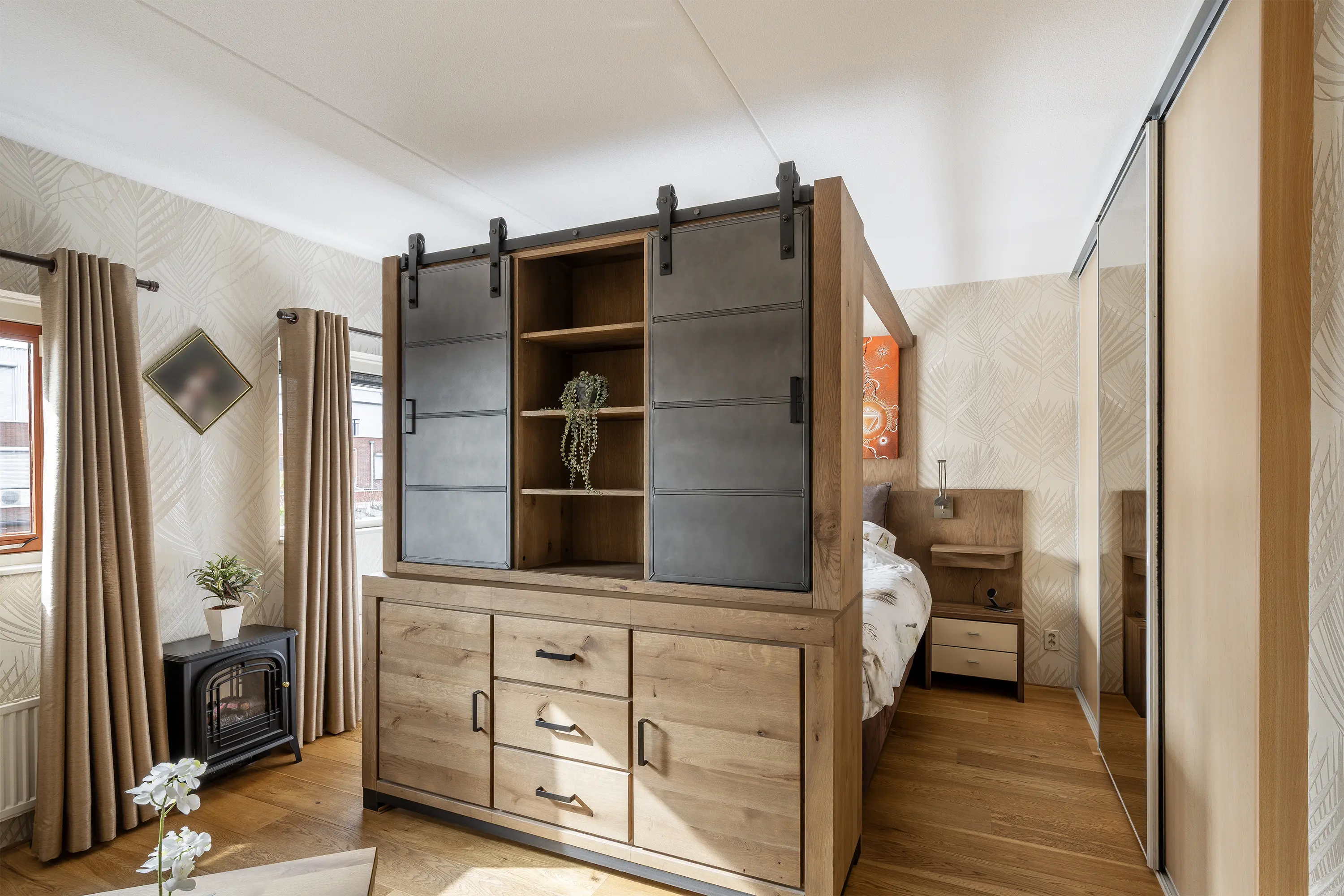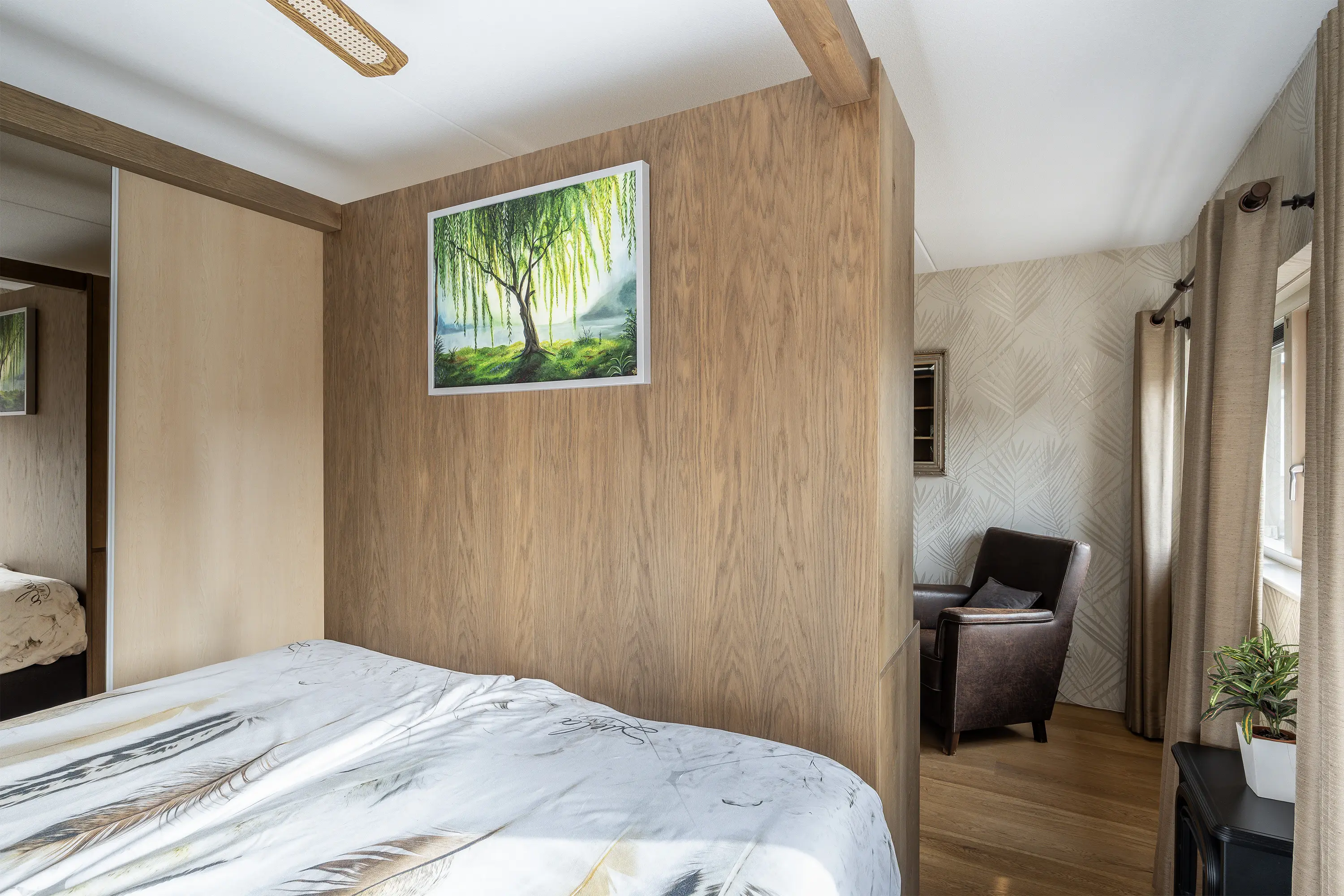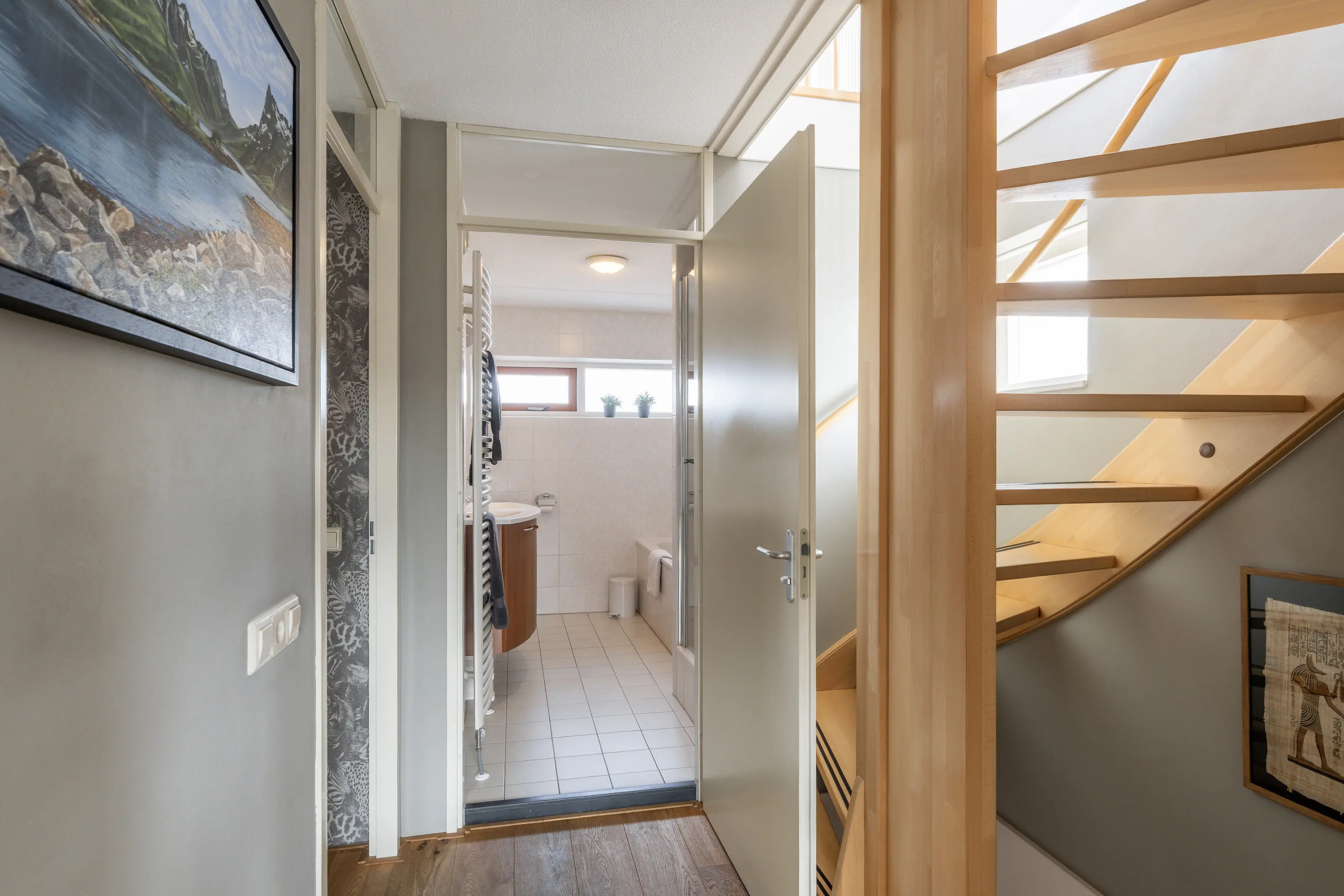 Via de fraaie beukenhouten trap bereik je de eerste verdieping. De masterbedroom ligt aan de achterzijde van de woning, is woningbreed en beschikt over een praktische kastenwand en airconditioning (2022), voor optimaal comfort in elk seizoen.