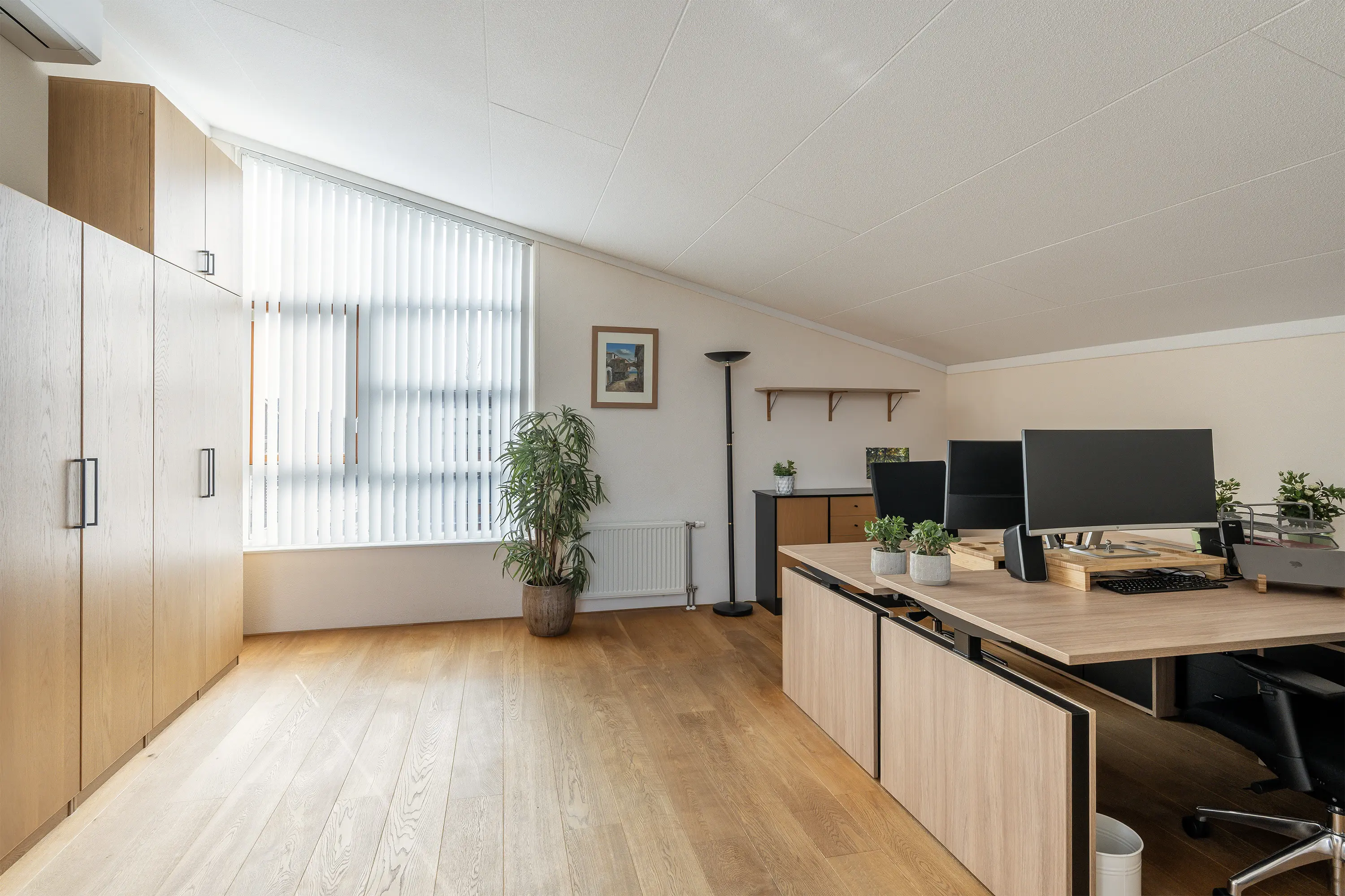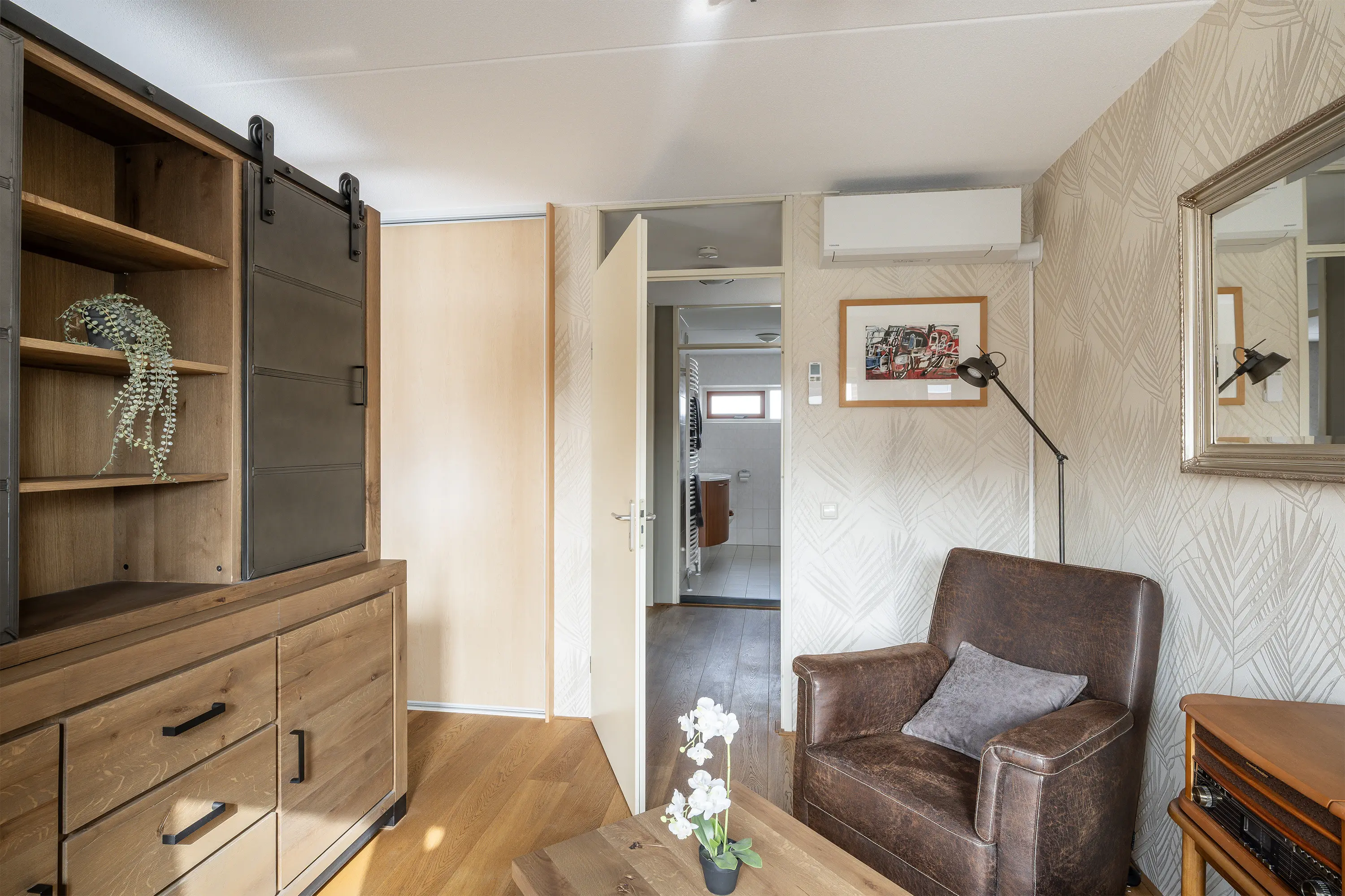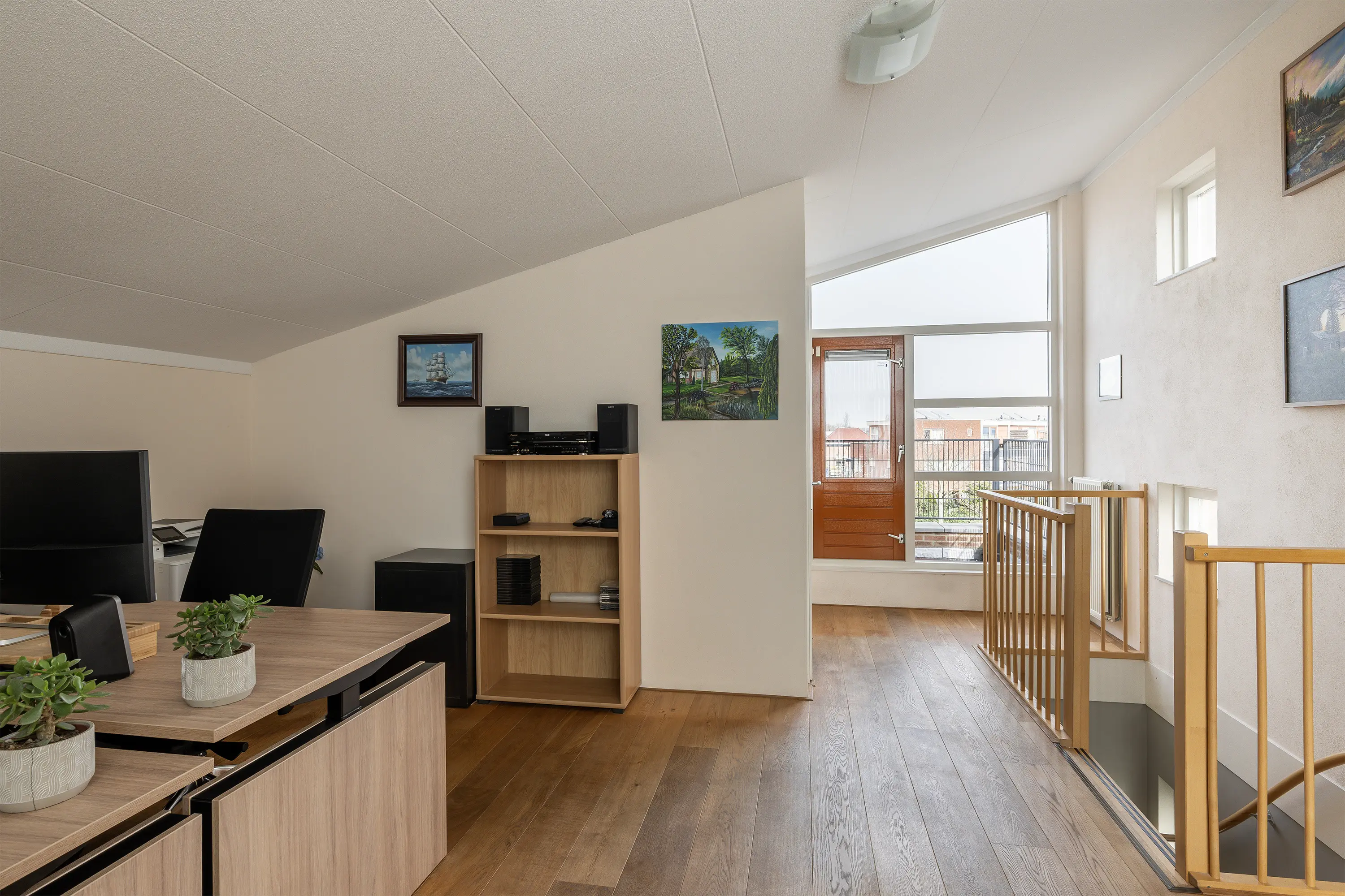 Aan de voorzijde van de woning bevindt zich de tweede slaapkamer, eveneens ruim en licht, perfect voor een kinderkamer, logeerkamer of werkplek aan huis. De gehele eerste verdieping is voorzien van een lichte eiken lamel parketvloer.