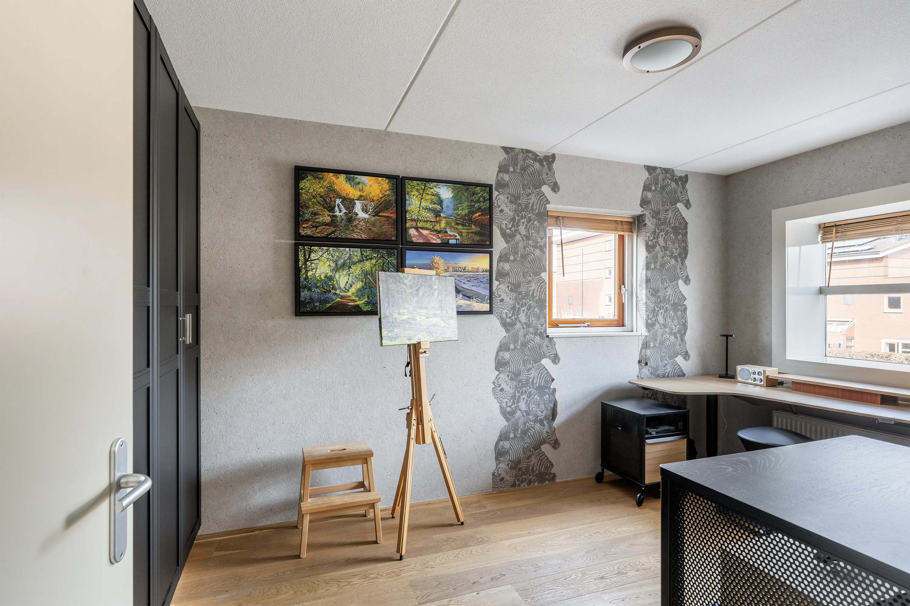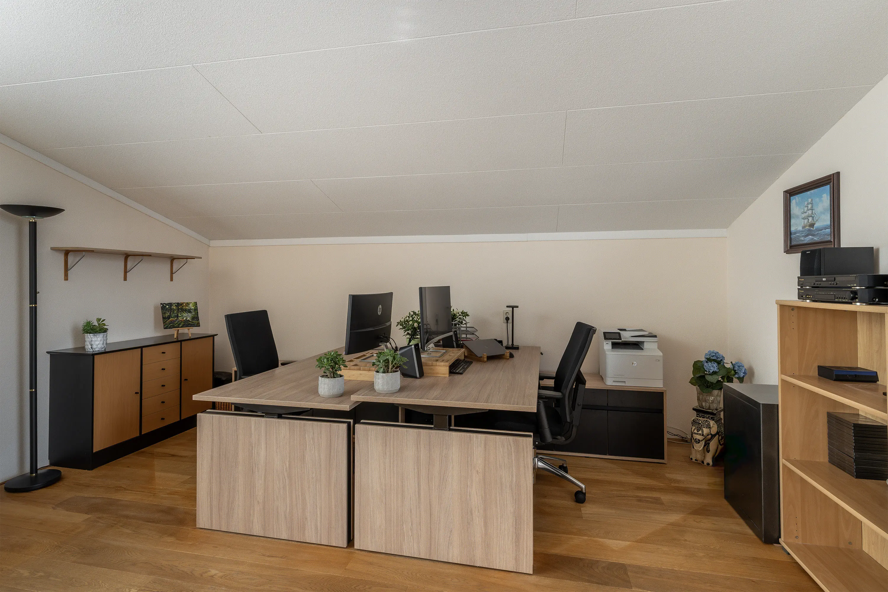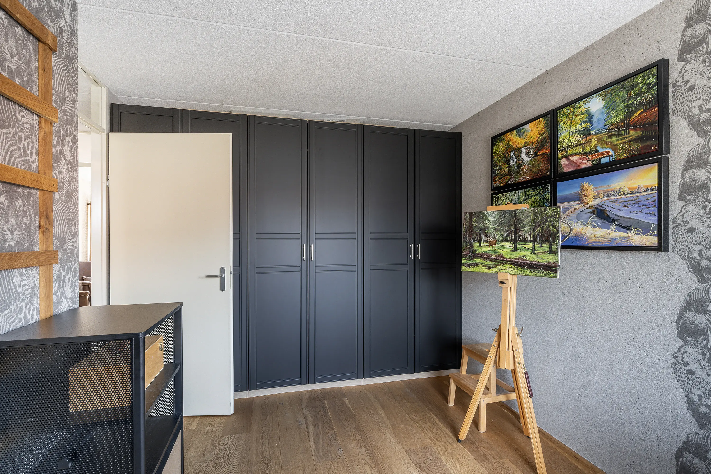 Aan de voorzijde van de woning bevindt zich de tweede slaapkamer, eveneens ruim en licht, perfect voor een kinderkamer, logeerkamer of werkplek aan huis. De gehele eerste verdieping is voorzien van een lichte eiken lamel parketvloer.