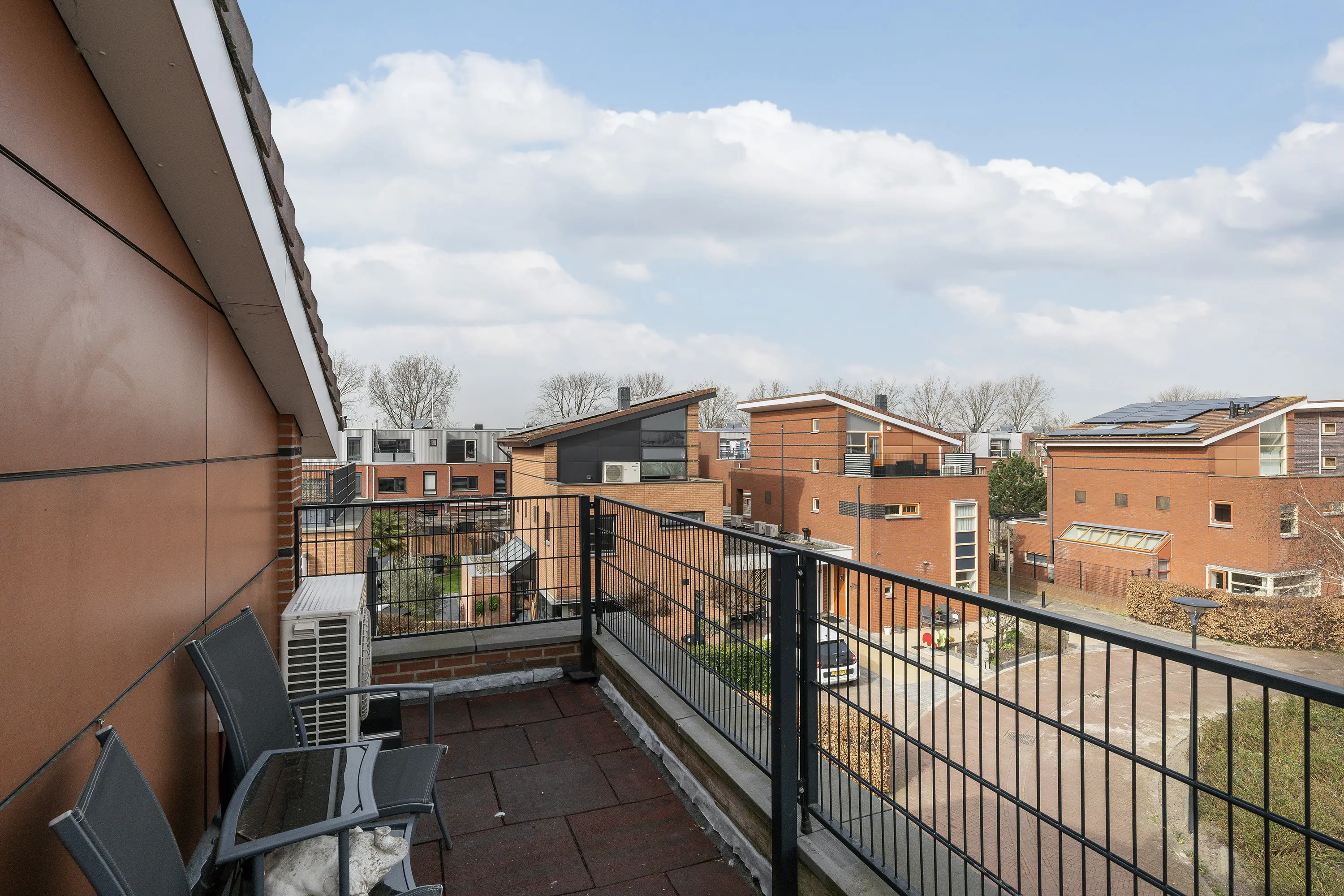De tweede verdieping biedt een derde slaapkamer die de volledige bovenste etage beslaat, waardoor er een riante, lichte en vrije ruimte ontstaat. Net als de masterbedroom is deze kamer voorzien van een in 2022 geplaatste airconditioning en is evenals de eerste verdieping voorzien van dezelfde licht eiken lamel parketvloer. Op deze verdieping bevindt zich tevens een afgesloten ruimte met de technische installatie van de warmtepomp en wasruimte. Vanaf deze verdieping heb je toegang tot een ruim balkon aan de voorzijde van de woning, ideaal om te genieten van een ochtendzonnetje.