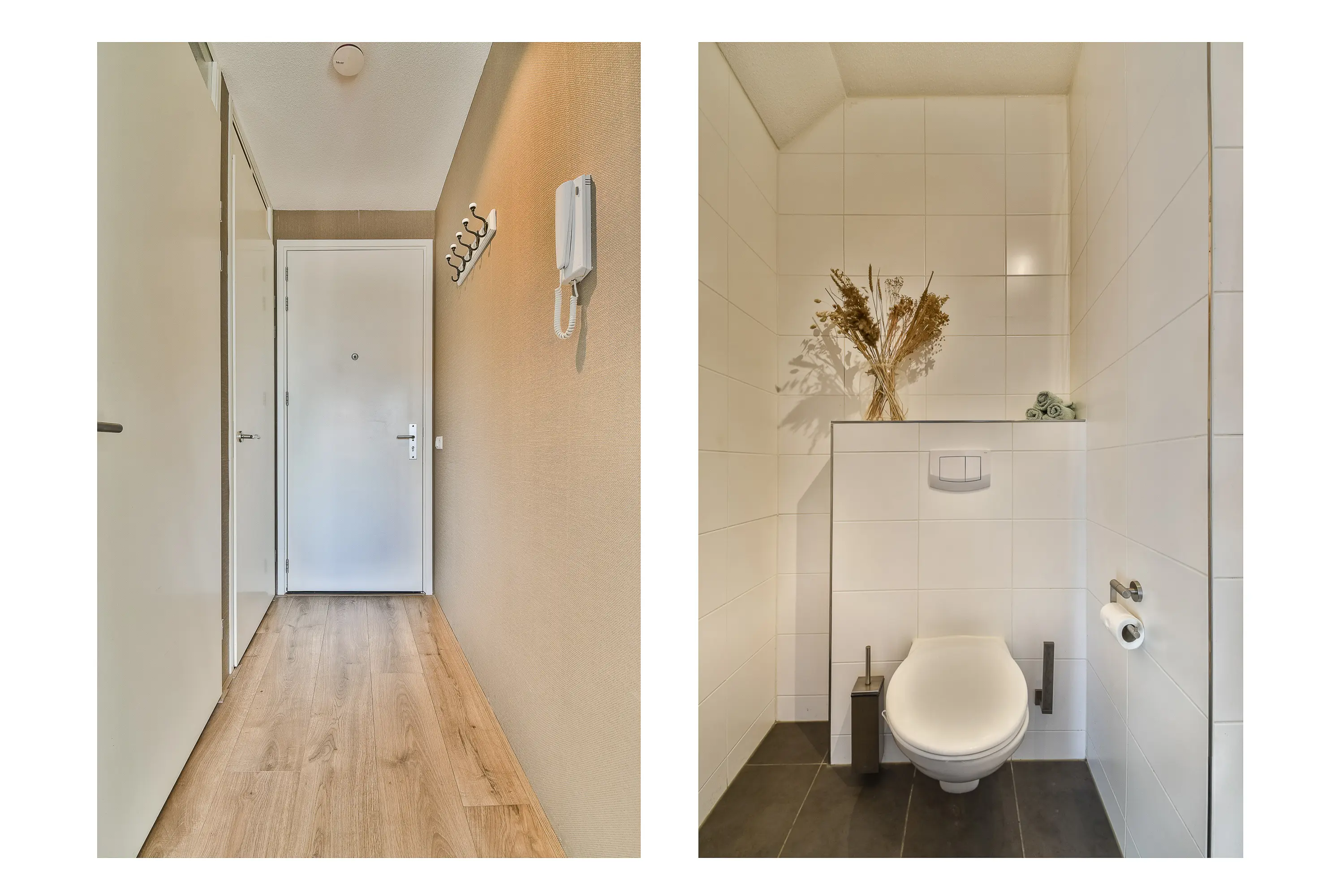 Binnenkomst in een nette hal met intercom en meterkast, tevens praktisch ingericht voor het opbergen van jassen en schoenen. Vanuit hier zijn de badkamer en de woonkamer bereikbaar.