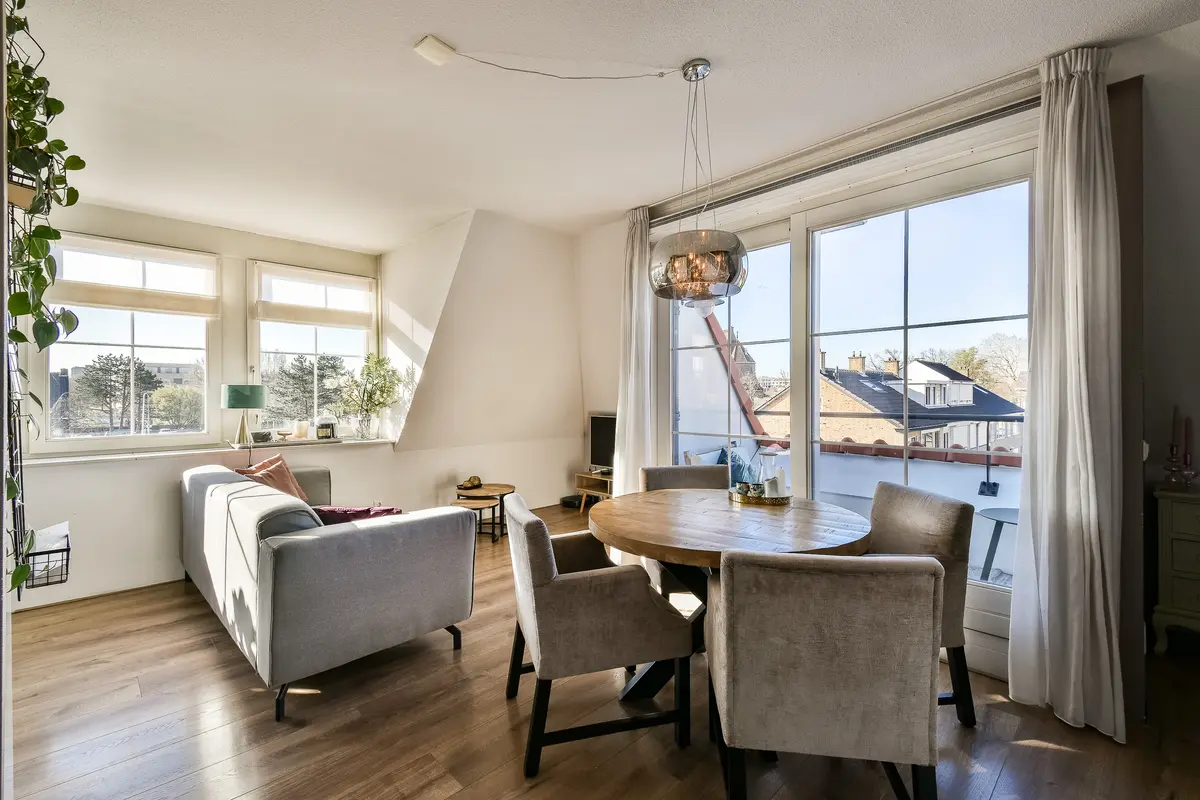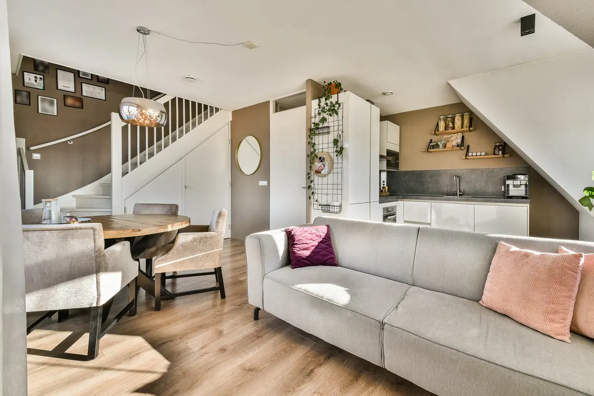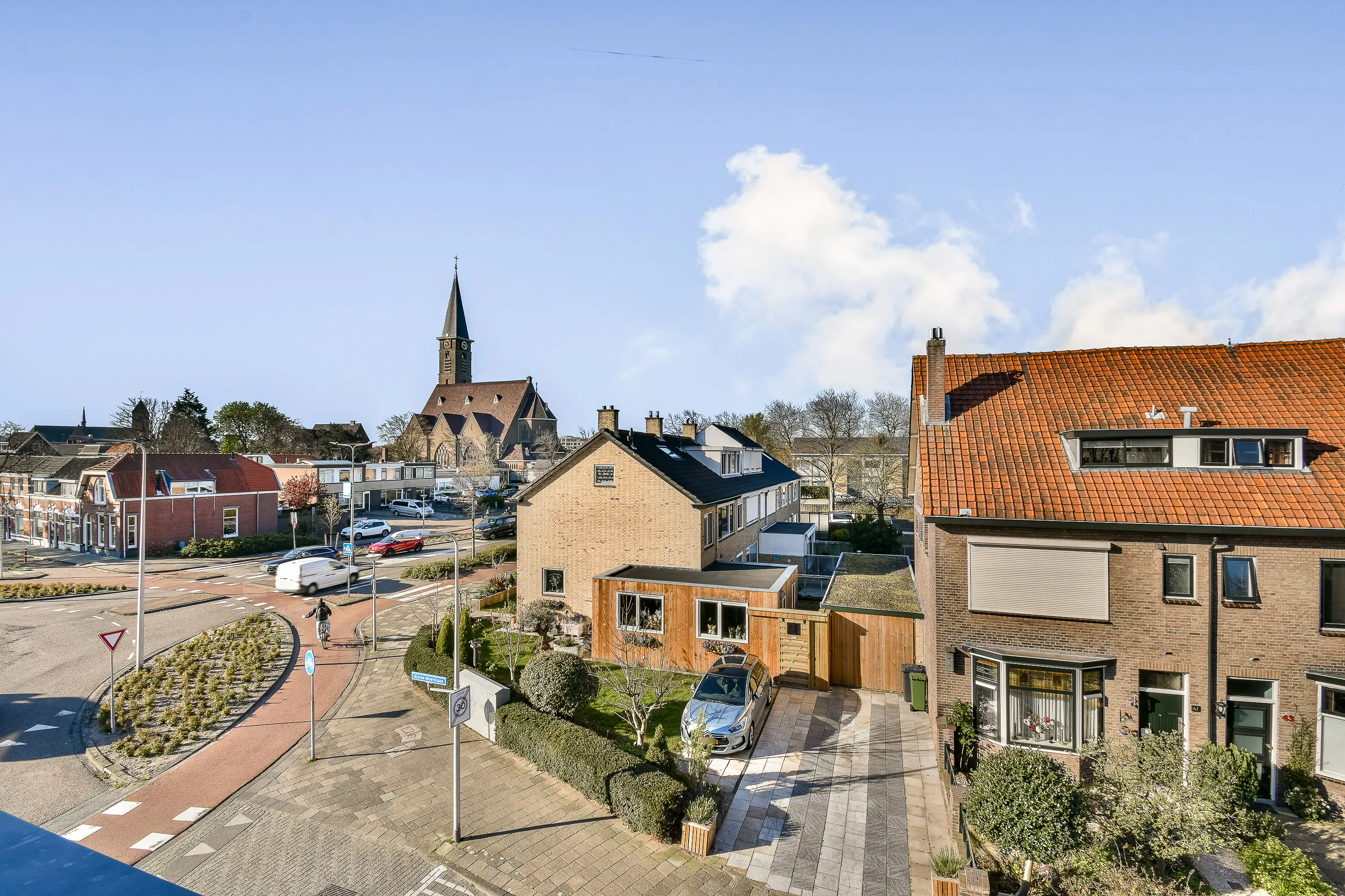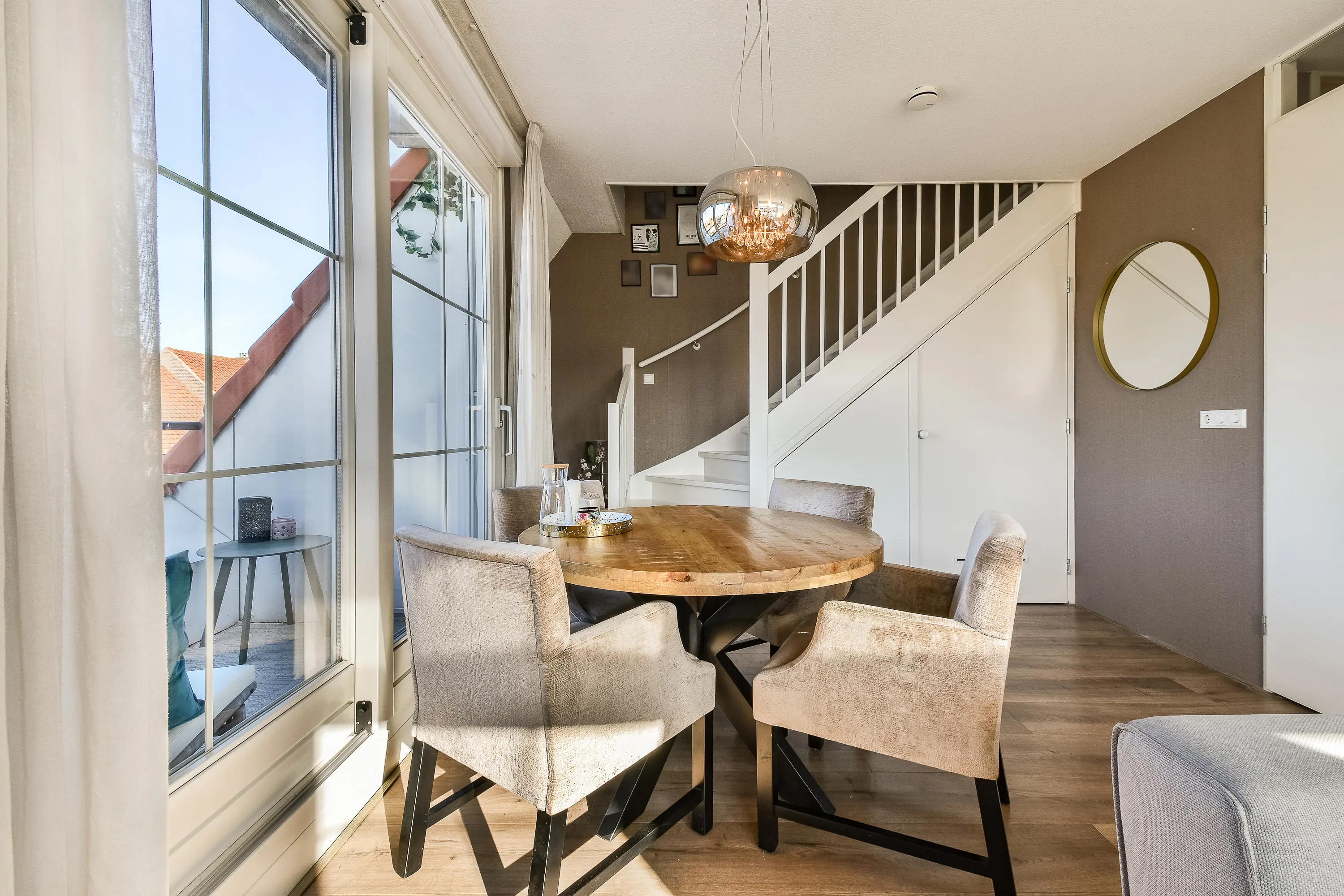 De lichte woonkamer biedt een vrij uitzicht over het centrum van Naaldwijk en voelt ruim en aangenaam aan. Aan beide zijden zijn screens geplaatst die elektrisch bedienbaar zijn. Daarnaast is er een praktische trapkast met aansluitingen voor wasmachine en droger en volop extra bergruimte.