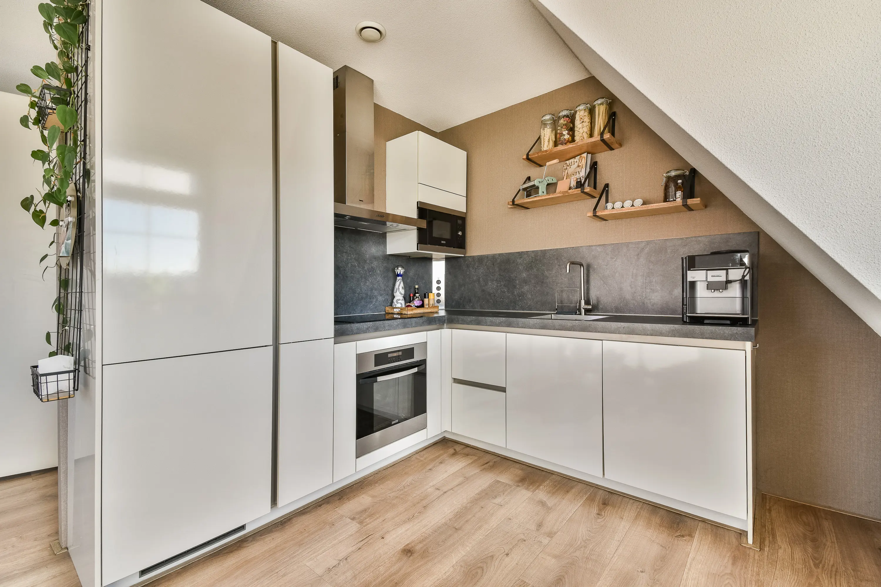De open keuken is strak uitgevoerd in hoogglans wit en opgesteld in een praktische L-vorm. Voorzien van moderne inbouwapparatuur zoals een inductiekookplaat, luxe oven, vaatwasser, magnetron en veel kastruimte, waaronder een handige apothekerskast. Het antraciete werkblad en de dimbare LED-verlichting maken de keuken compleet en comfortabel in gebruik.