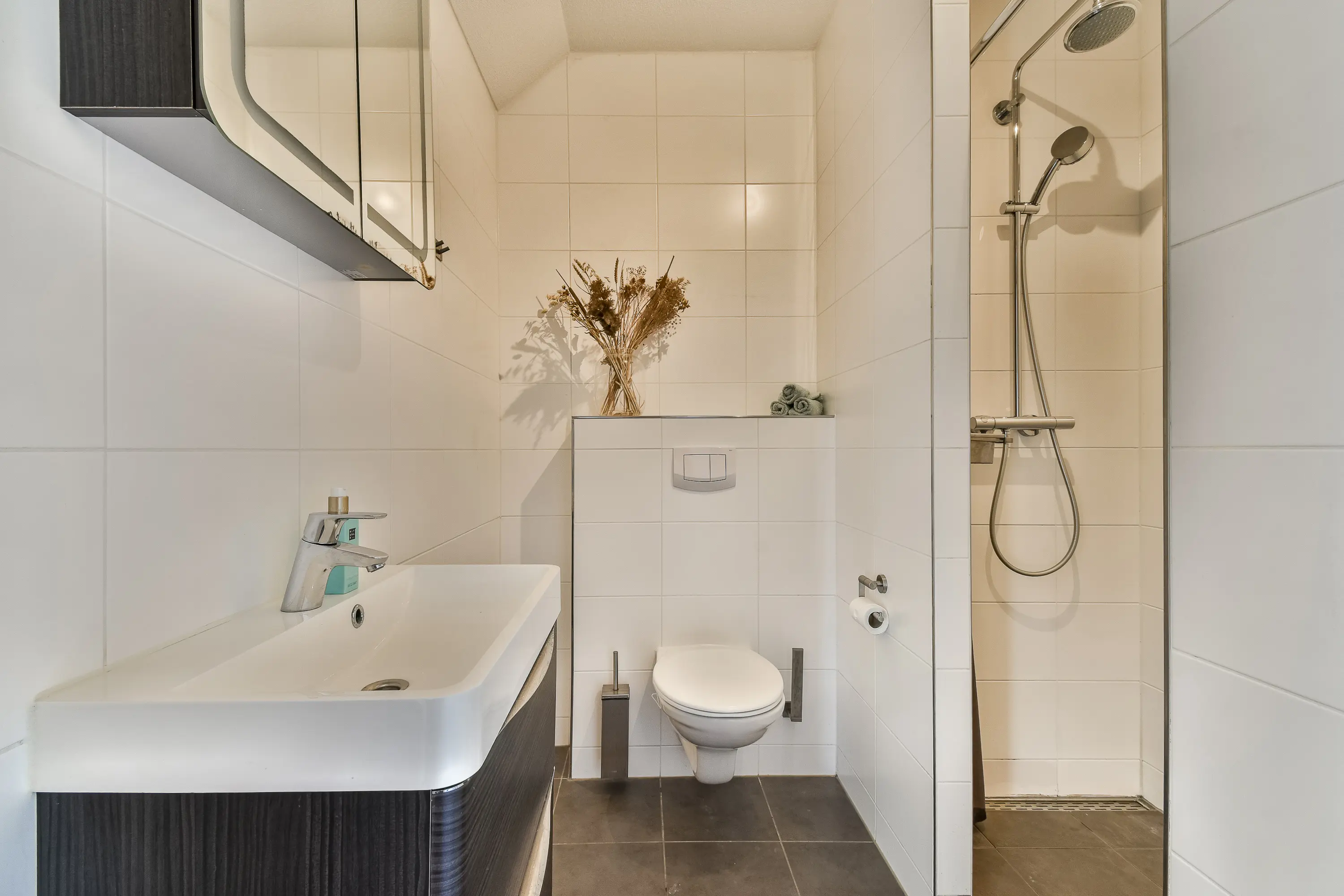 De badkamer, vanuit de hal toegankelijk, is modern en verzorgd uitgevoerd en beschikt over een ruime inloopdouche met regendouche, een zwevend toilet, wastafelmeubel, en spiegelkast met verlichting.