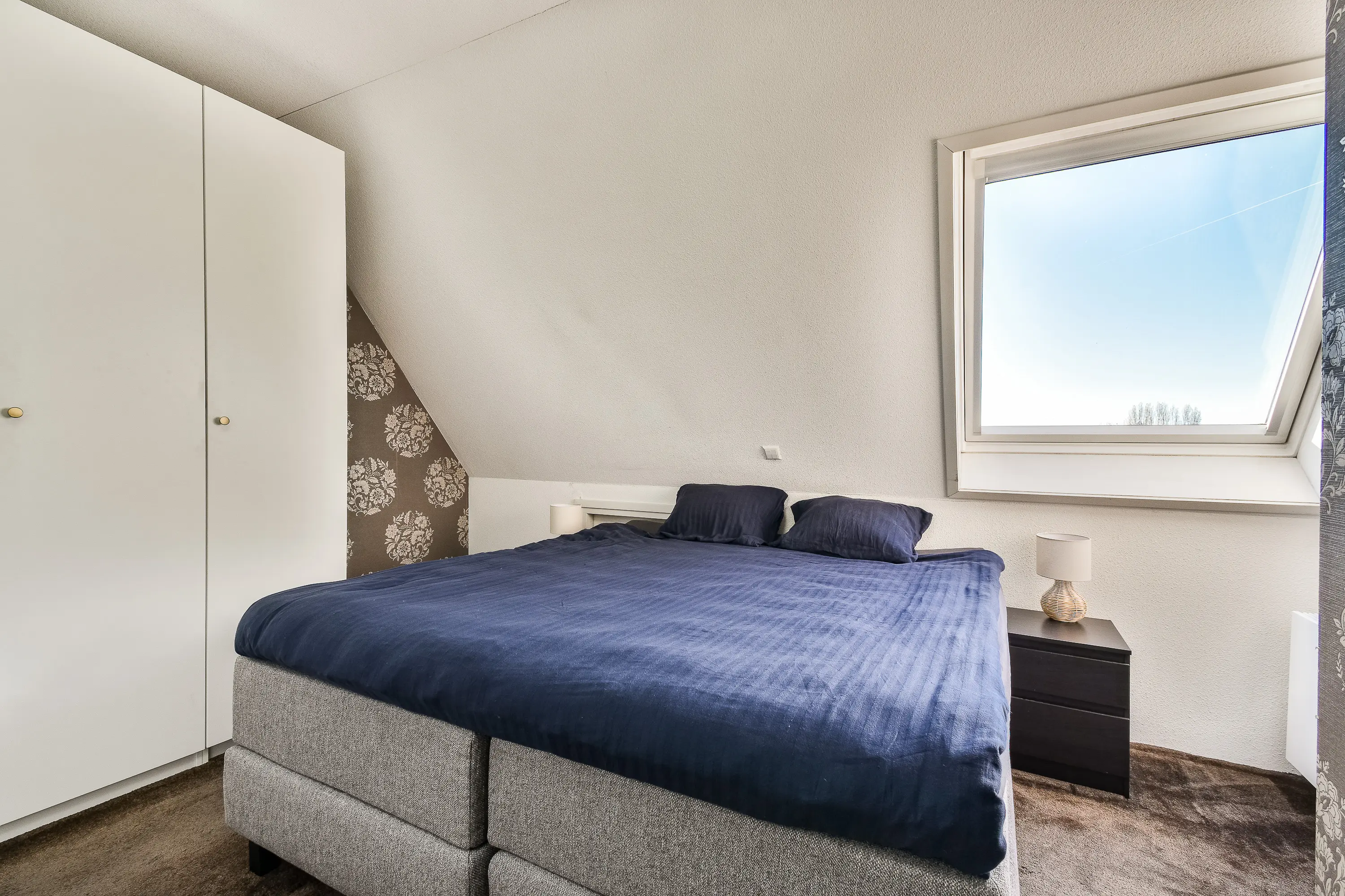 Een comfortabele hoofdslaapkamer met zowel een dakkoepel als een Velux dakraam met zonwering en verduistering. De kamer is slim ingericht met aansluitingen voor televisie en internet, meerdere elektrapunten en verlichting die zowel bij de deur als vanaf het bed te bedienen is.